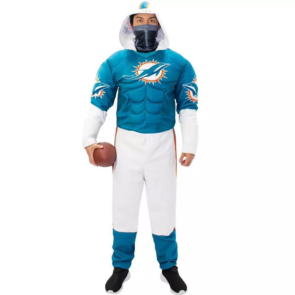 Transform into a Miami Dolphins player with this Game Day costume in team colors. The bodysuit features padded faux muscles, official Miami Dolphins graphics and a zipper closure for easy dressing. Plus, polyester material creates a soft feel for hours of comfortable wearing. Other Sports Fan Shop