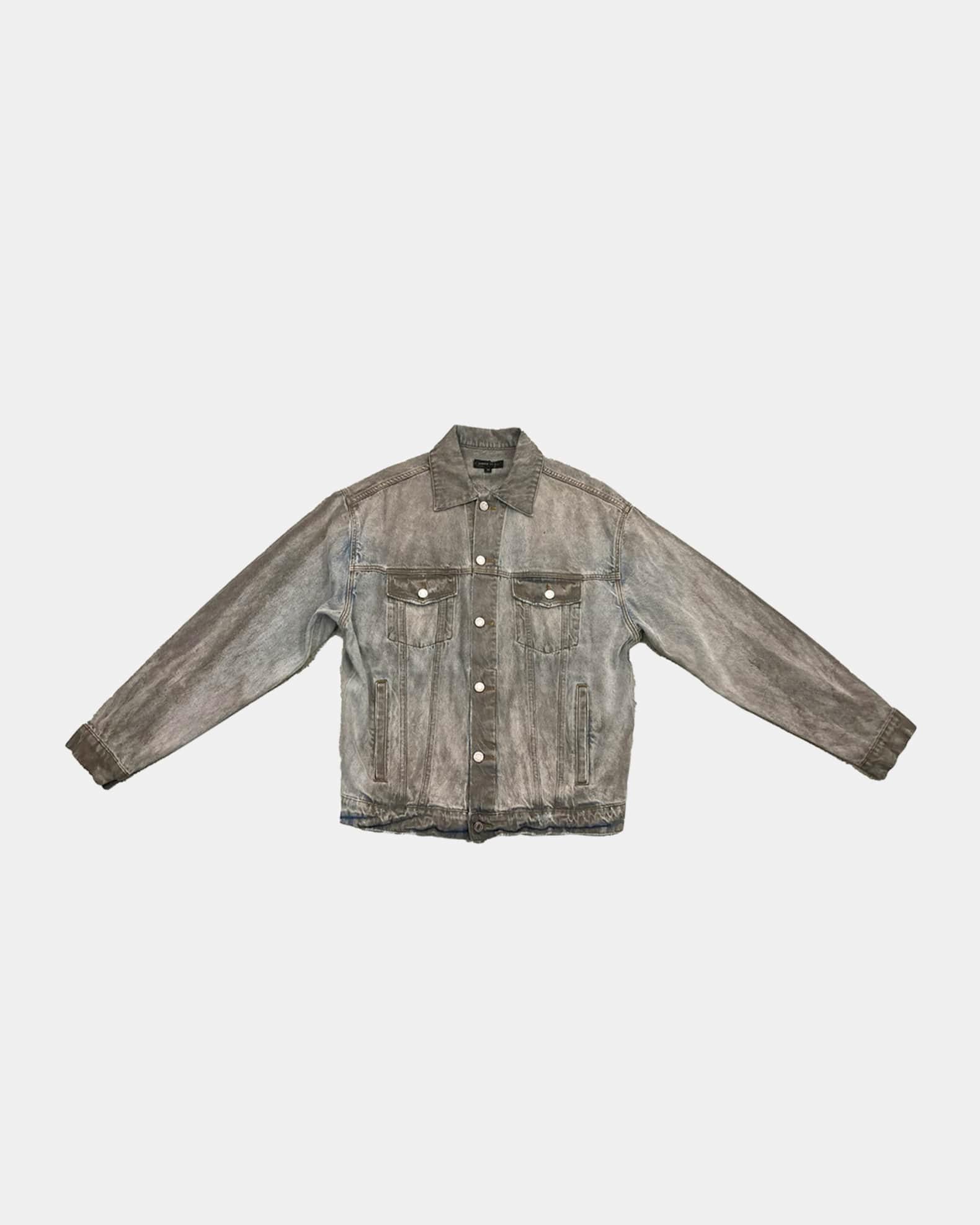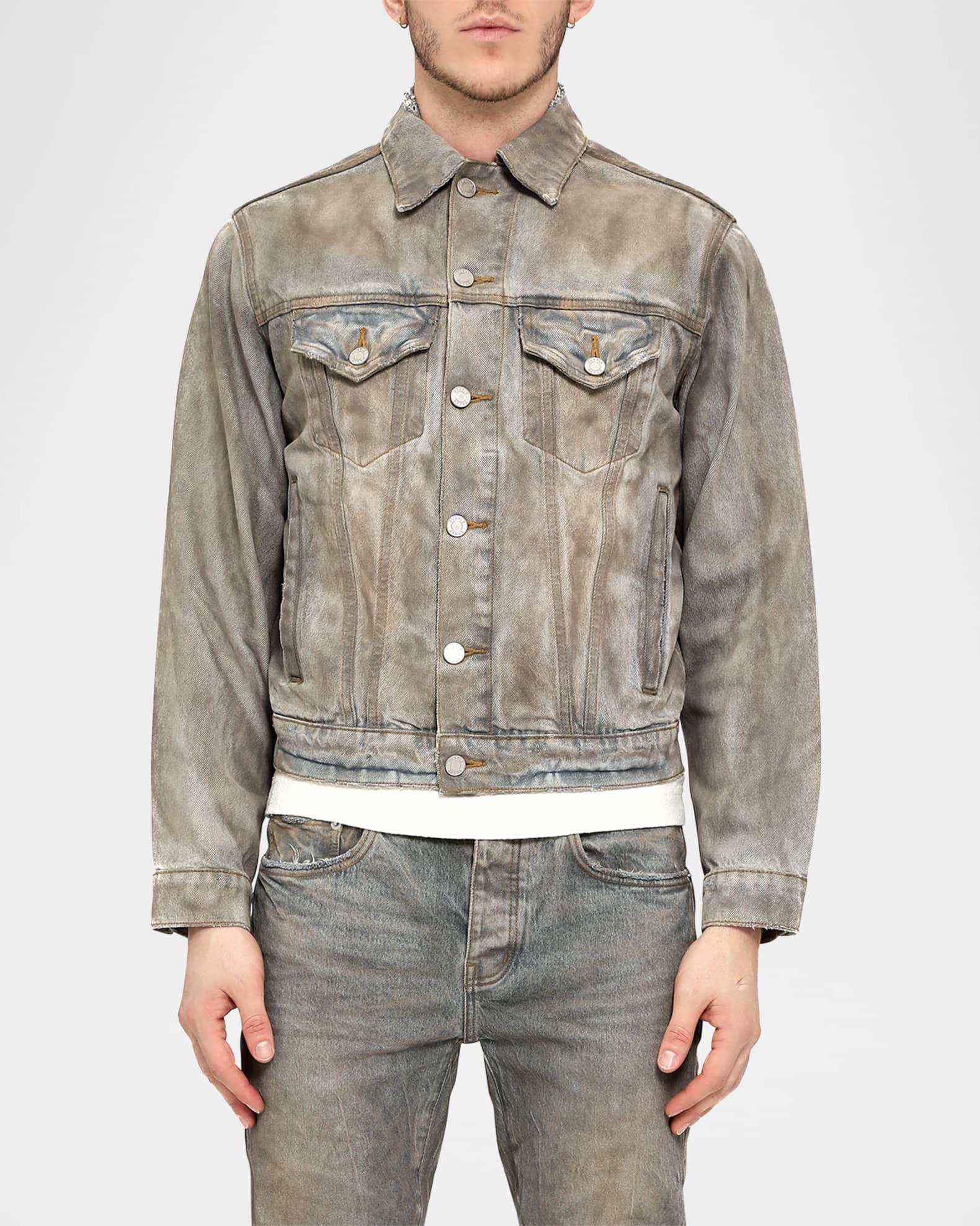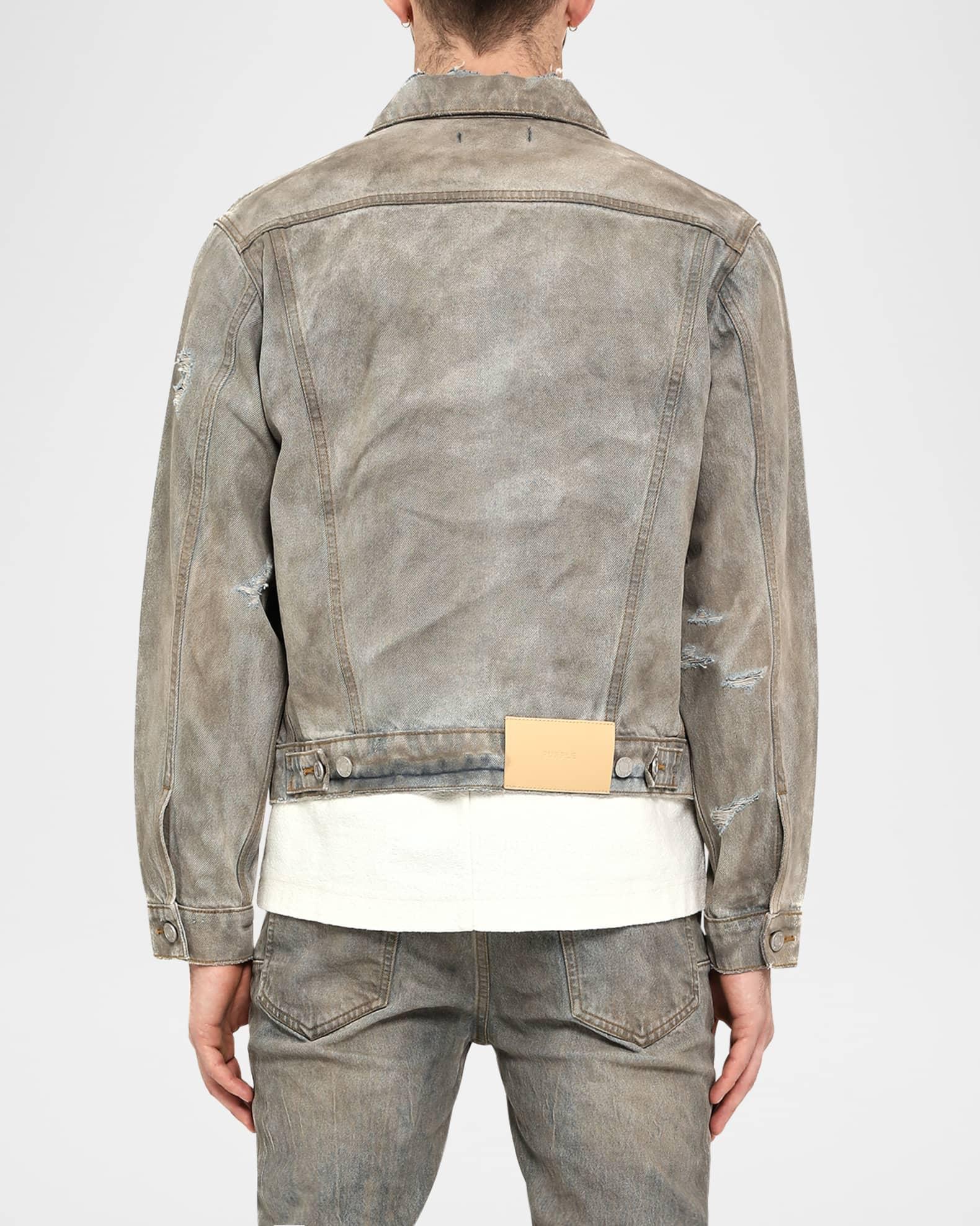 A dirty effect and slight distress on the denim accentuate a worn feel for this short jean jacket by PURPLE. Point collar Metal button front Button/flap pockets on the chest Side slip pockets Short length Adjustable cuffs and hem Signature label on the back Cotton Machine wash cold Imported