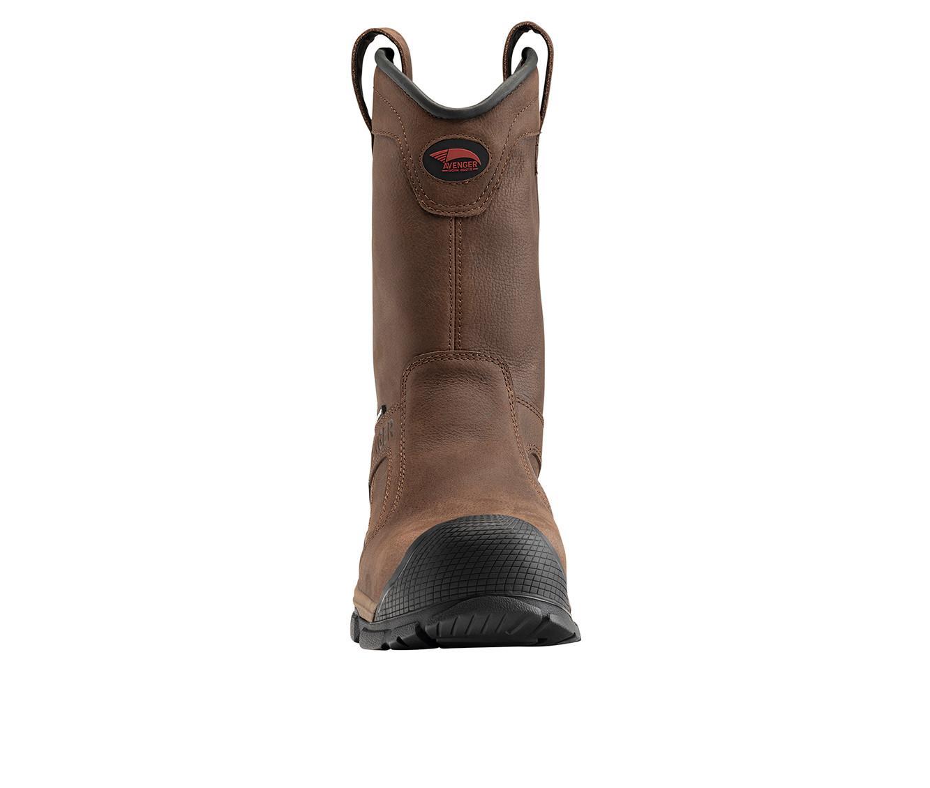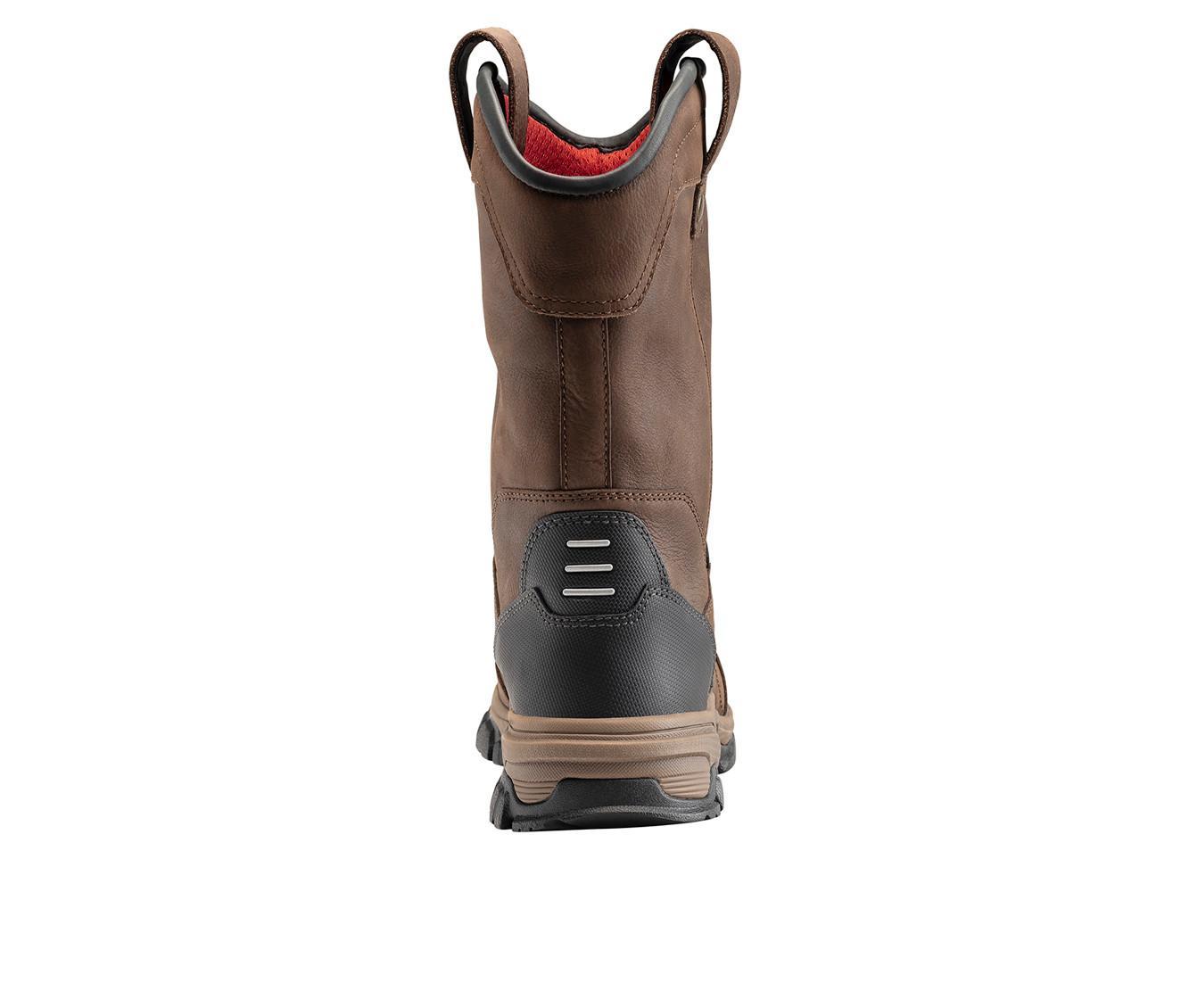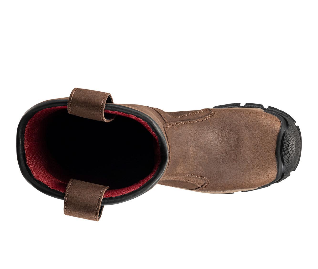 This pull-on work boot features a rugged leather upper with reinforced stitching and overlay panels for added durability. Dual side loops at the collar make it easy to put on, while the high shaft provides extended coverage and protection. The outsole is built with a deeply treaded pattern for solid traction in demanding environments, and the interior is softly lined for comfort during long shifts.