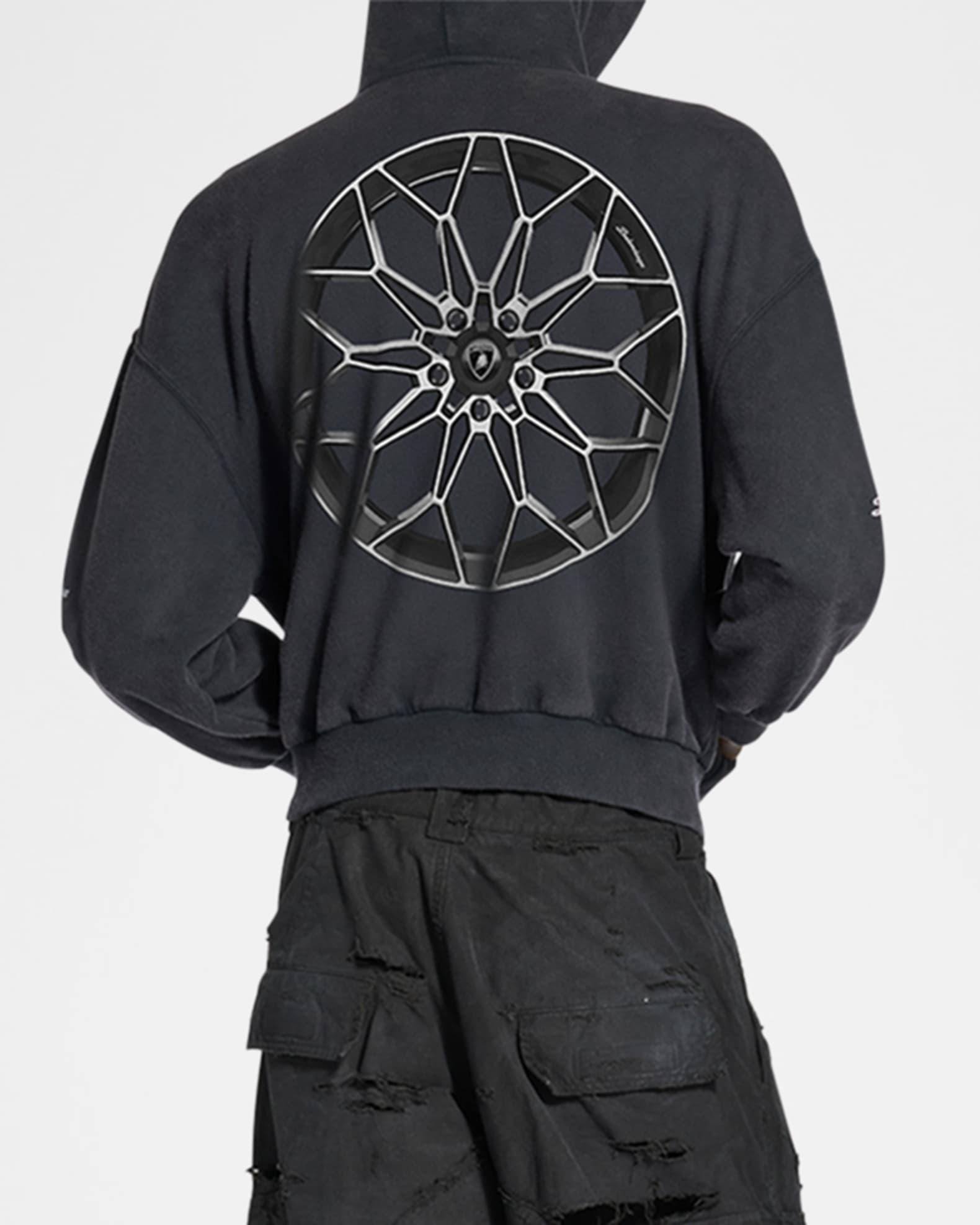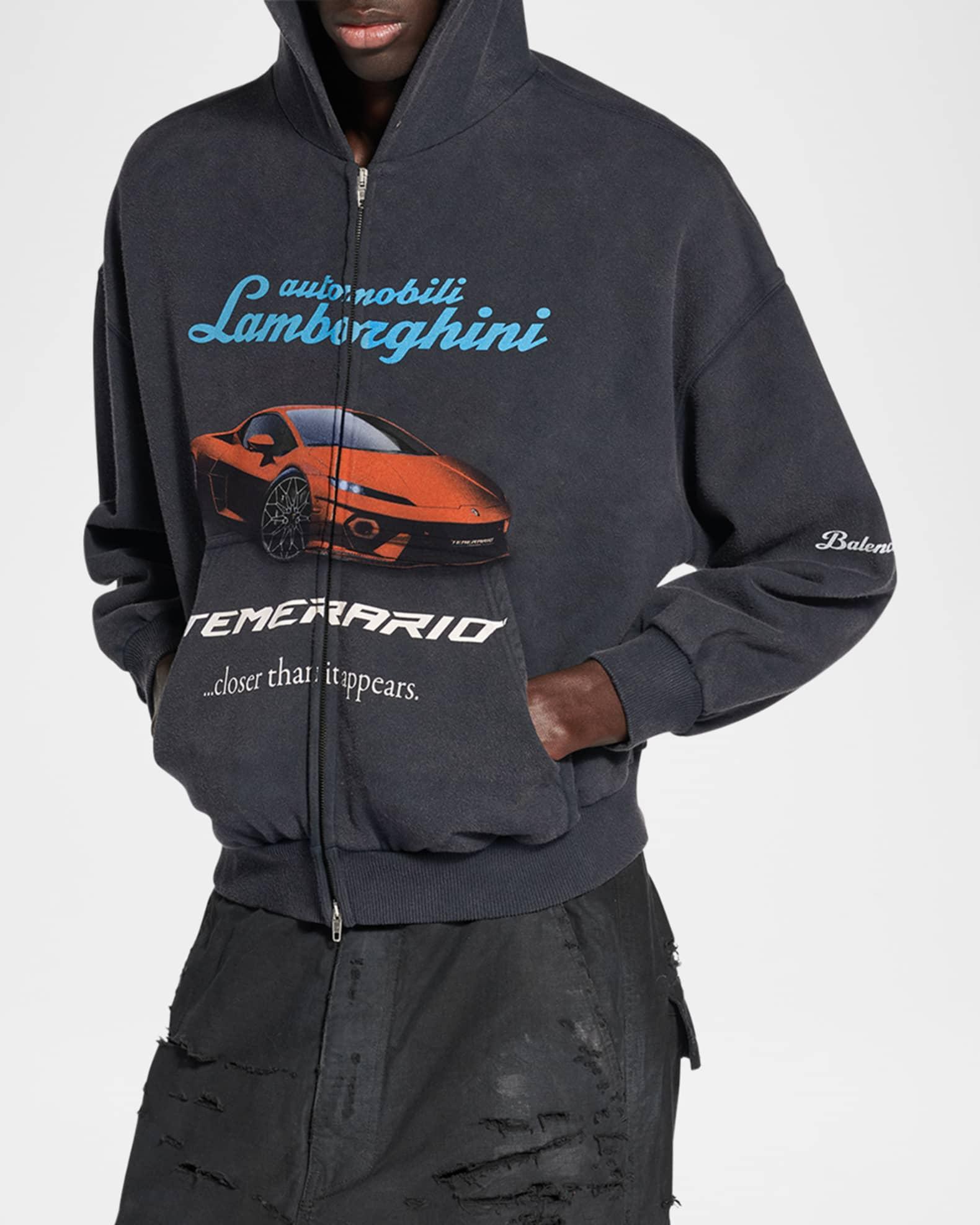 Balenciaga x Automobili Lamborghini retro-style hoodie in faded cotton terry showcasing the 2025 Lamborghini Temerario Hooded neckline; two-way zip front Long sleeves with Balencia logo lettering on the sleeve Kangaroo pockets Cotton Made in Portugal