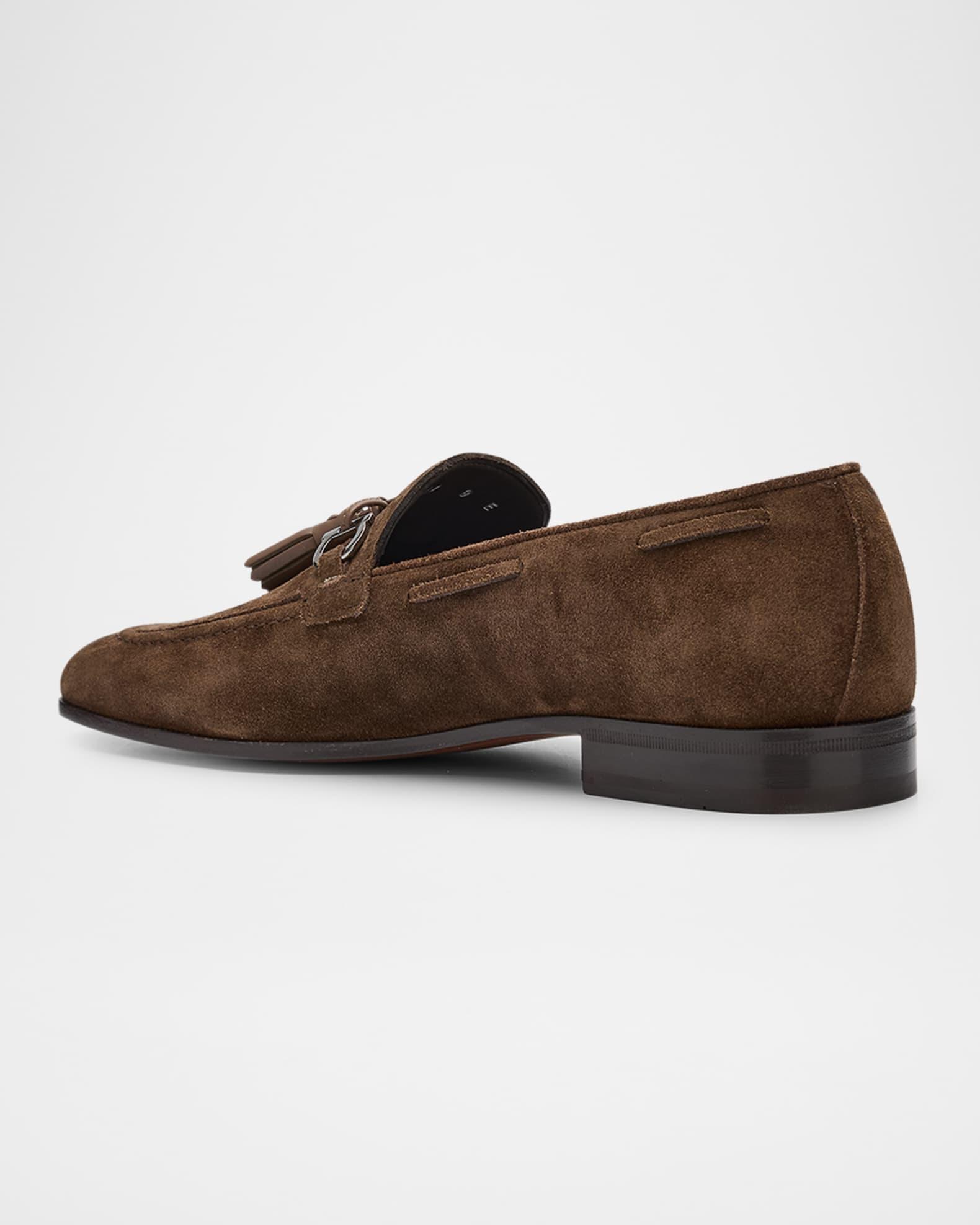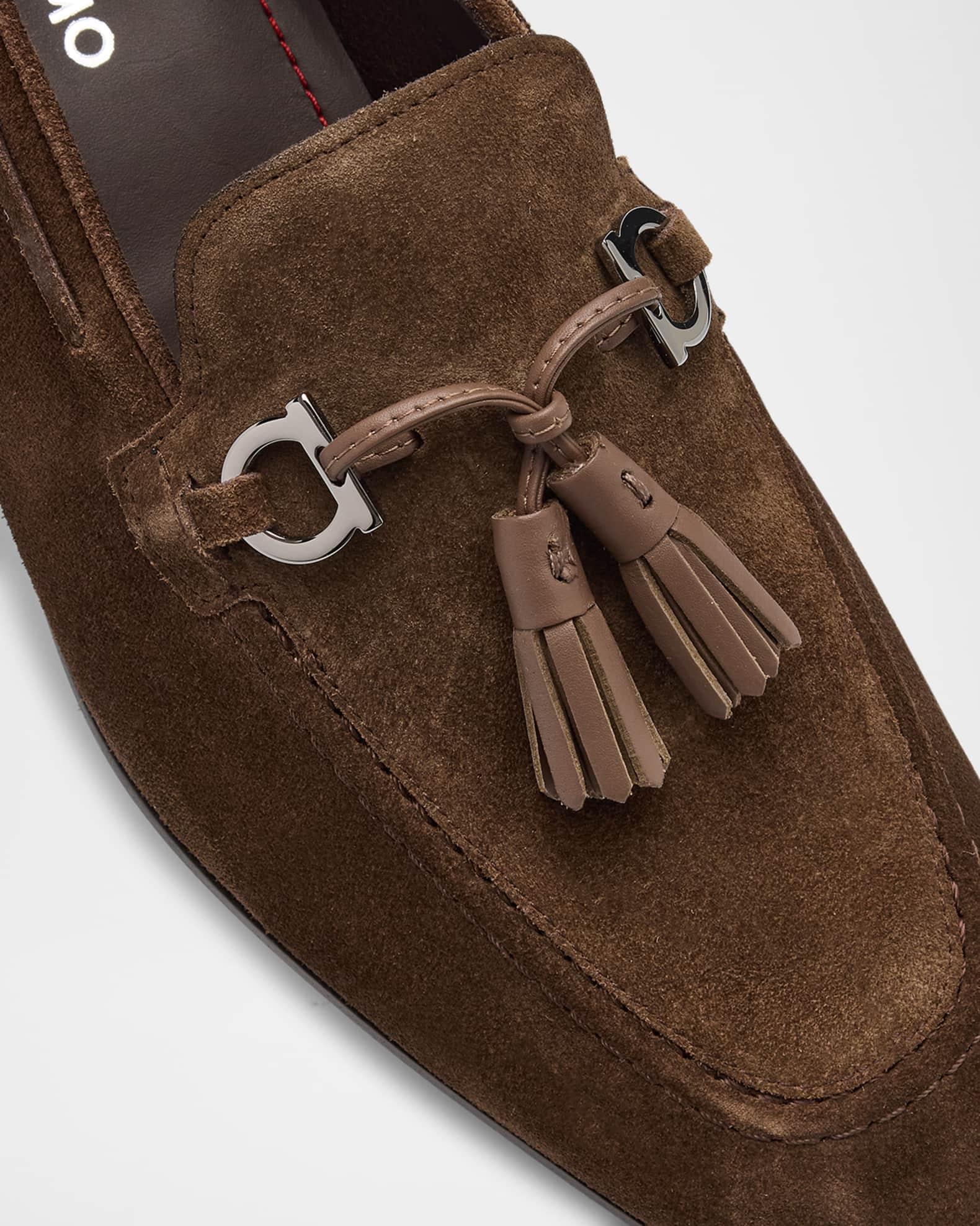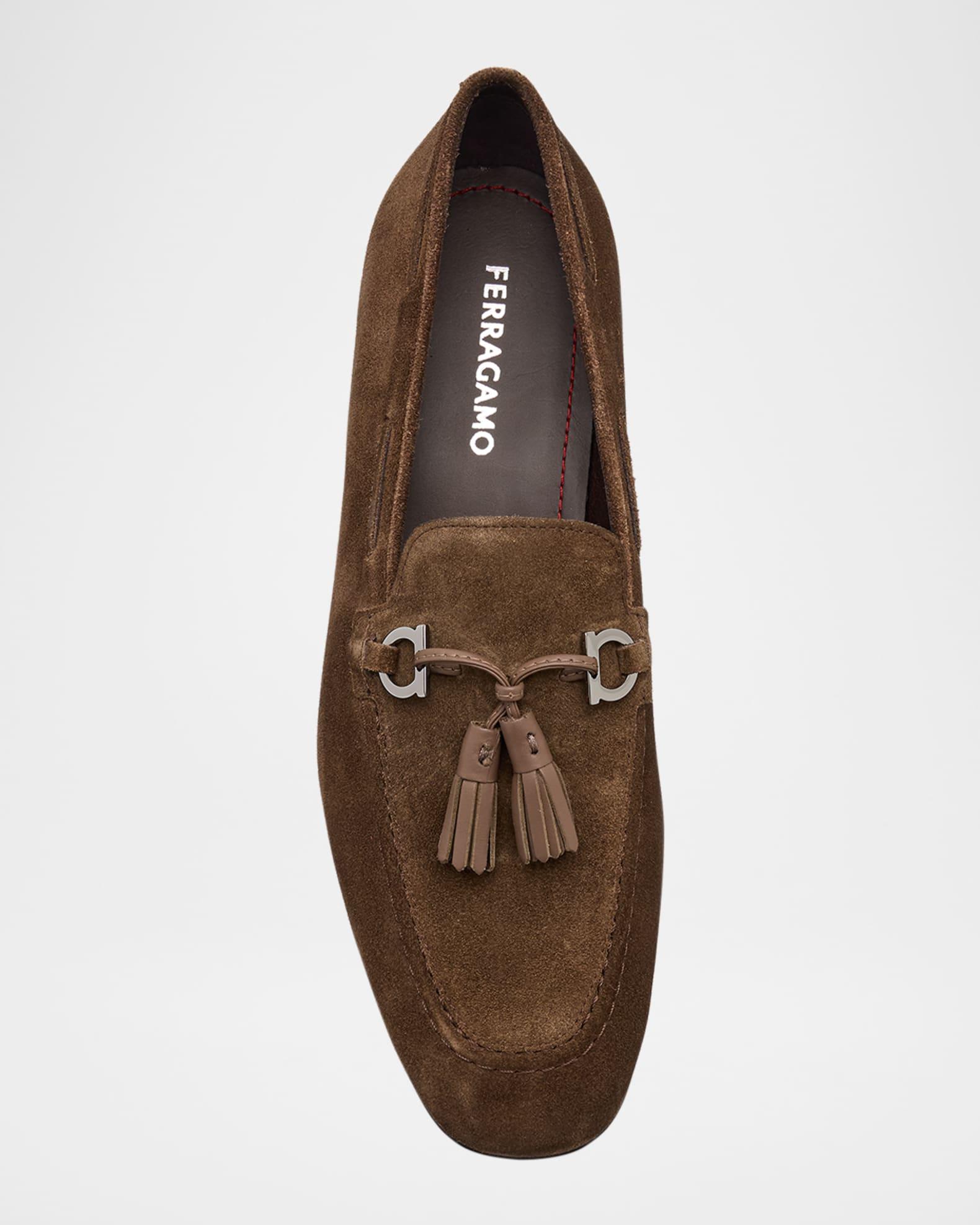 Ferragamo "Basilea 2" loafers in suede with raised stitching around the vamp Stacked heel Round apron toe Gancini bit hardware with leather tassels Leather lining Custom leather outsole Slip-on style Professional cleaning recommended Made in Italy