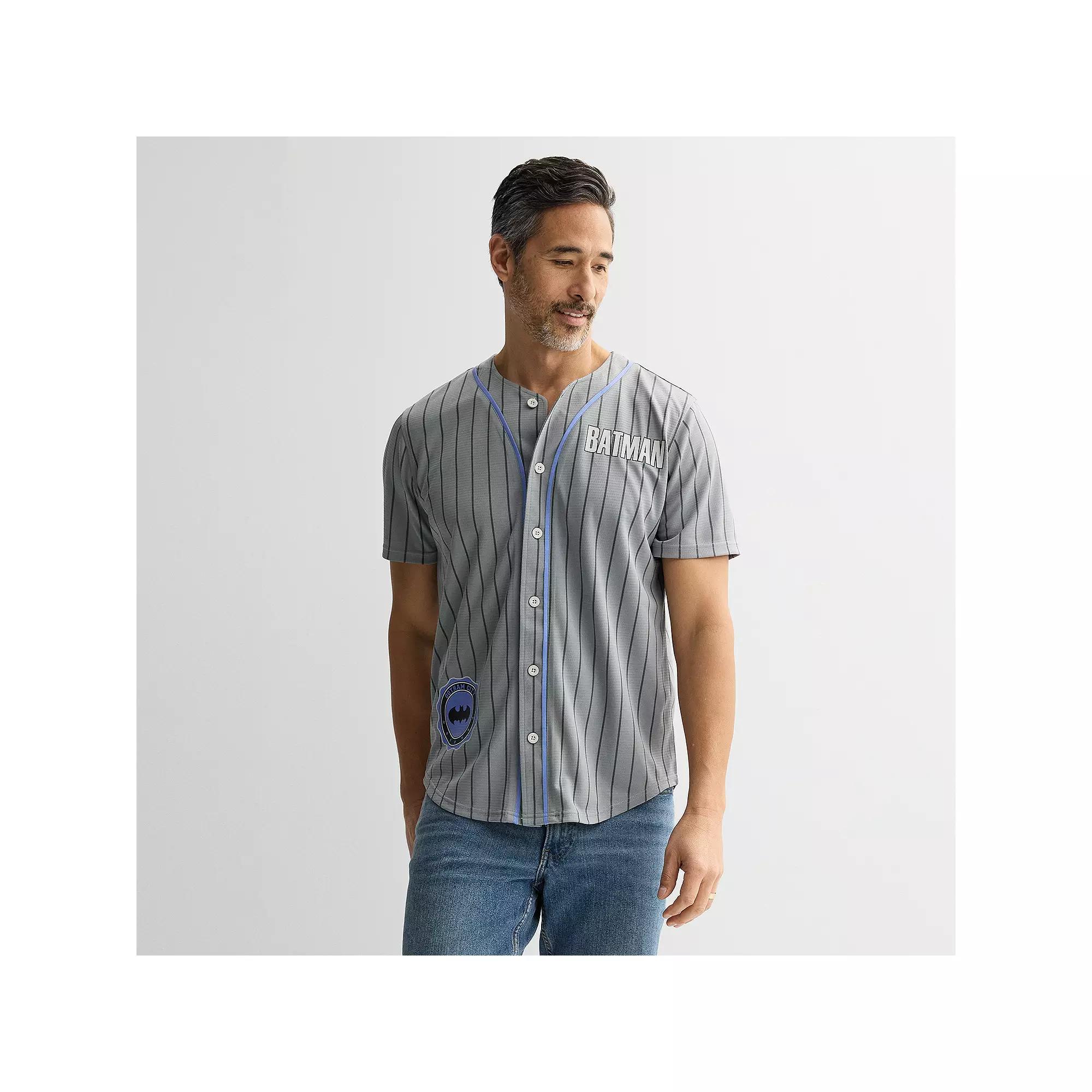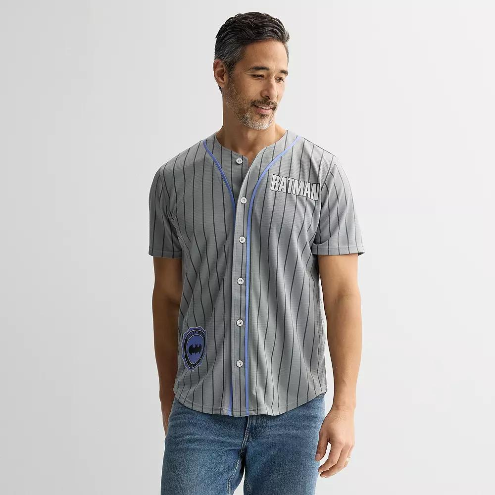 Show your love for your favorite superhero with this stylish Mens Batman Pinstriped Graphic Baseball Jersey. Show your love for your favorite superhero with this stylish Mens Batman Pinstriped Graphic Baseball Jersey. FEATURES Crewneck Short sleeves Button front Shirttail hemFABRIC & CARE Polyester Machine wash Imported Color: Grey. Gender: male. Age Group: adult.