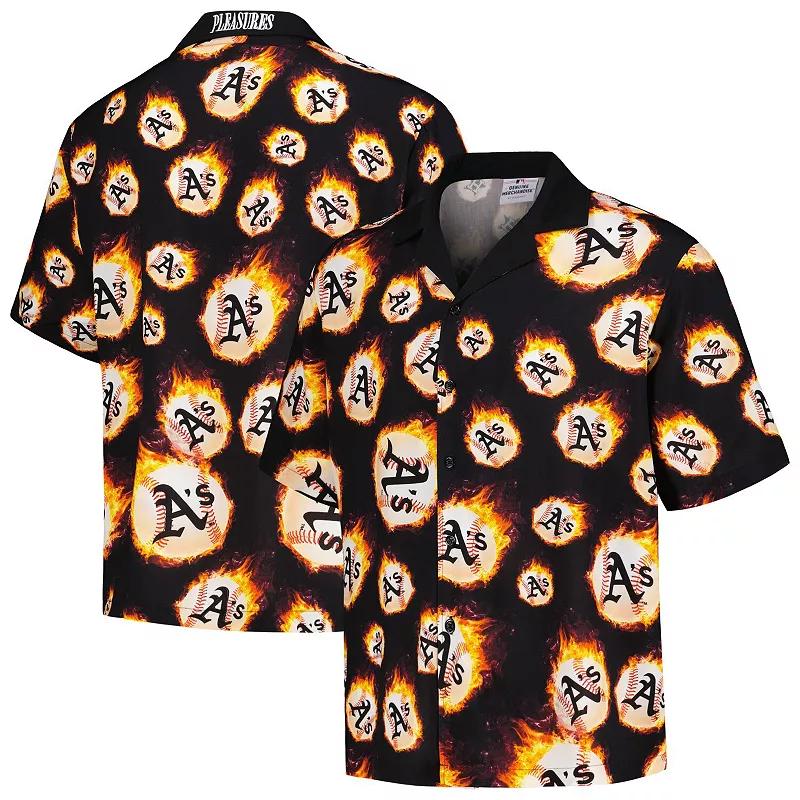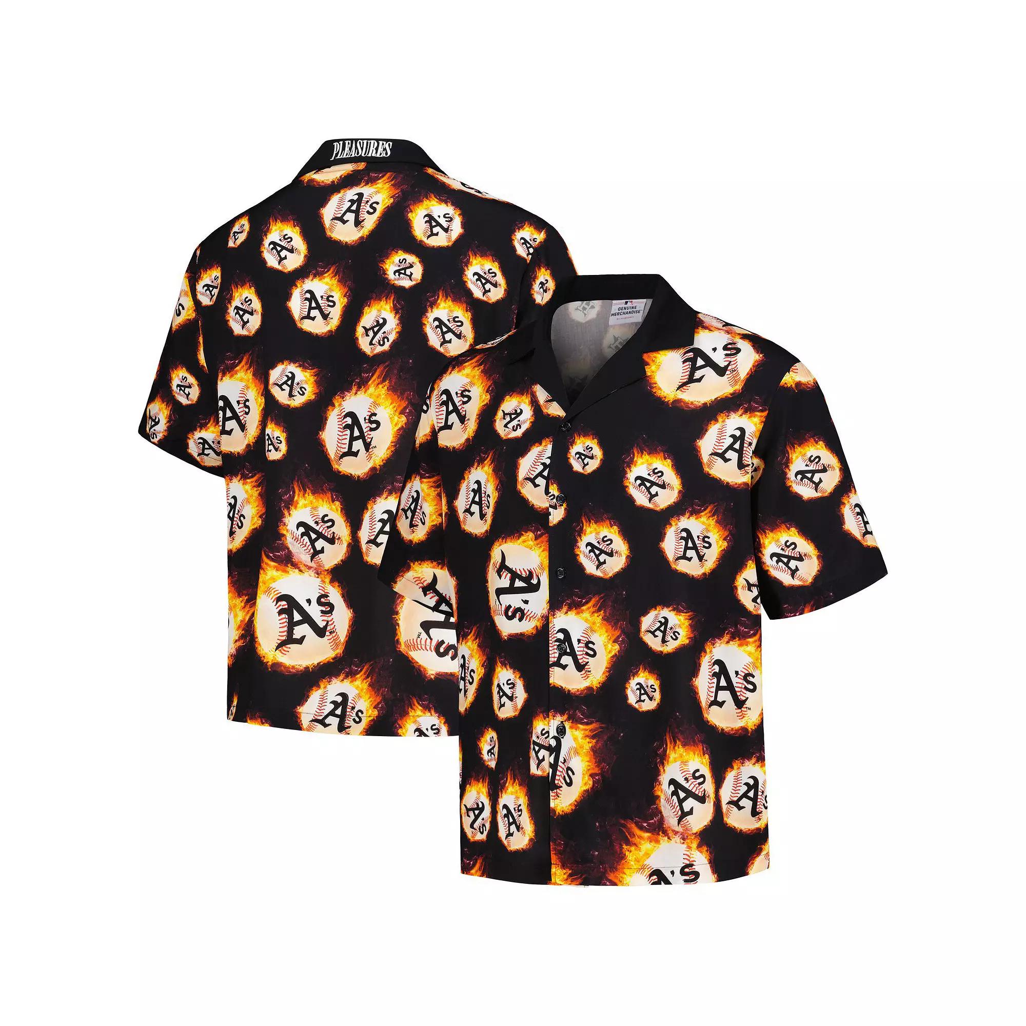 Add a fiery fan finish to any outfit with this Oakland Athletics Flame Fireball shirt. It features bold team graphics over a comfortable design. In the stands, at the grill or on the couch, cheer on the Oakland Athletics with this eye-catching button-up shirt.Add a fiery fan finish to any outfit with this Oakland Athletics Flame Fireball shirt. It features bold team graphics over a comfortable design. In the stands, at the grill or on the couch, cheer on the Oakland Athletics with this eye-catching button-up shirt.Machine wash, dry flatSublimated graphicsMaterial: 100% RayonBrand: PLEASURESOfficially licensedFull-button frontImportedShort sleeve Size: 2XL. Color: Black. Gender: male. Age Group: adult.