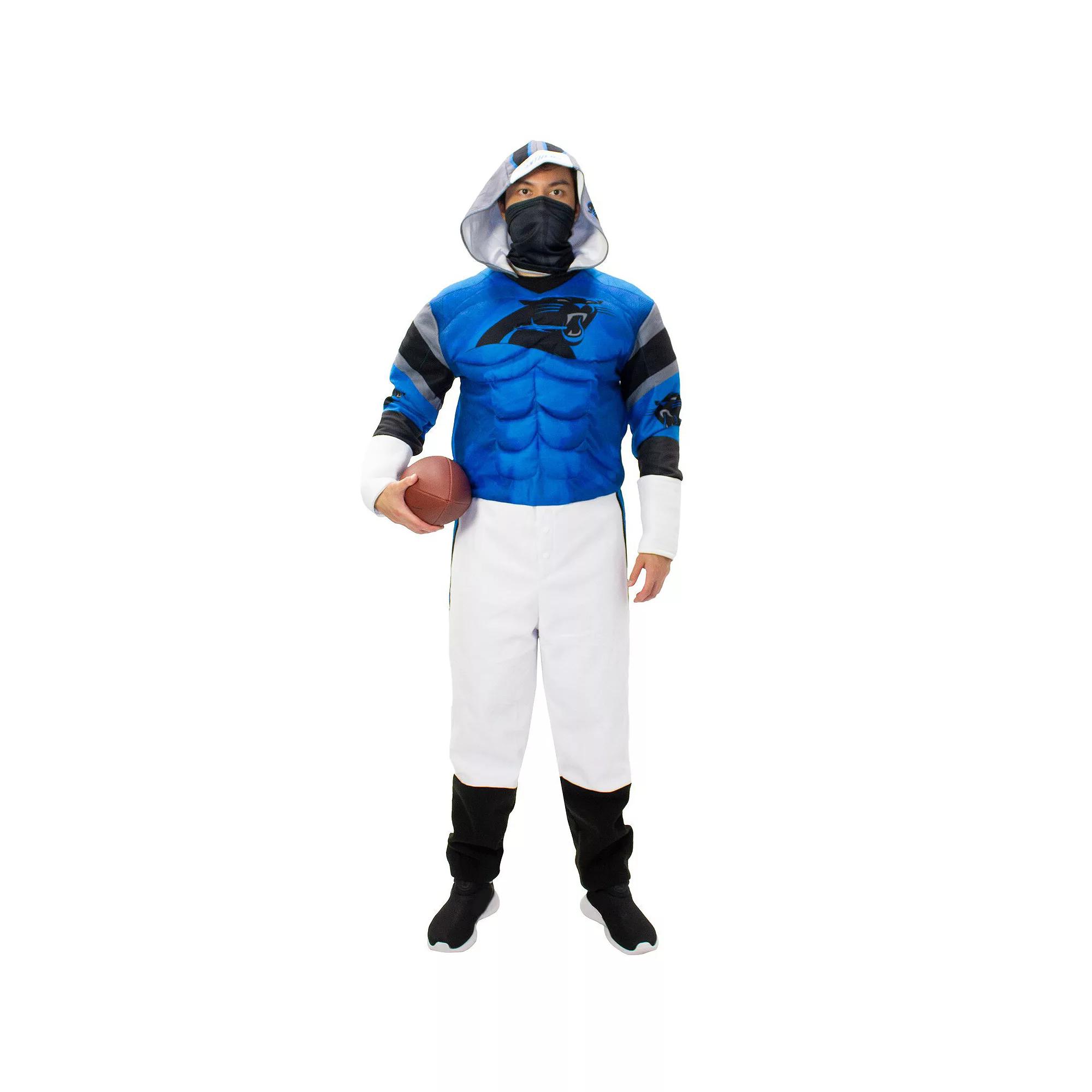 Transform into a Carolina Panthers player with this Game Day costume in team colors. The bodysuit features padded faux muscles, official Carolina Panthers graphics and a zipper closure for easy dressing. Plus, polyester material creates a soft feel for hours of comfortable wearing.Transform into a Carolina Panthers player with this Game Day costume in team colors. The bodysuit features padded faux muscles, official Carolina Panthers graphics and a zipper closure for easy dressing. Plus, polyester material creates a soft feel for hours of comfortable wearing.PRODUCT FEATURESOne center chest pocketFull zippered back closureOfficially licensedWipe clean with a damp clothMaterial: 100% PolyesterThe Face Covering is for personal use only and is not intended for a medical purpose or as a replacement for medical-grade personal protective equipment. It is a fashion face covering not intended to be personal protective equipment and should not be used by healthcare professionals or used in a healthcare/clinical environment or setting. This face covering is not intended to prevent or protect from any form of illness or disease (or otherwise).Padded muscle designV-neckBrand: Jerry LeighTwo lower front snap-buttonsRibbed knit collar & leg cuffsOne zippered side pocketHood w/o drawstringPadded muscle detailsImported Color: Blue. Gender: male. Age Group: adult. Material: Cotton.