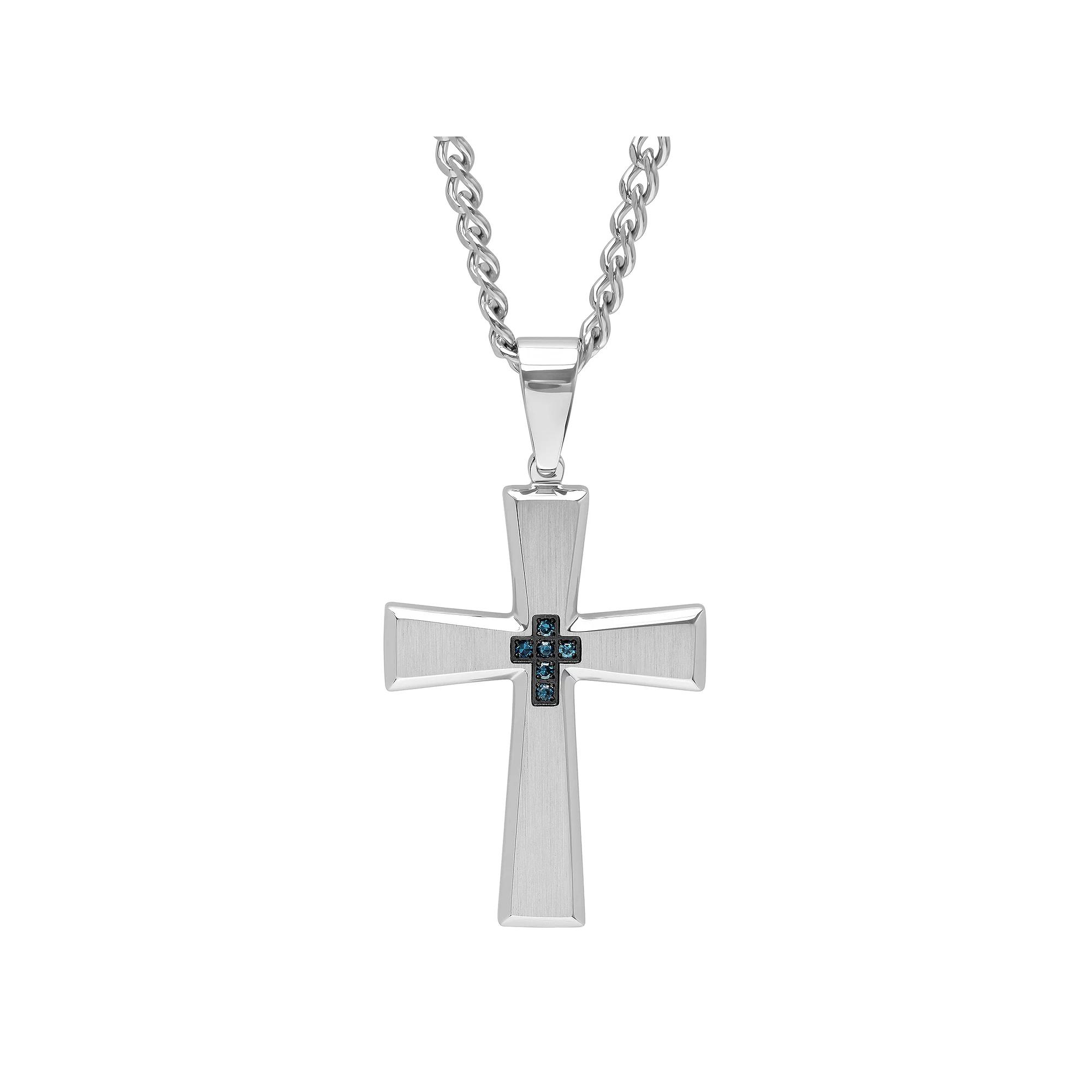 Show the strength of your faith with this gorgeous blue diamond cross pendant necklace. Show the strength of your faith with this gorgeous blue diamond cross pendant necklace. Watch the product video here. Pendant size: 1.7 in. x 0.9 in. Length: 24 in. Clasp: lobster claw Chain type: curb Metal: stainless steel Finish: satin Packaging: velvety pouchDIAMOND DETAILS Total weight: less than 1/10 ct. Shape: round Setting: prong Diamond weights are approximate. Diamond total weights may vary between .01 and .08 ct. Some diamonds have fewer than 17 facets. Image(s) may be enlarged to show detail. Please note, due to the high value of this item, a signature may be required upon delivery. Gemstones may have been treated to enhance their appearance. Special care may be required. Please visit our Gemstone Treatment & Special Care Guide for more information. Size: 24. Gender: male. Age Group: adult.