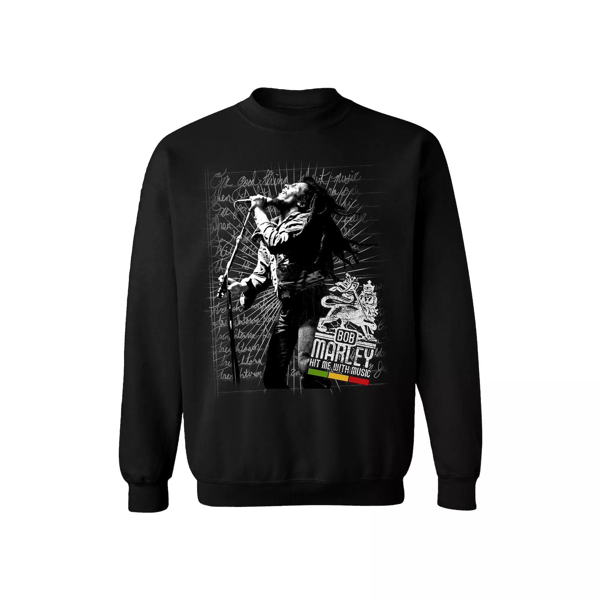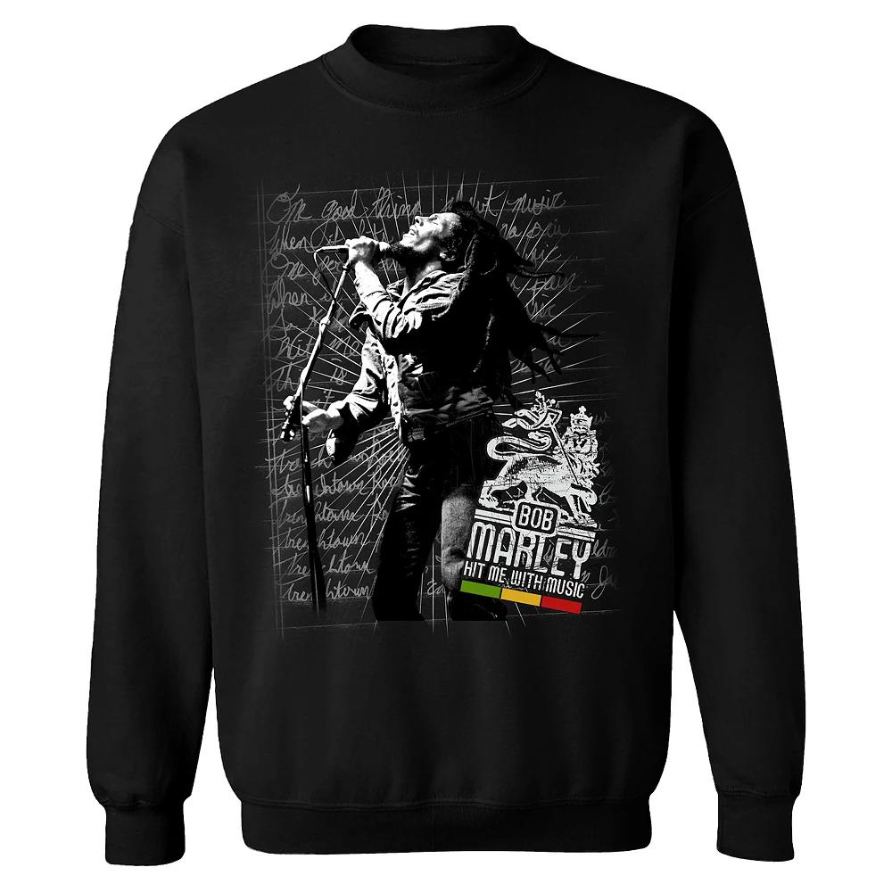 You wont worry about a thing in this Bob Marley graphic sweatshirt. You wont worry about a thing in this Bob Marley graphic sweatshirt. Crewneck Long sleevesFABRIC & CARE Cotton, polyester Machine wash Imported Color: Black. Gender: male. Age Group: adult. Material: Cotton Blend.