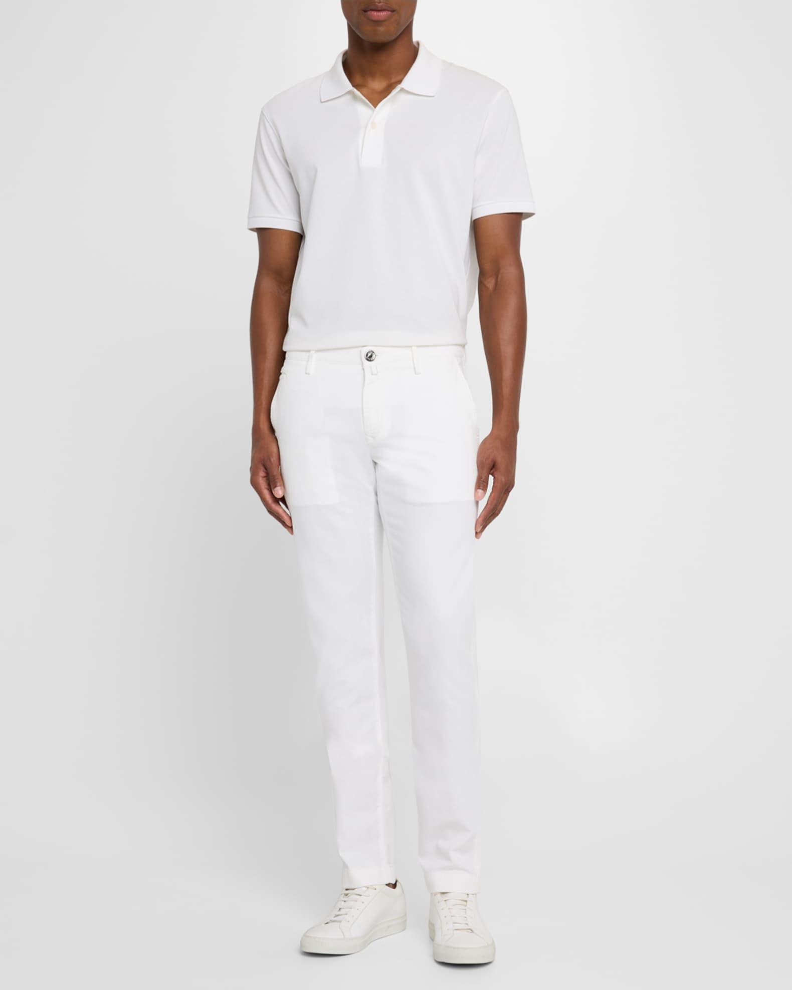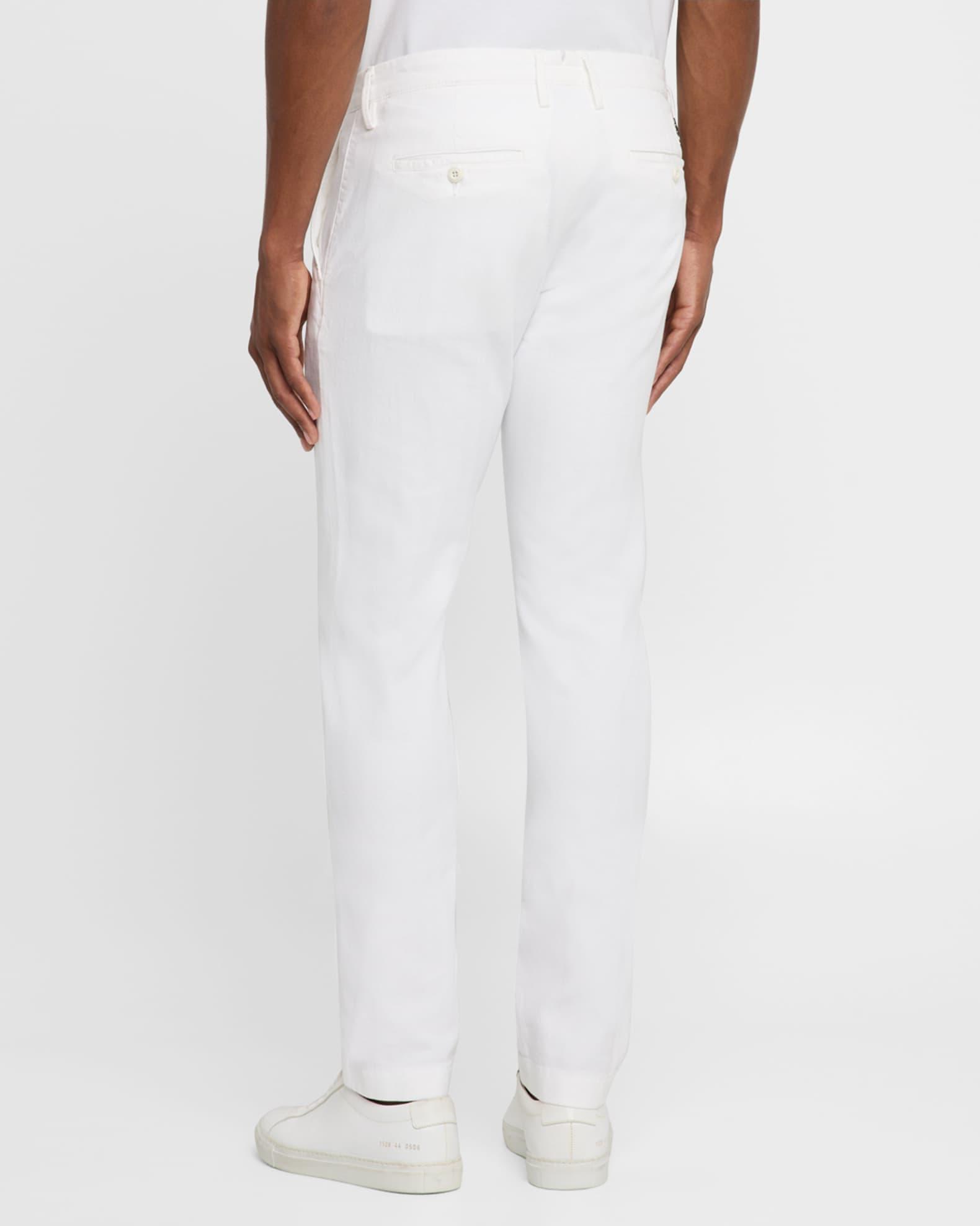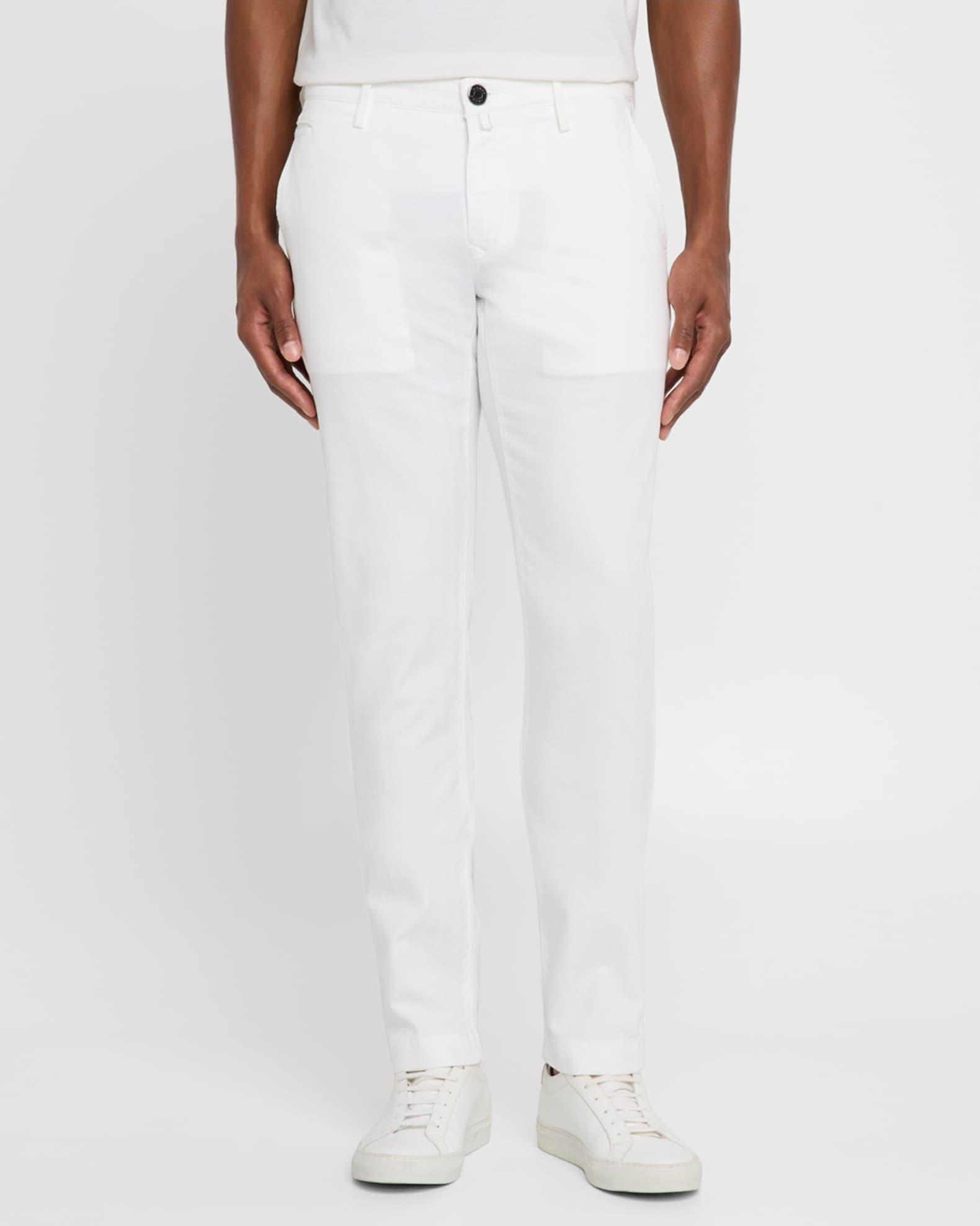 Cut from garment-dyed cotton stretch chino, Jacob Cohen "Bobby" pants feature a subtle chevron motif that adds texture and depth Low rise sits on the hip Slim legs Embroidered with the style name and the founder's quote on the internal placket. Cone-shaped button with central lowering and engraved logo Suede back patch with nickel-finish metal logo Full length Linen/cotton/elastane Machine wash Made in Italy