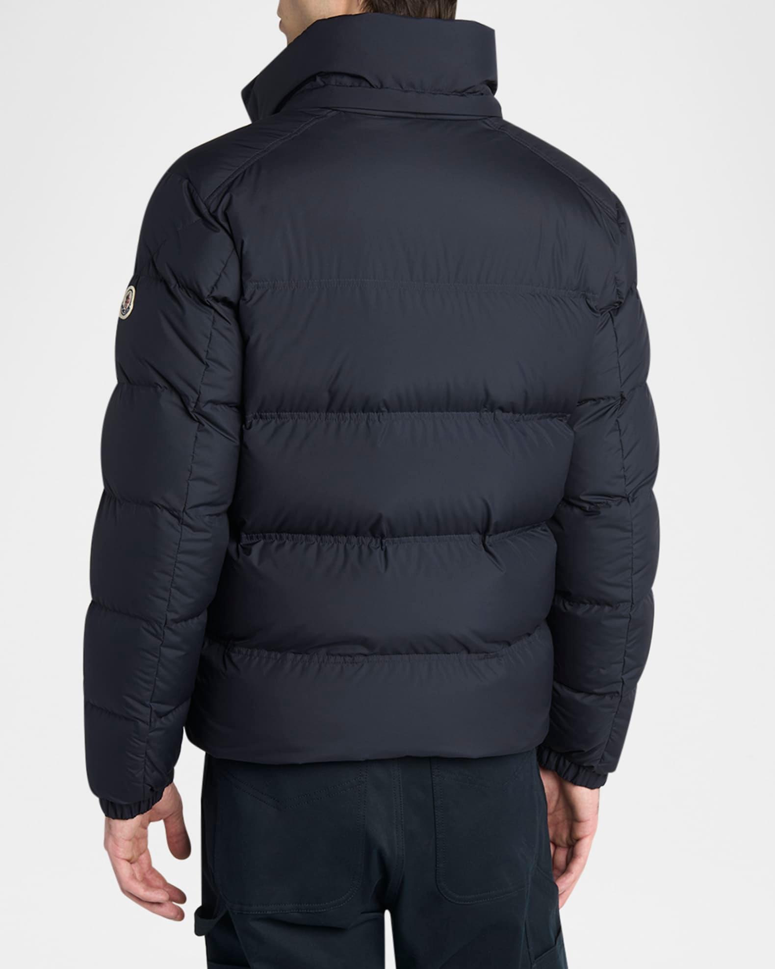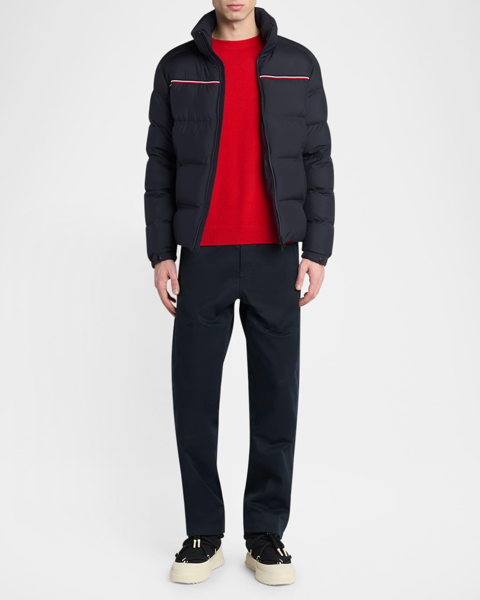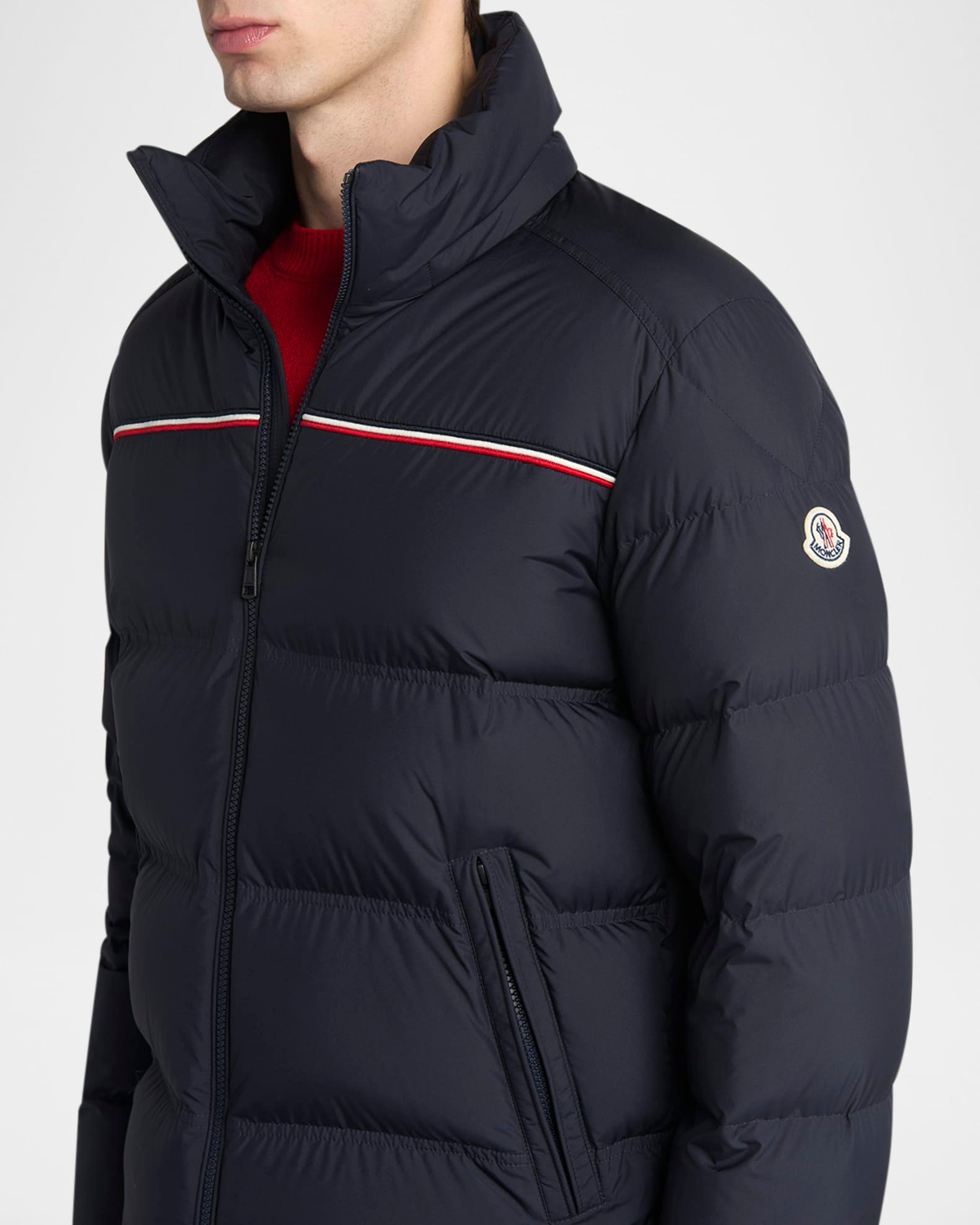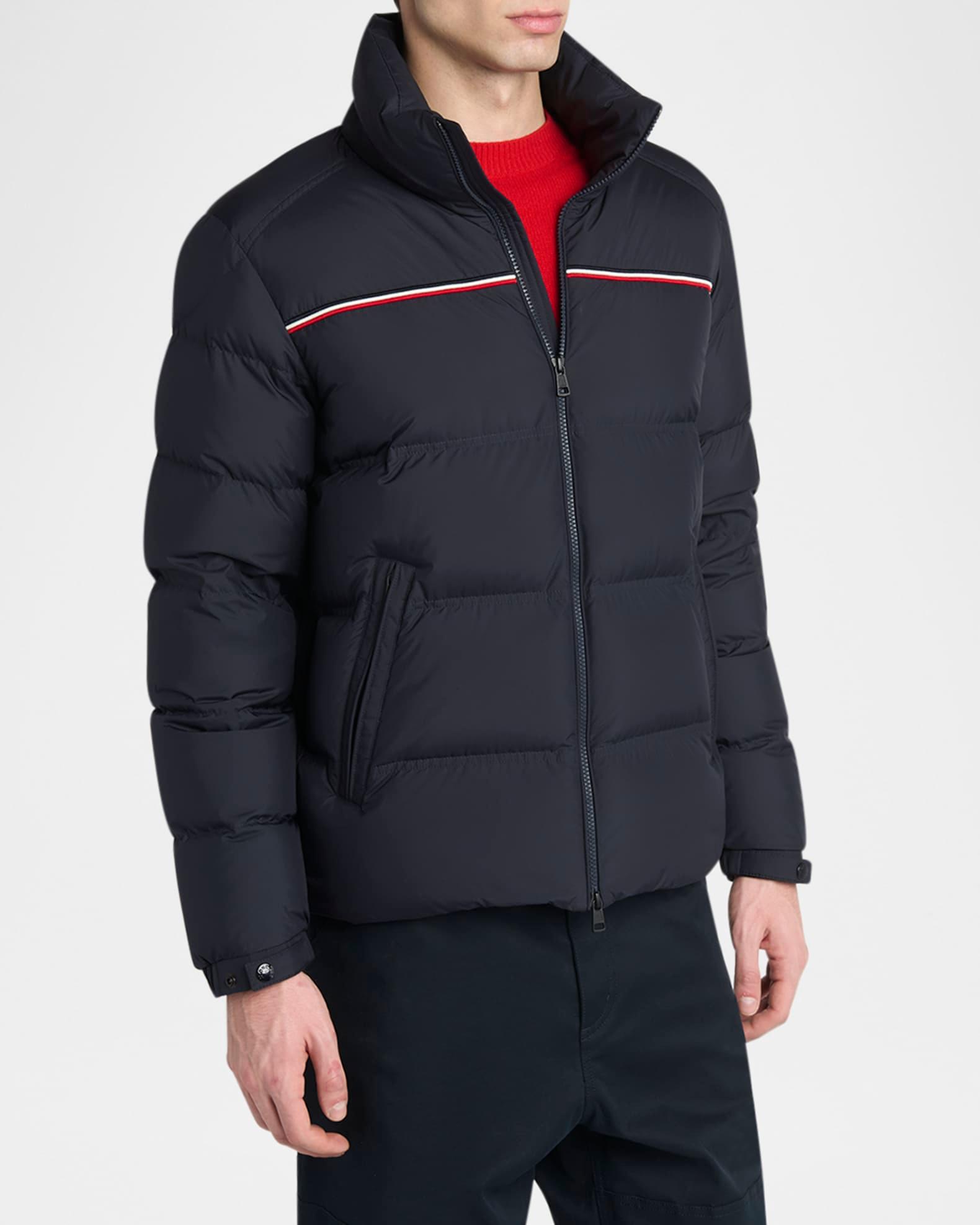 Moncler quilted jacket with premium down/feather fill for premium warmth Tricolor stripe trim across the chest Stand collar Two-way zip front Side zip pockets Long sleeves Logo emblem on the left sleeve Elasticized cuffs Polyester Professional cleaning recommended Imported