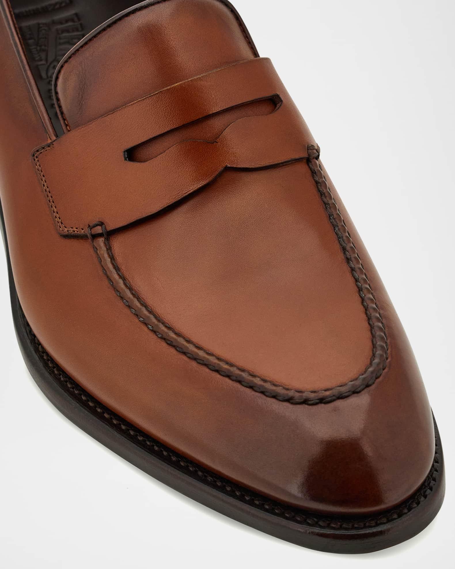 Ferragamo "Brandy" penny loafers made from calf leather artisanally treated to create a rich patina Tramezza construction involves over 160 meticulous steps and six hours of work to achieve an impeccable fit that molds to the wearer's foot Stacked heel Sleek, elongated toe with handcrafted double seam Penny keeper strap Leather lining Branded footbed Leather sole with stitch reinforcement Slip-on style Made in Italy