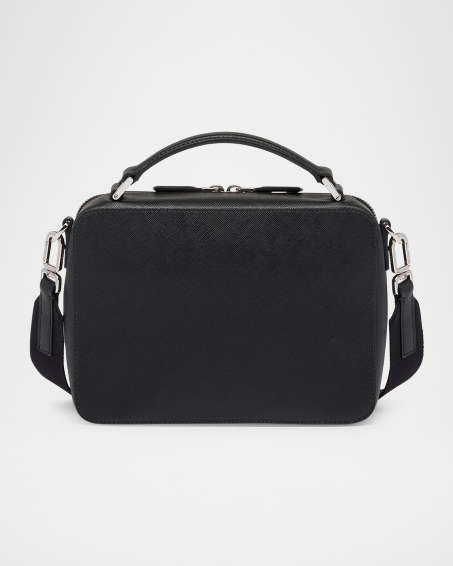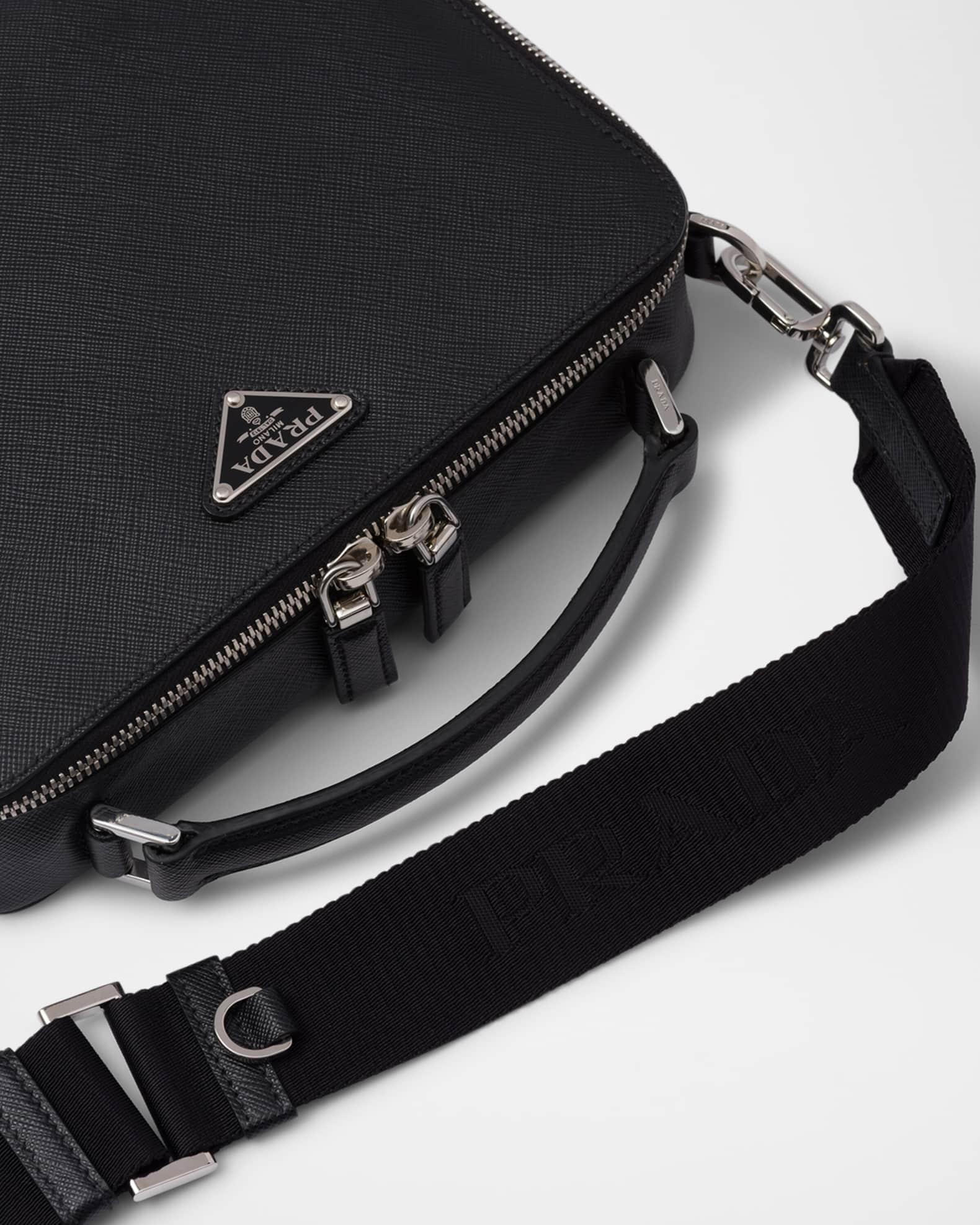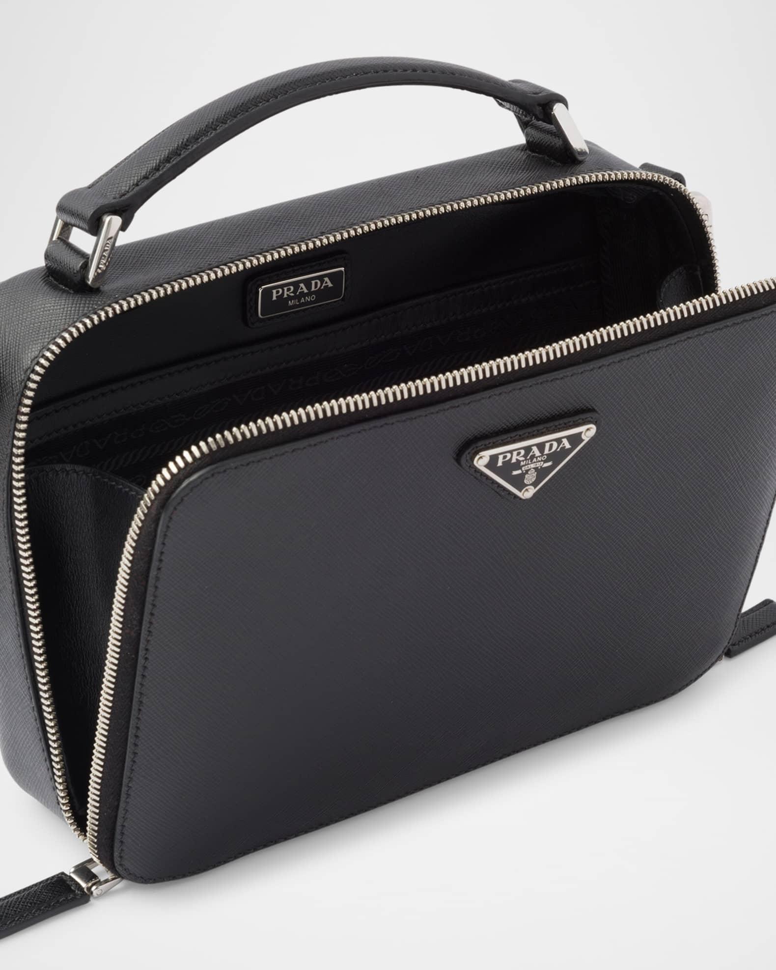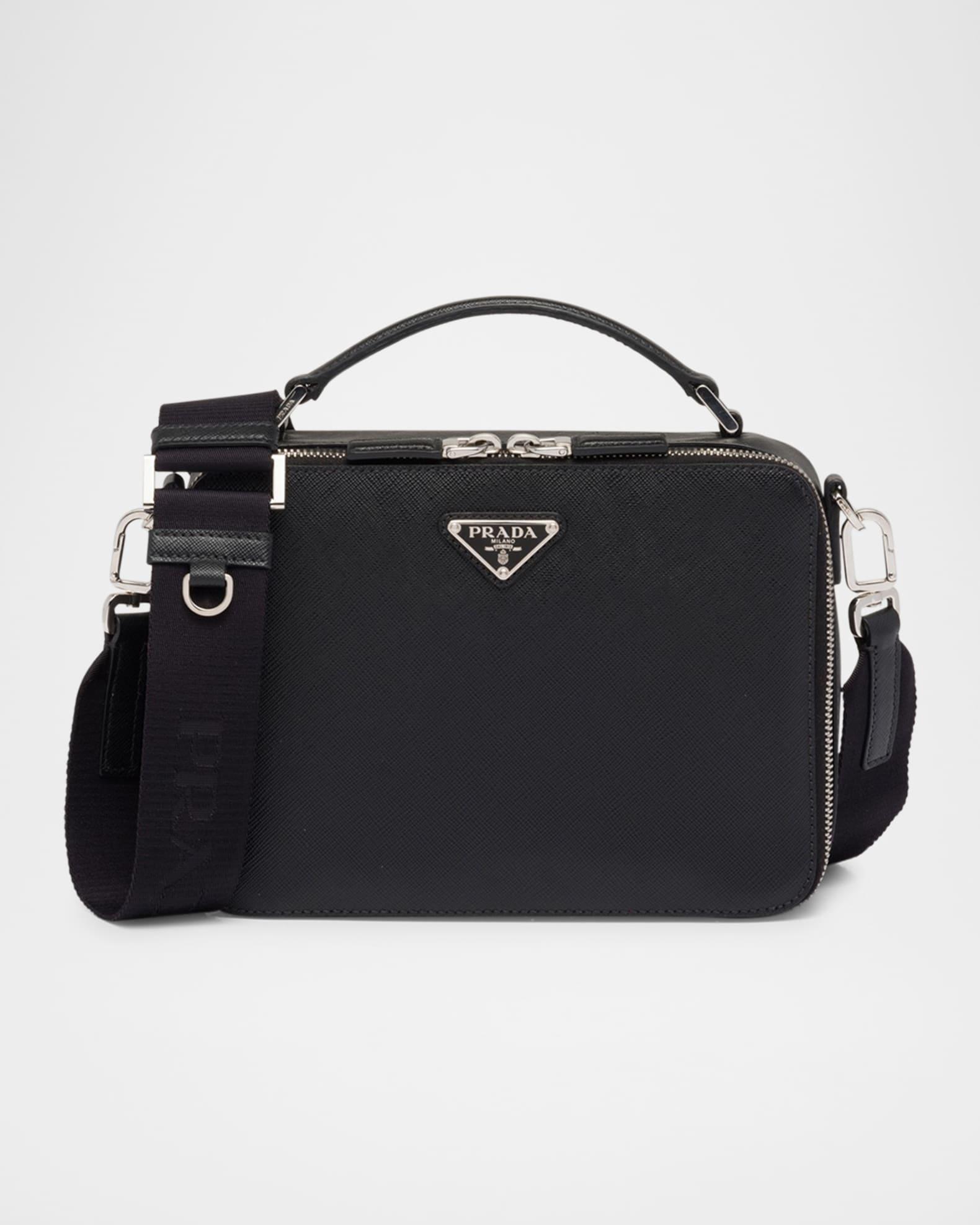 Prada crossbody bag in iconic saffiano calf leather features the signature enameled metal triangle logo on the front Flat leather top handle Adjustable, detachable woven nylon/leather shoulder strap D-ring on the shoulder strap for keychains Dual zip-around closure Interior slip pocket Logo-print nylon lining Approx. 6.3"H x 8.7"W x 2.4"D Imported