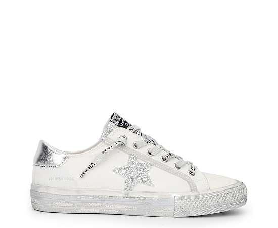 Feel Alive in Vintage Havanas white canvas sneaker with its sliver matte glitter star and shimmer back. This canvas retro sneaker may be this seasons it sneaker.