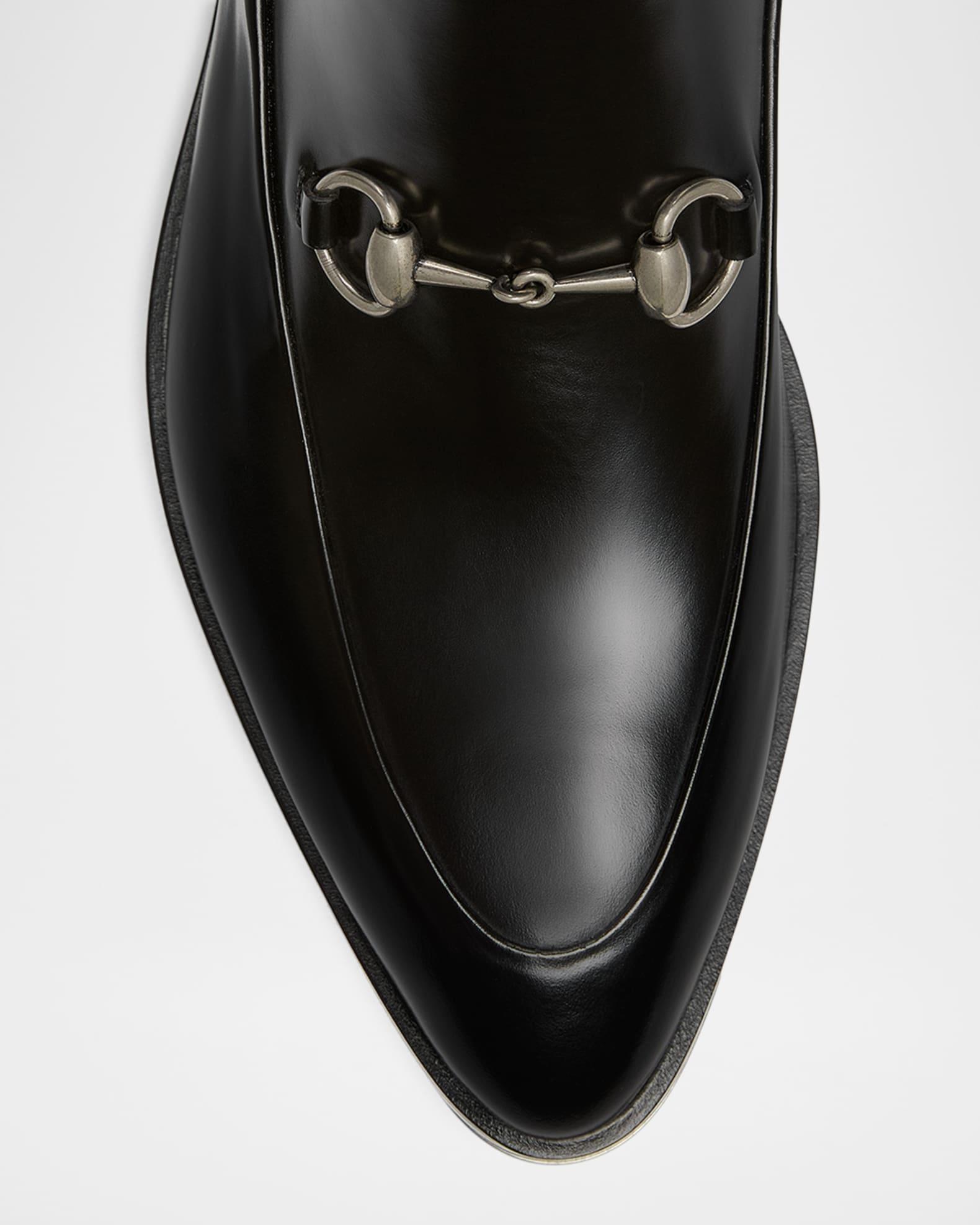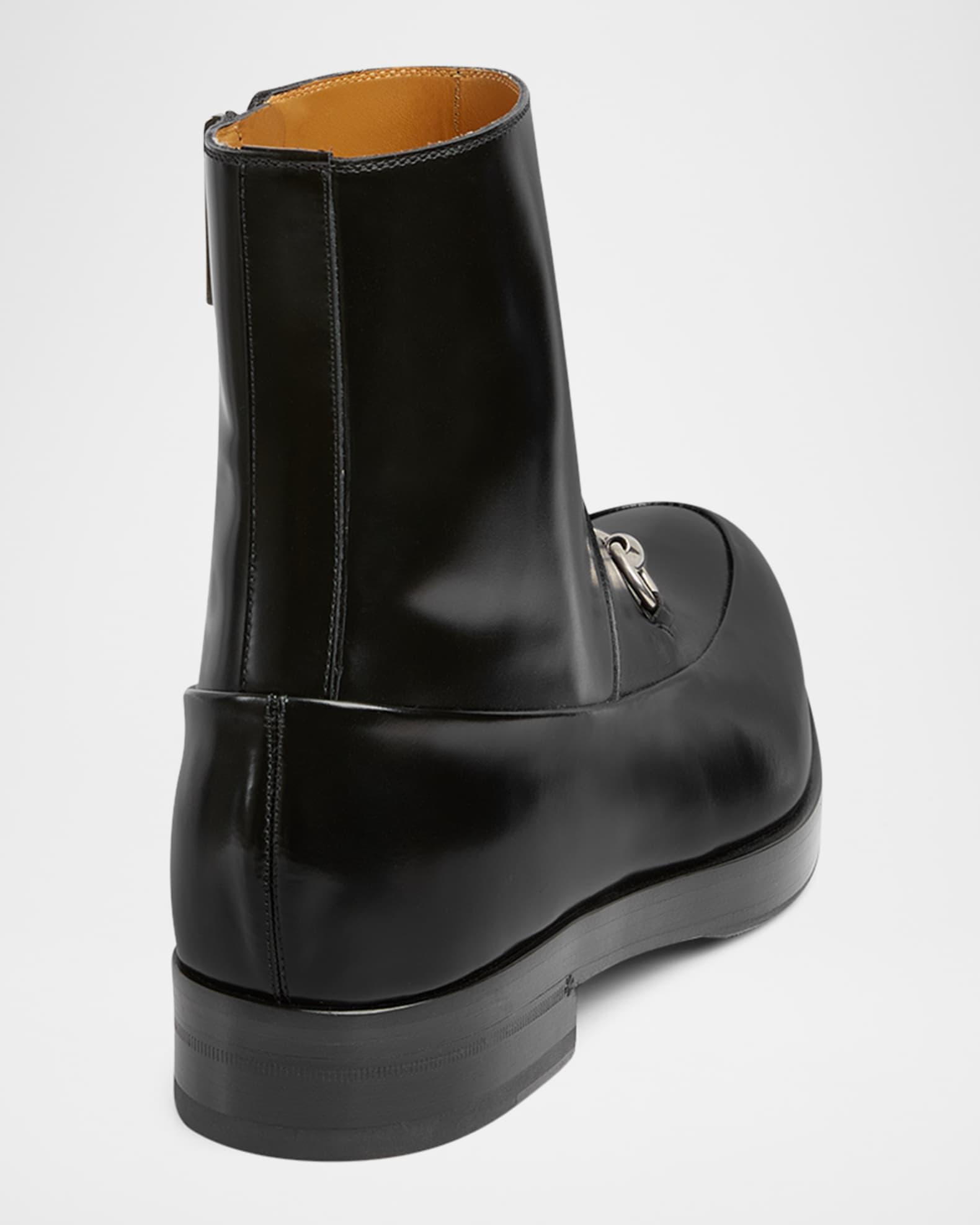 Gucci "Burn" ankle boots crafted from shiny leather featuring the signature silvertone bit hardware Spring-Summer 2025 Collection 1.25 in / 30 mm stacked heel Sculptural pointed toe Discreet side zip for easy on and off Leather lining and outsole Made in Italy