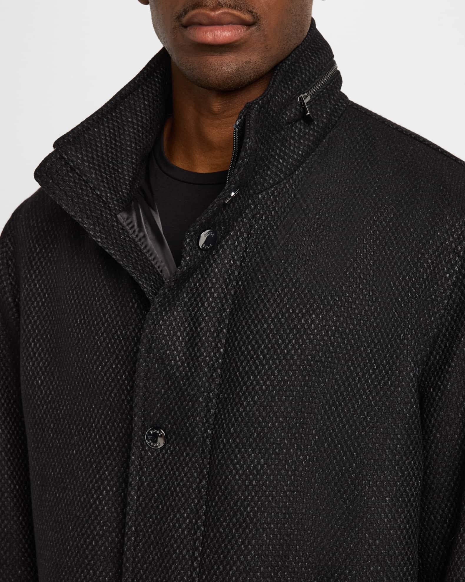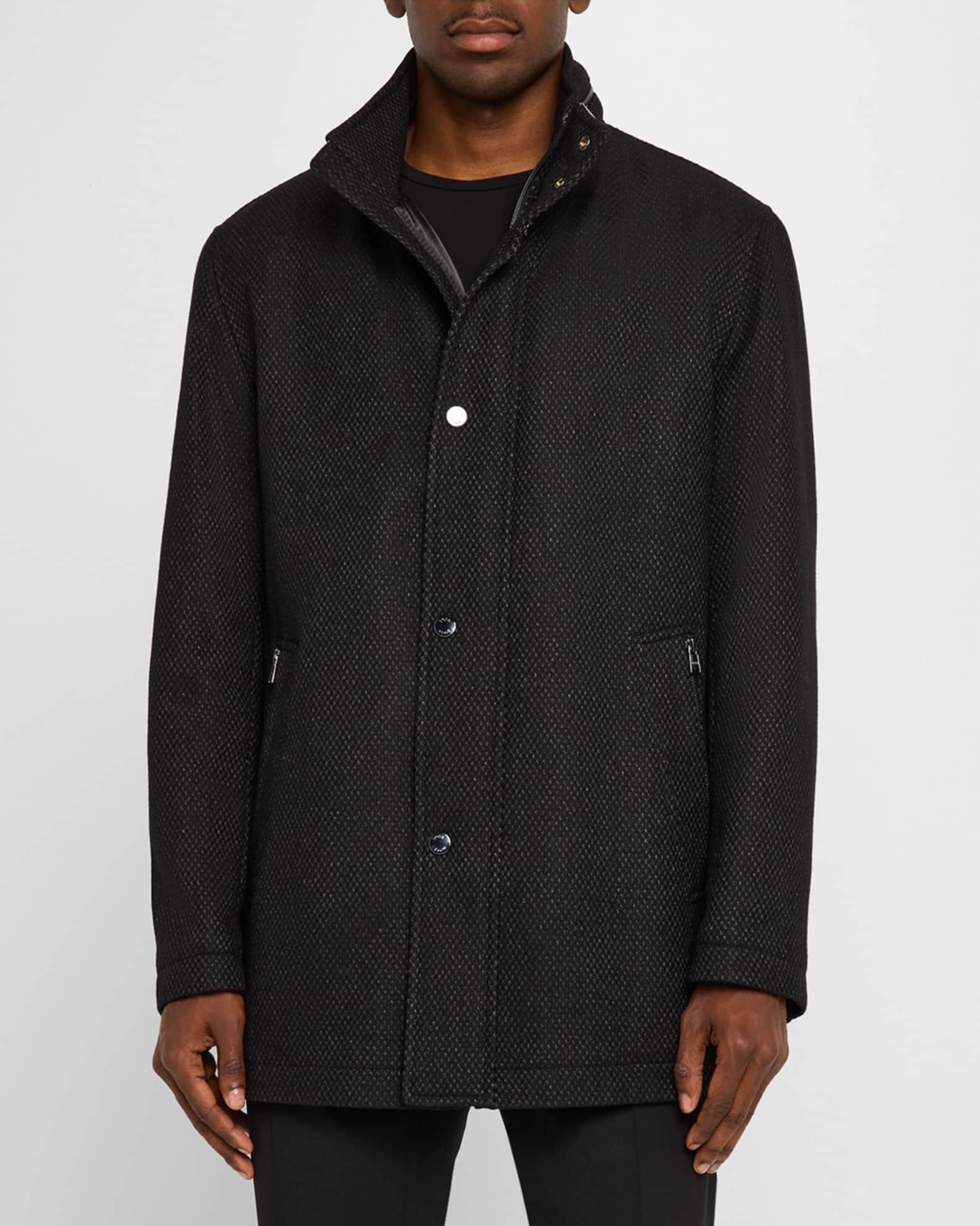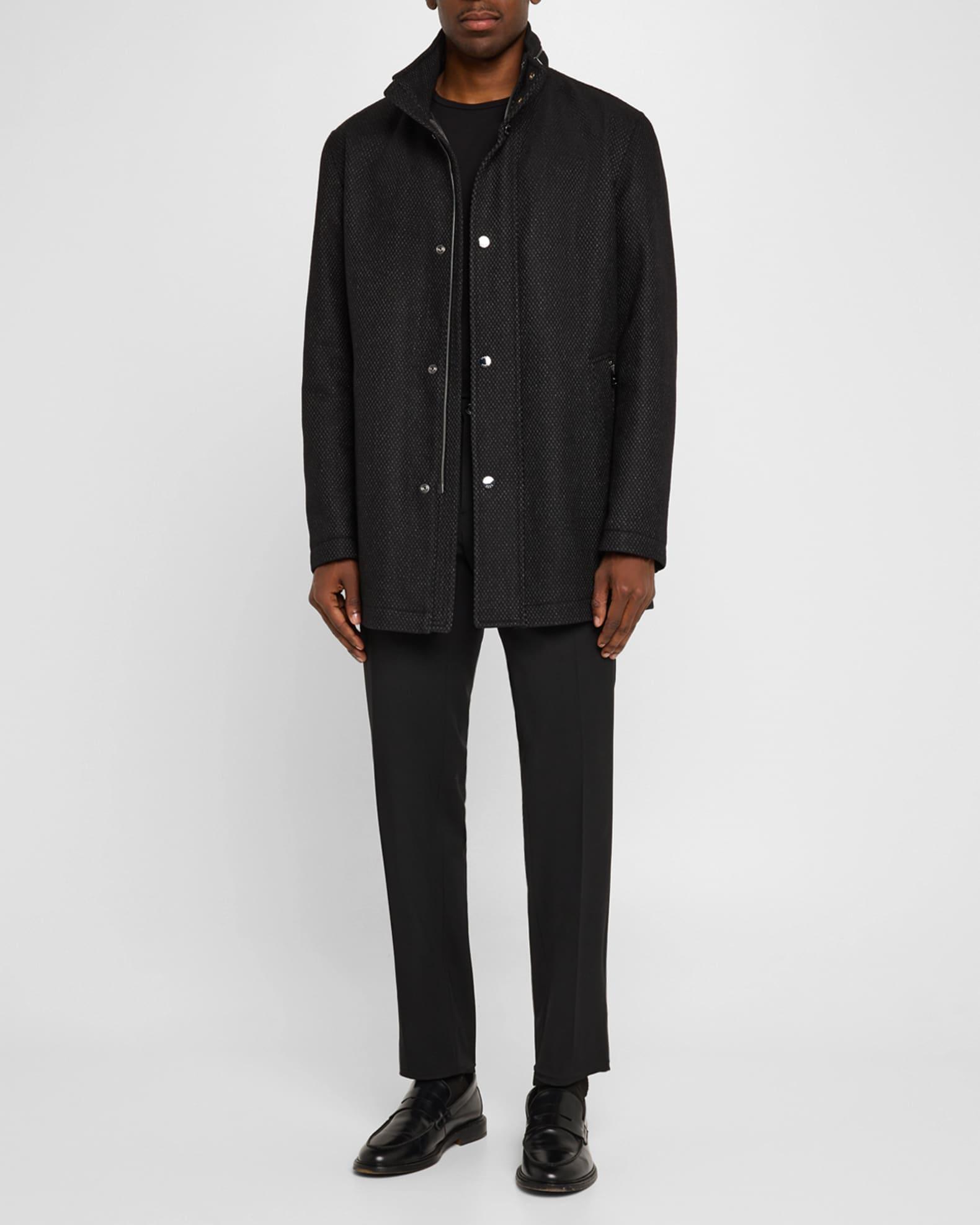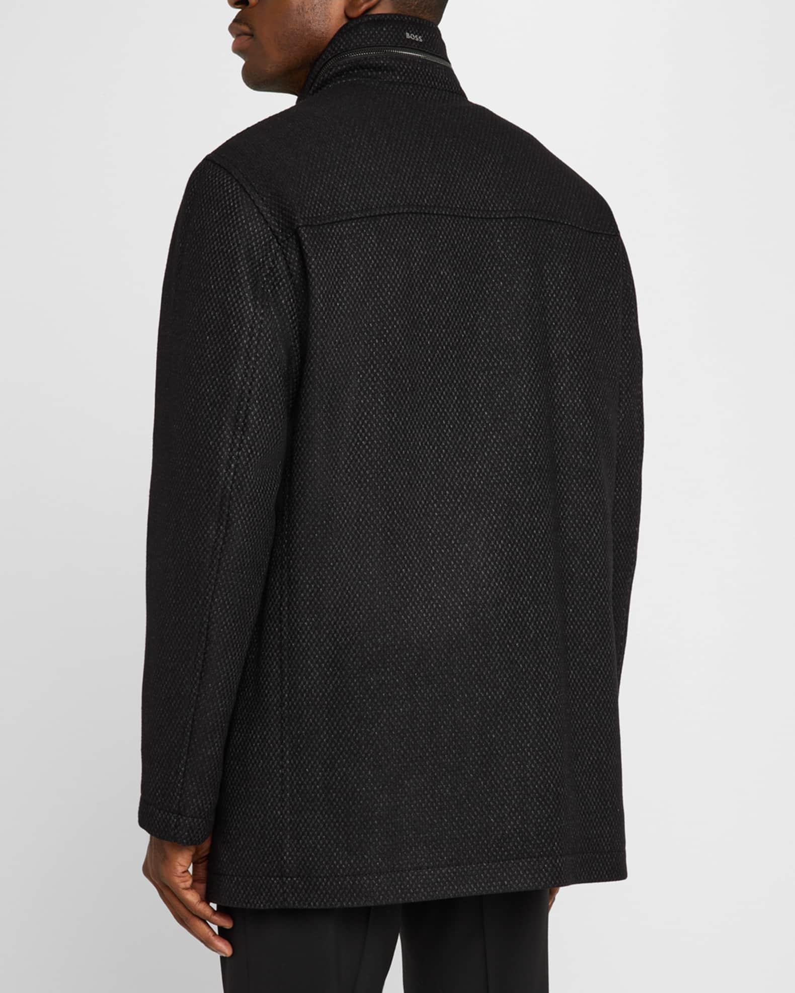 A versatile coat with signature detailing by BOSS. This piece is cut to a relaxed fit in wool woven with a subtle micro pattern. BOSS "Camron" herringbone wool-blend jacket  Approx. 33.6"L from shoulder to hem Stand collar with snaps; zip detail  Long sleeves  Side zip pockets  Relaxed fit  Zip-front with snap-over placket  Virgin wool/polyester Lining: Polyester Dry clean Imported