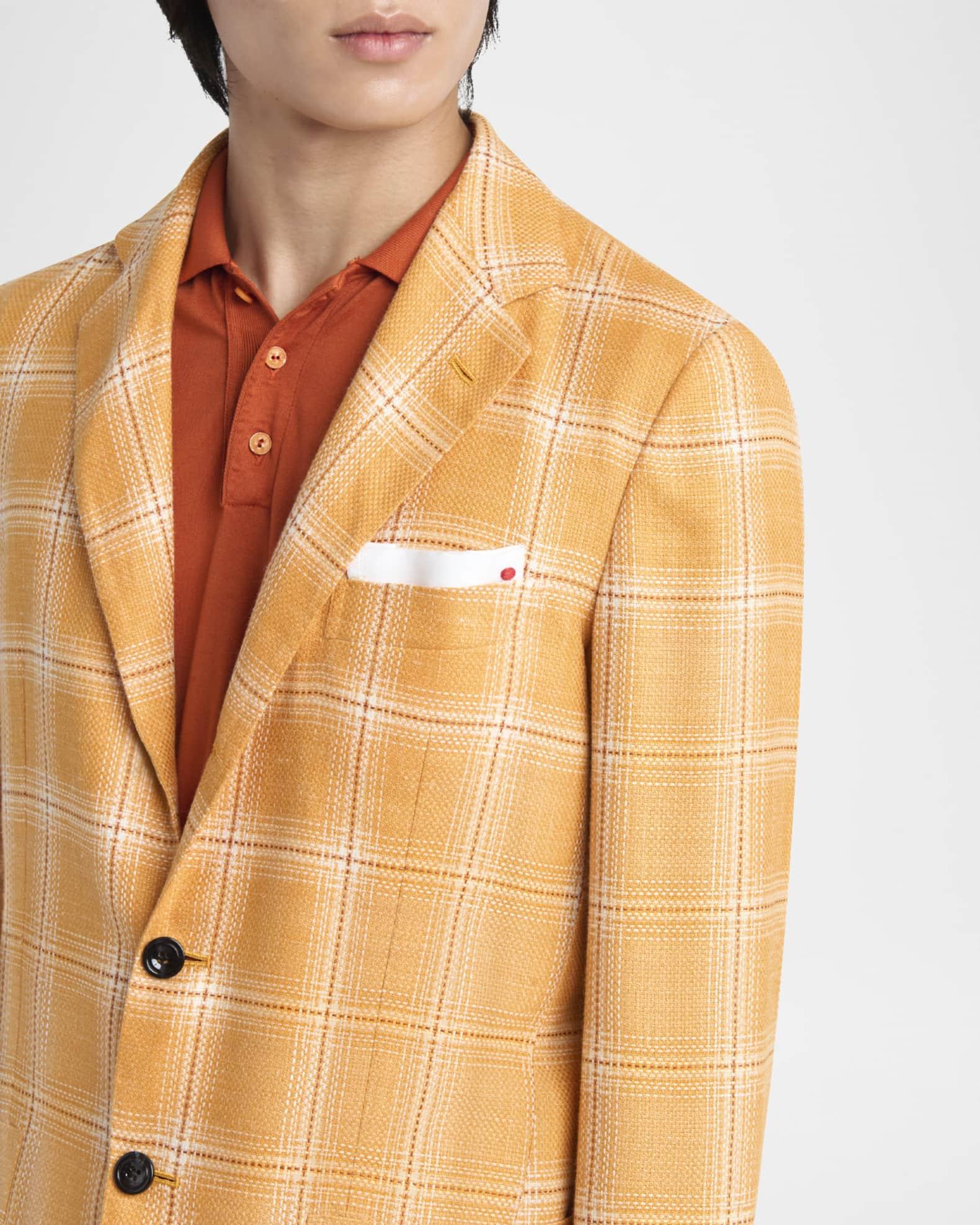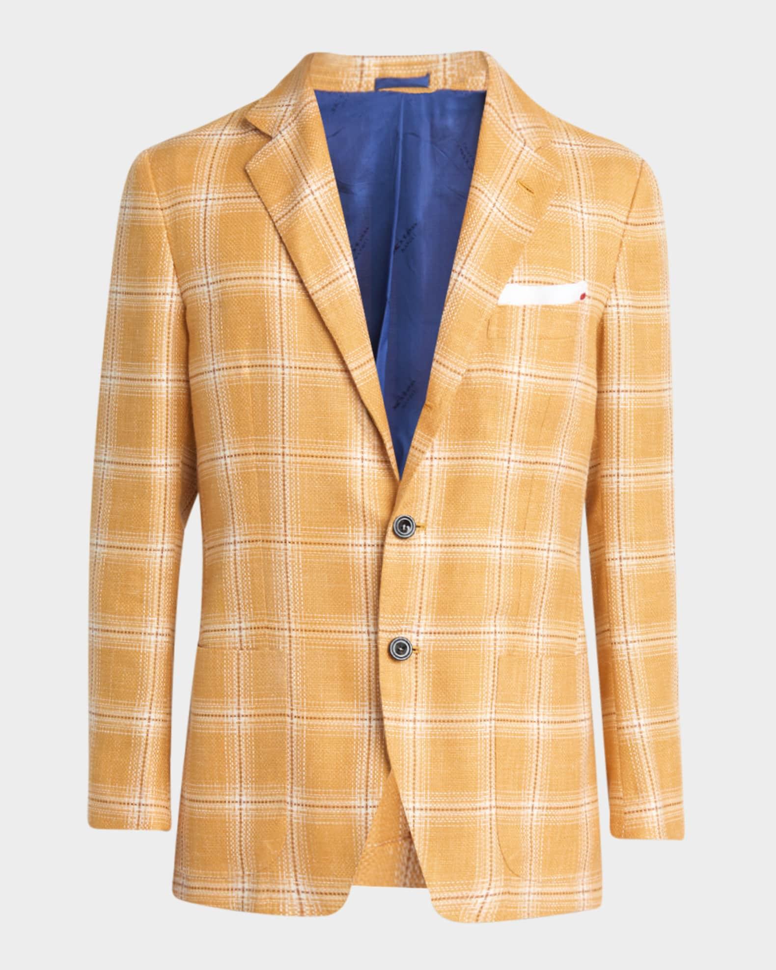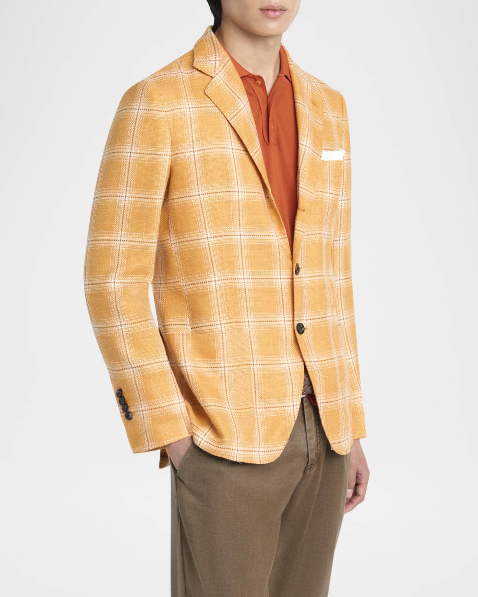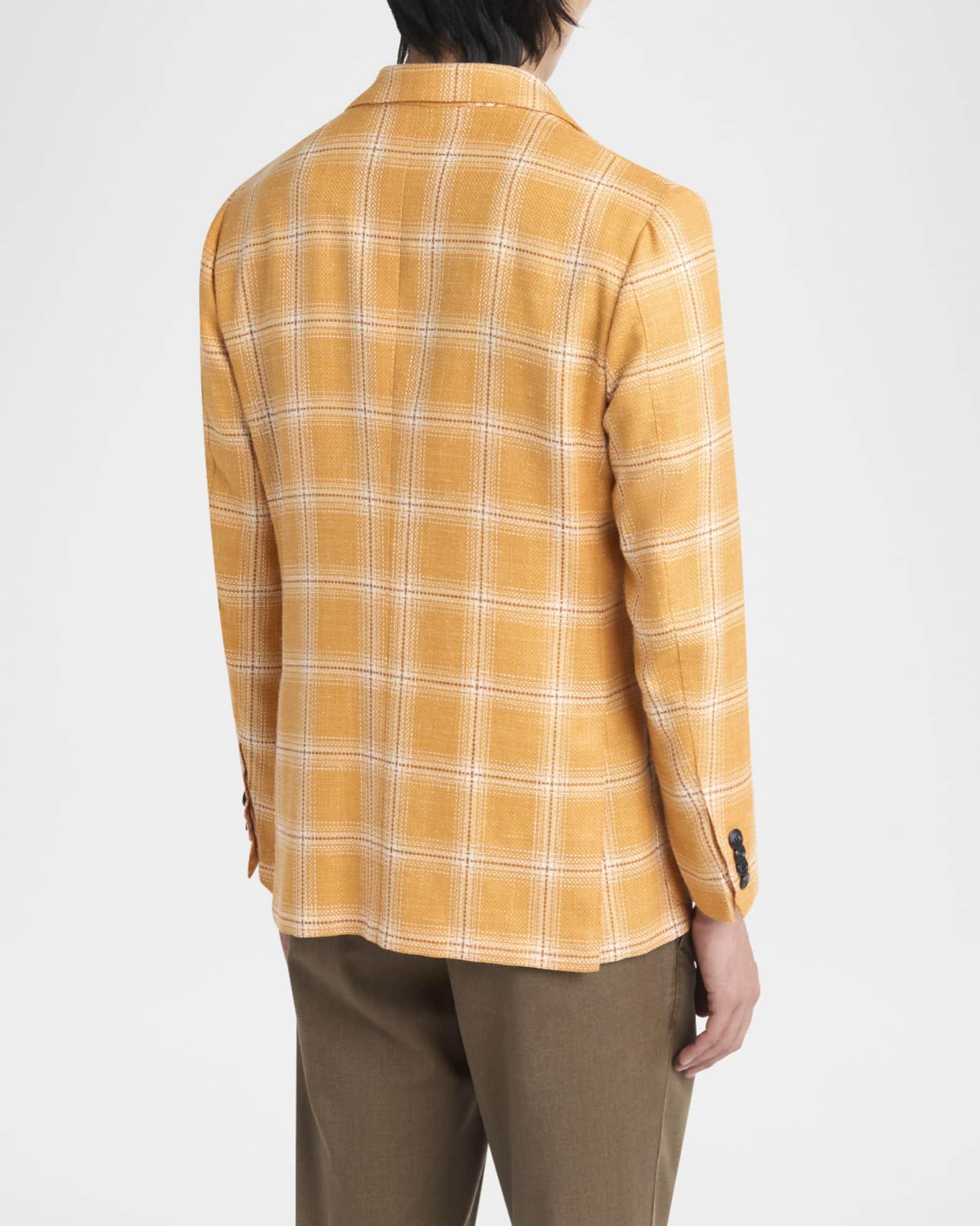 Kiton sport coat in plaid Notched lapels Three-button closure Chest welt pocket Hip patch pockets Four-button sleeve finish Cashmere/virgin wool/silk Lining: Silk Dry clean Made in Italy