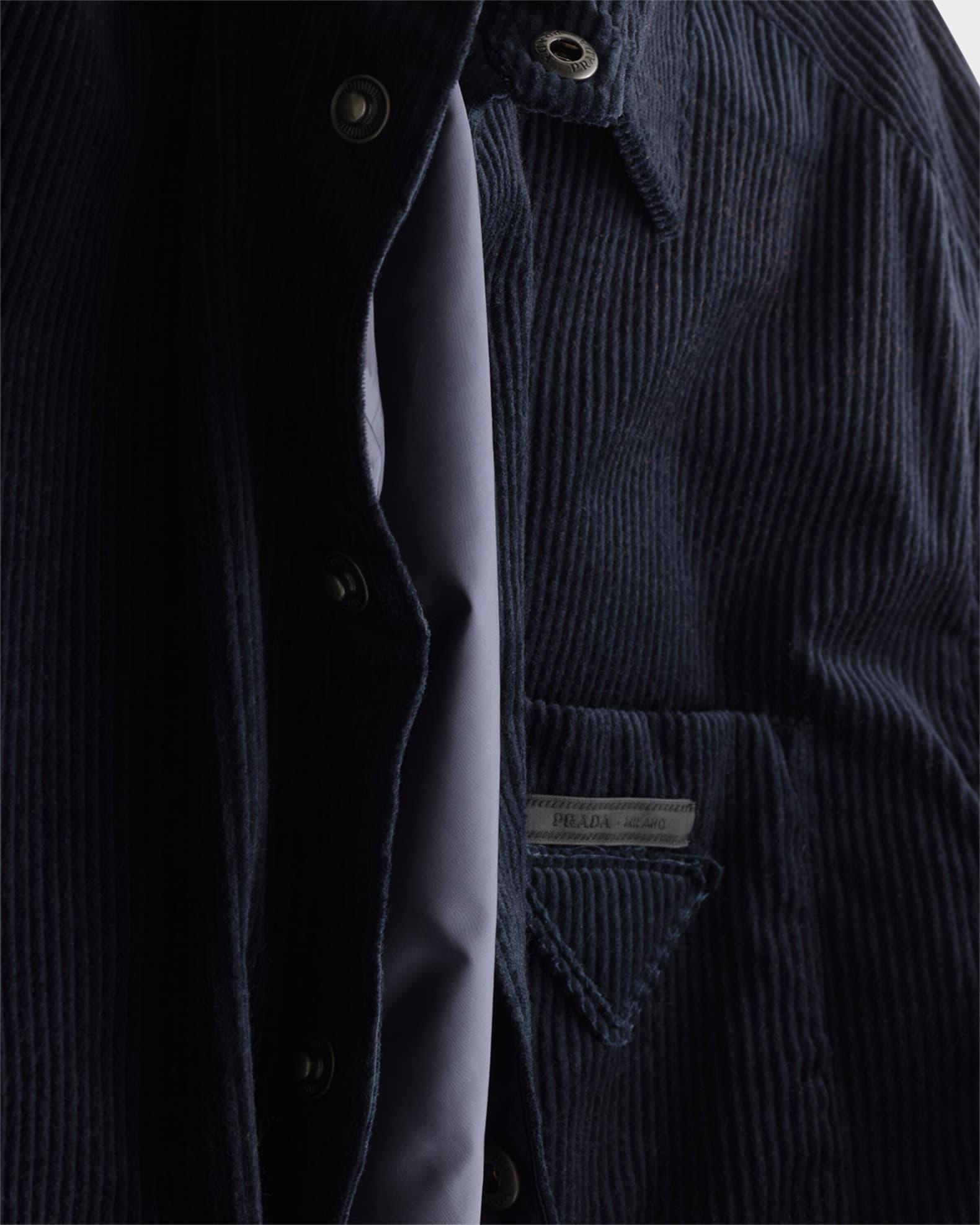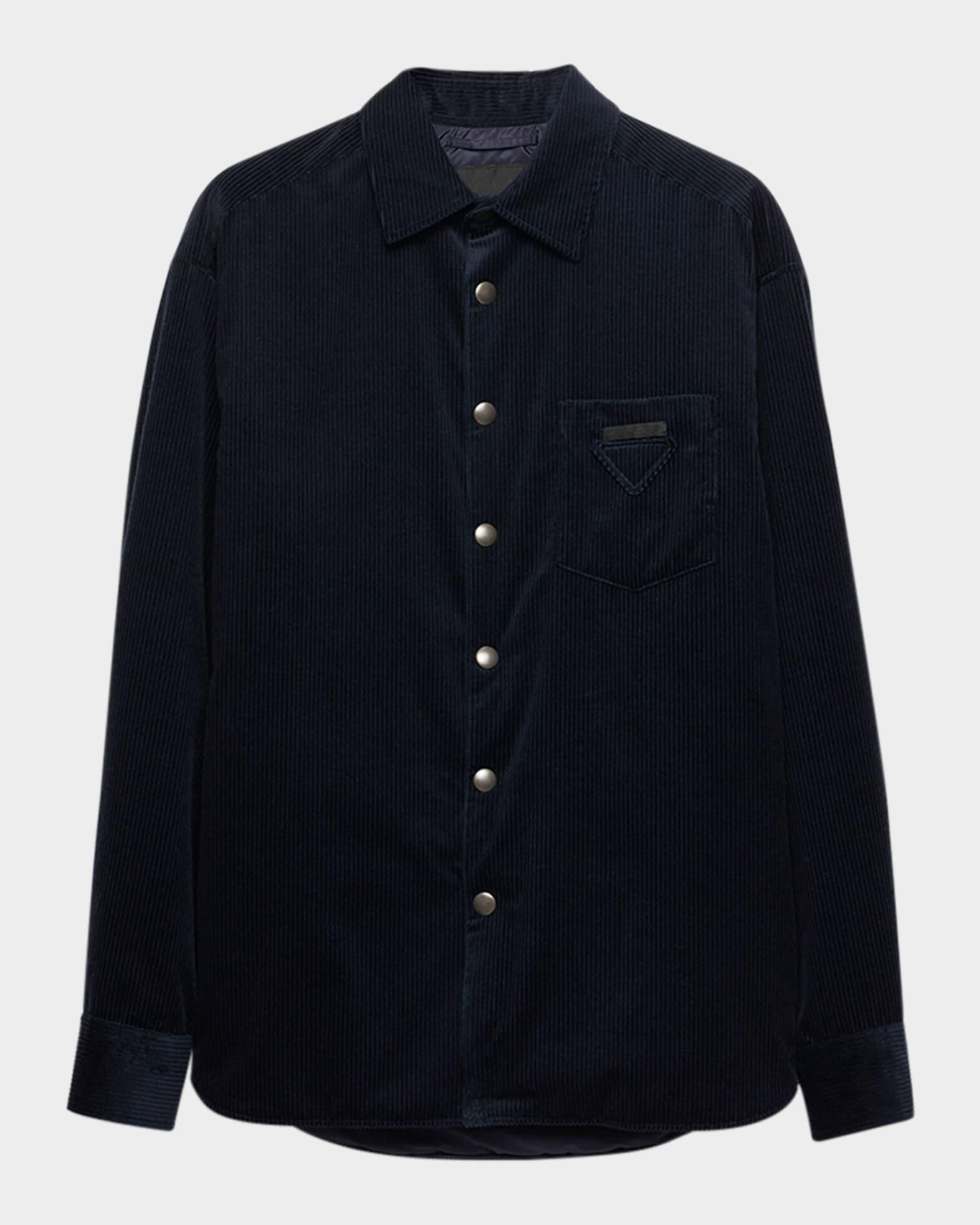 Designed in soft corduroy, this Prada shirt features a classic silhouette, subtly padded triangle logo, and a sartorial label on the left chest Approx. 30.5"L from shoulders to hem Spread collar Snap front closure Chest patch pocket Long sleeves Oversized fit Shirttail hem Cotton/cashmere Made in Italy
