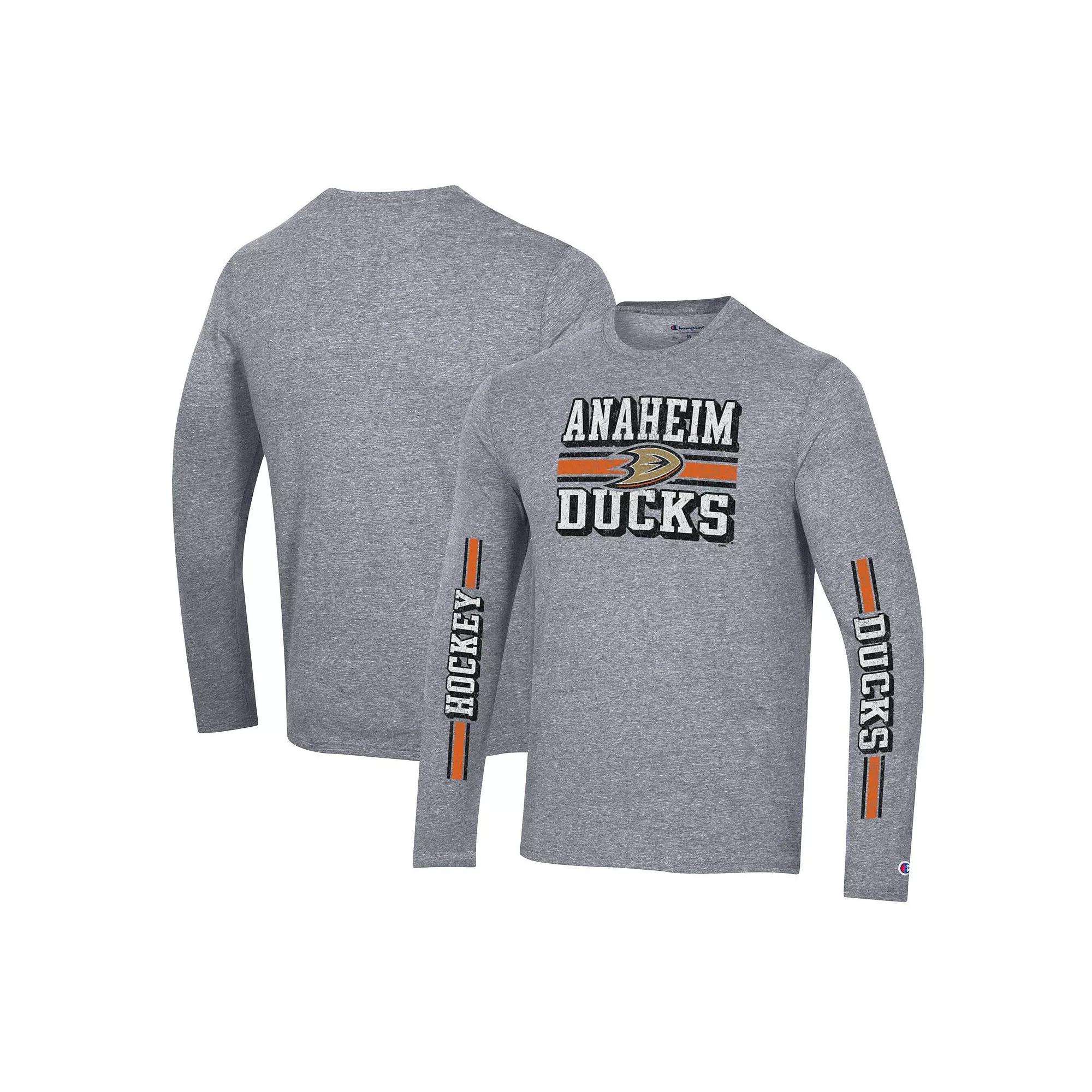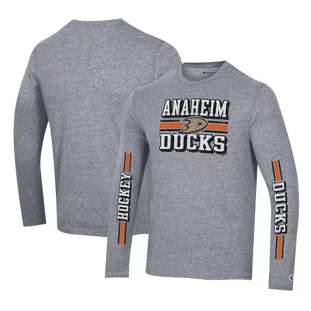 Put your Anaheim Ducks fandom on full display when you wear this Dual-Stripe T-Shirt from Champion. It features distressed graphics on the front chest and down both sleeves that show your team spirit is undeniable. Plus, tri-blend material makes this long-sleeve tee a comfortable option for all day wear when supporting the Anaheim Ducks.