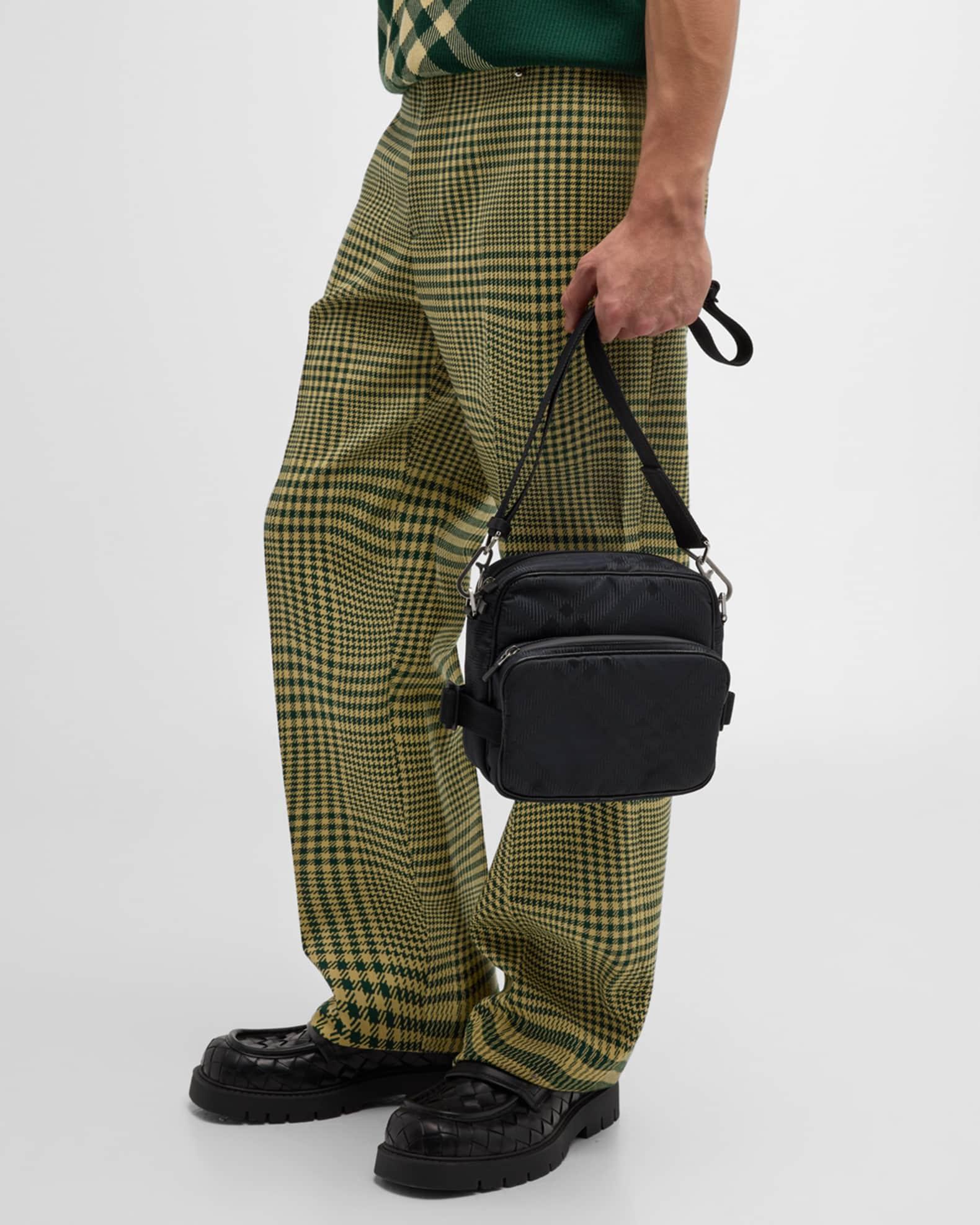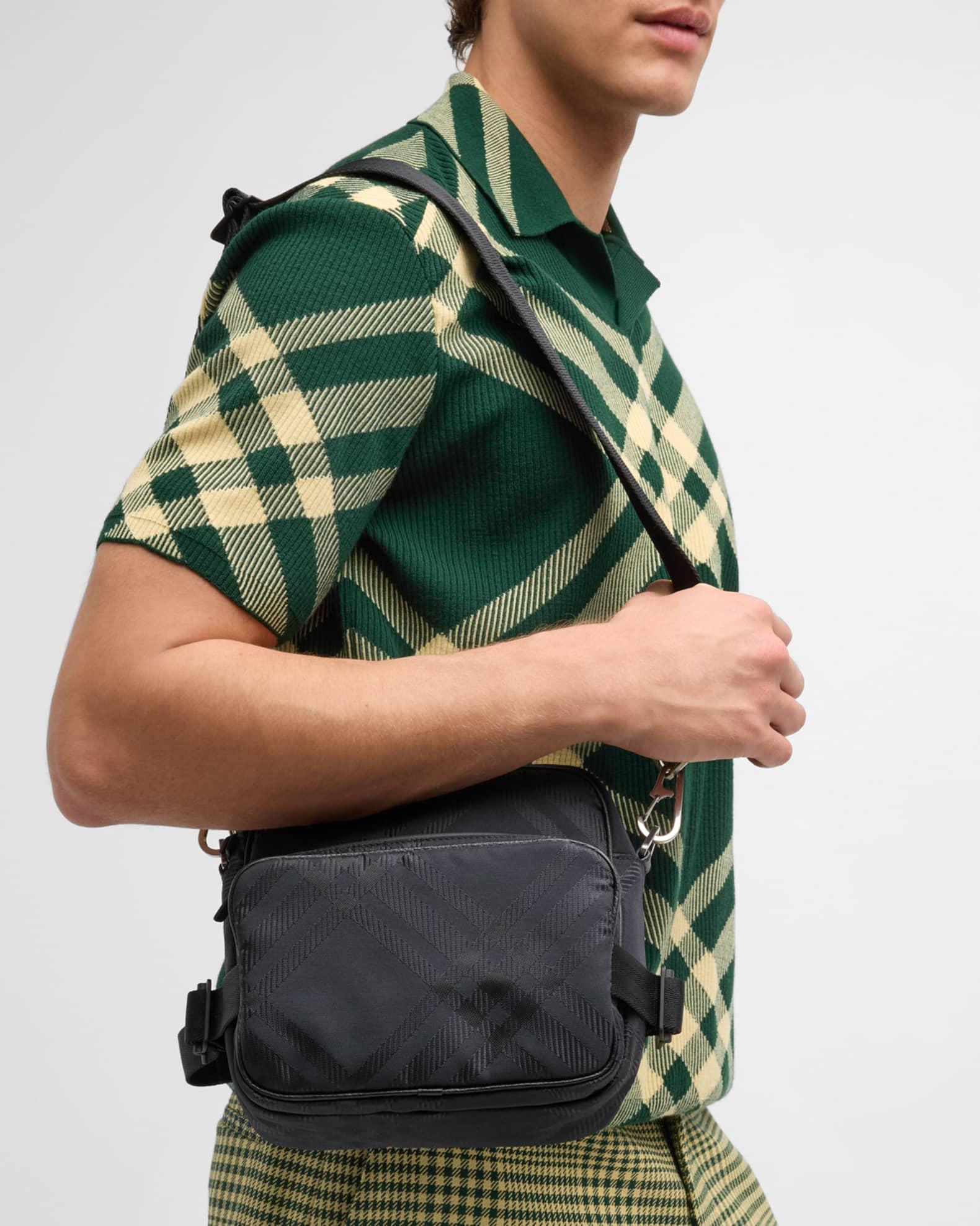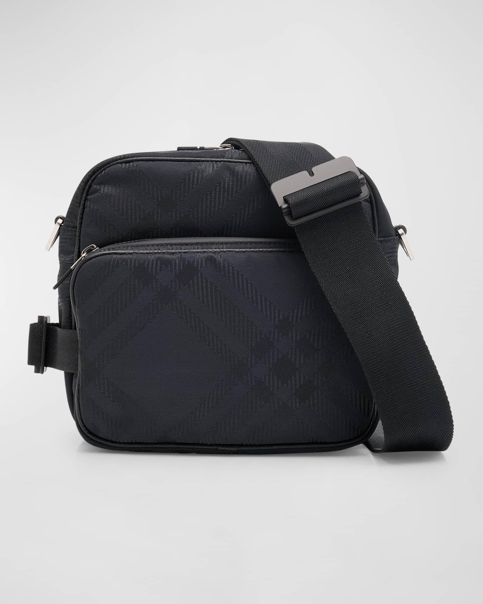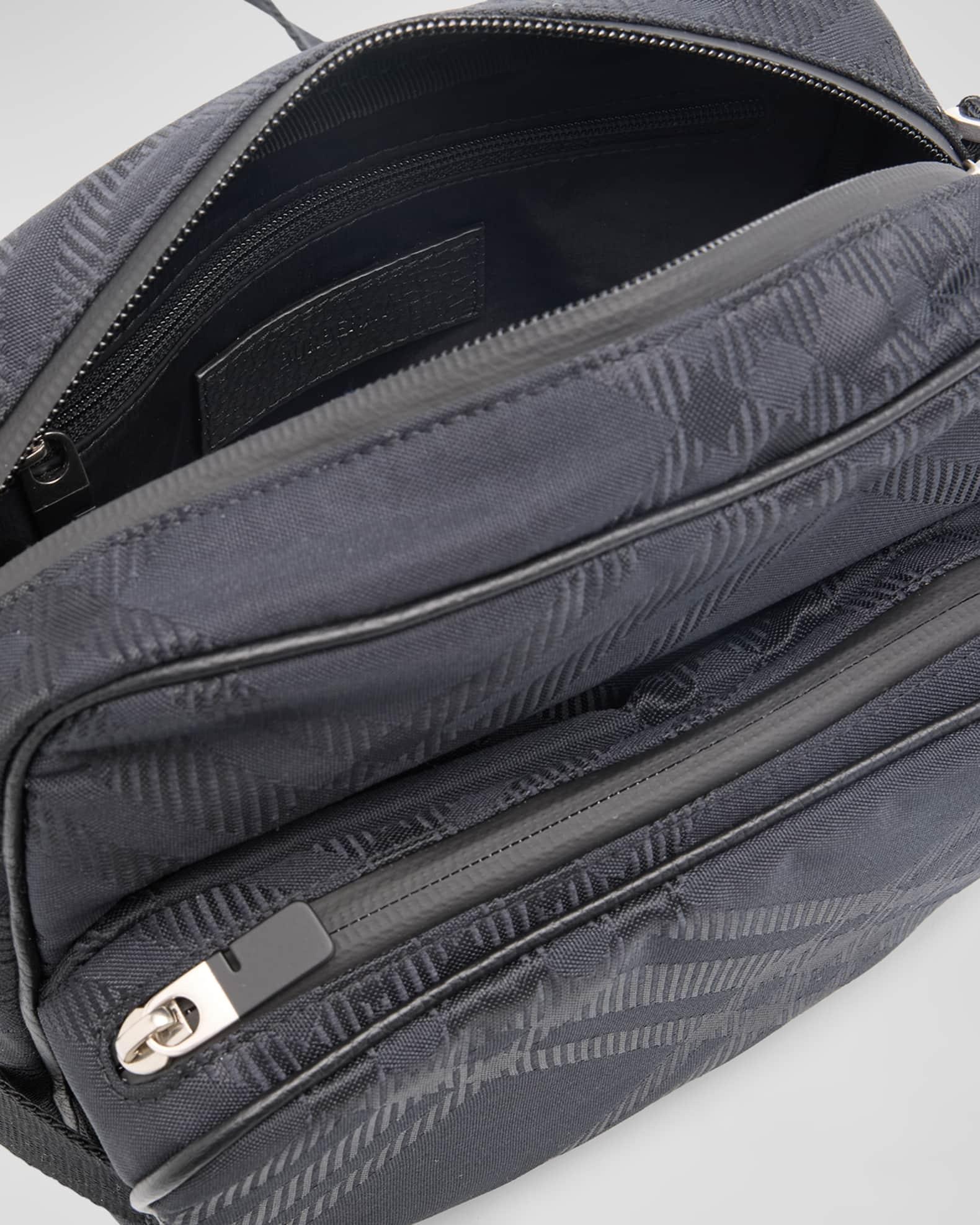 Burberry crossbody bag in a nylon blend with a jacquard-woven tonal check pattern Detachable adjustable webbing strap Zip closure Exterior, one zip pocket, one back slip pocket Interior, one zip pocket Nylon lining Side adjusters B-cut zip pulls Hand-painted edges Brushed metal hardware Approx. 7.87"H x 7.87"W x 3.93"D Leather trim Nylon/polyester Imported