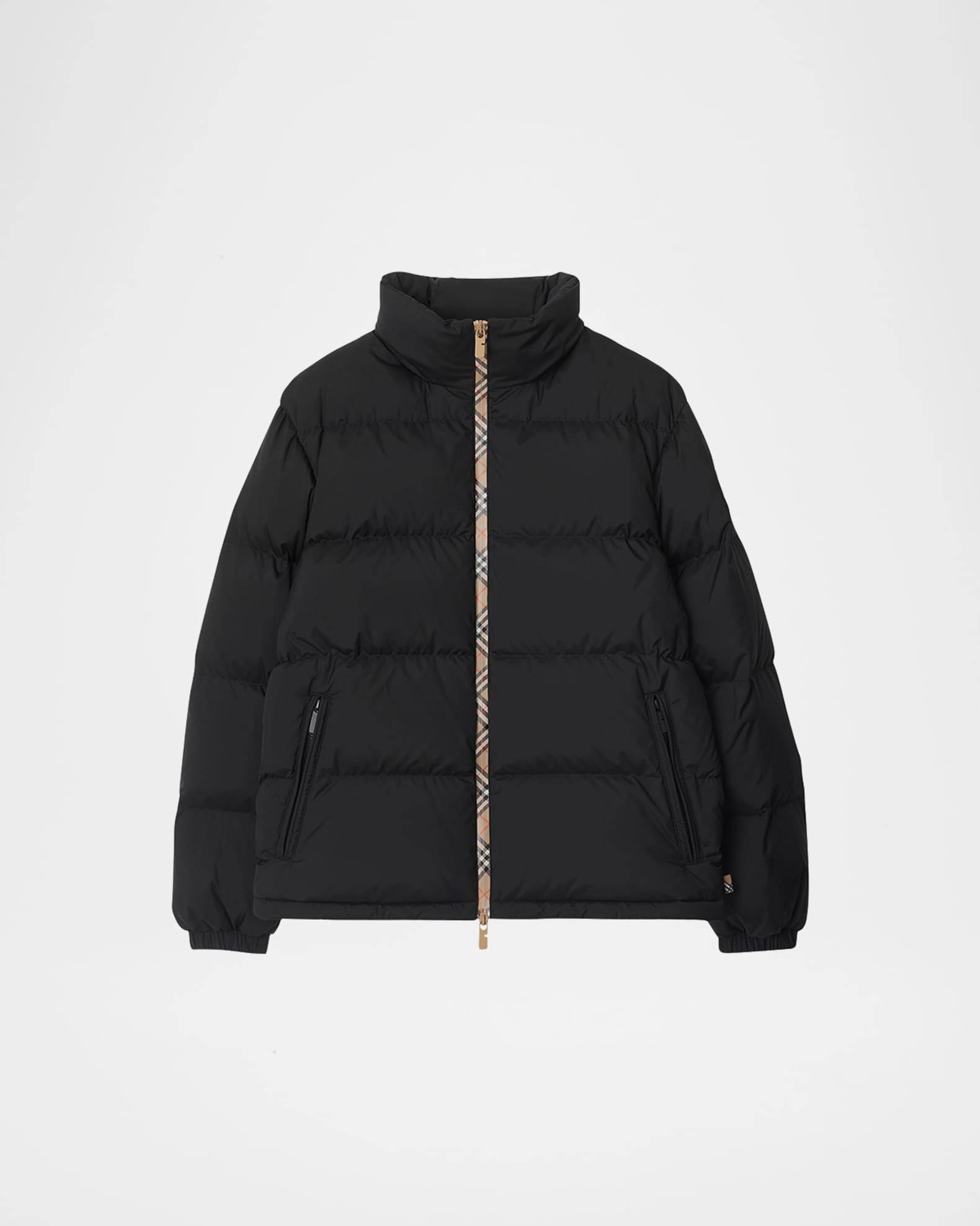 Burberry puffer jacket with premium down padding showcasing the signature Check on the zipper placket Stand collar Two-way zip front Side zip pockets Long sleeves Ribbed cuffs Polyester Imported