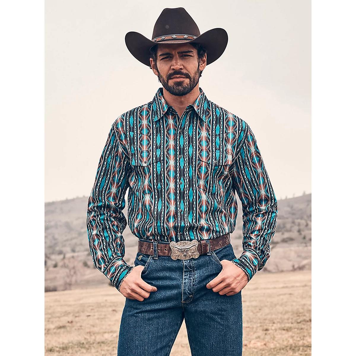 STYLE THAT’S READY TO RODEOWrangler's Checotah® has a home in the closets of cowboys around the world. This men's Checotah long-sleeve western snap Navajo-inspired printed shirt is designed to make a statement no matter the destination. It features a classic fit, a spread collar, pointed yokes, two snap flap pockets with a convenient pencil slot, adjustable cuffs, and a full-length snap closure for the finishing touch. Best of all, it's crafted from cotton for uncompromising comfort. Look sharp at a moment's notice by wearing your Checotah shirt with a Wrangler Retro® or Cowboy Cut® jean.