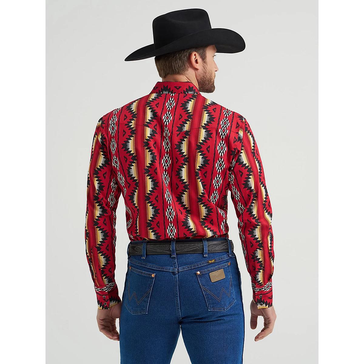 STYLE THAT’S READY TO RODEOWrangler's Checotah® has a home in the closets of cowboys around the world. This men's Checotah long-sleeve western snap Navajo-inspired printed shirt is designed to make a statement no matter the destination. It features a classic fit, a spread collar, pointed yokes, two snap flap pockets with a convenient pencil slot, adjustable cuffs, and a full-length snap closure for the finishing touch. Best of all, it's crafted from cotton for uncompromising comfort. Look sharp at a moment's notice by wearing your Checotah shirt with a Wrangler Retro® or Cowboy Cut® jean.