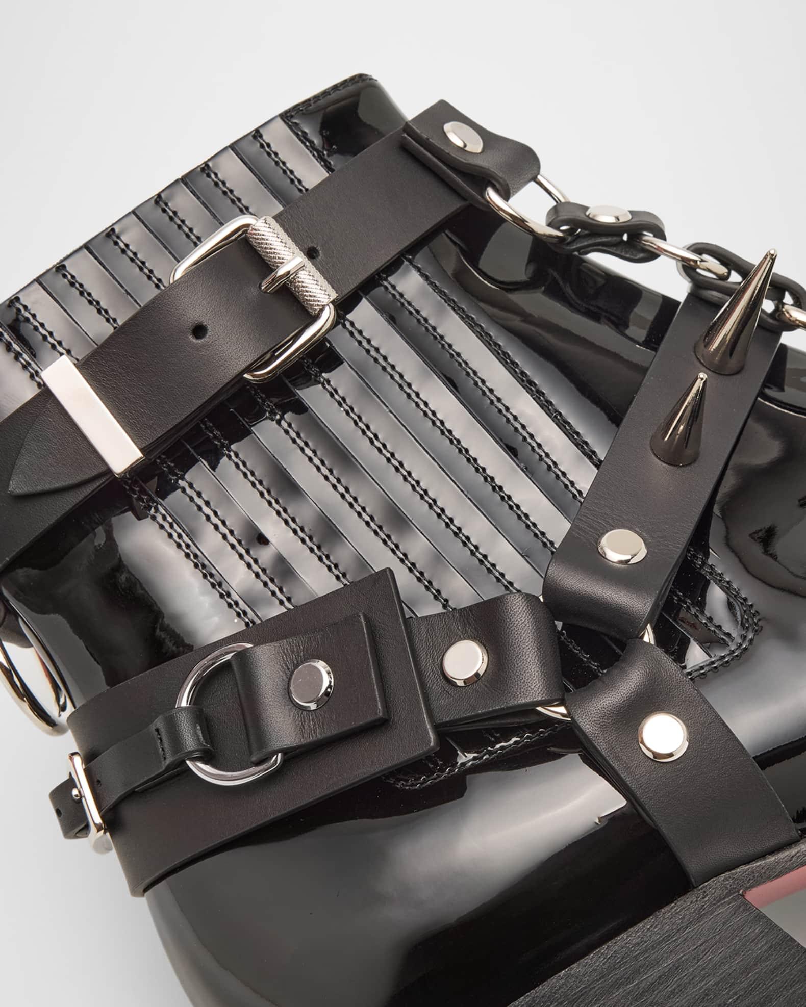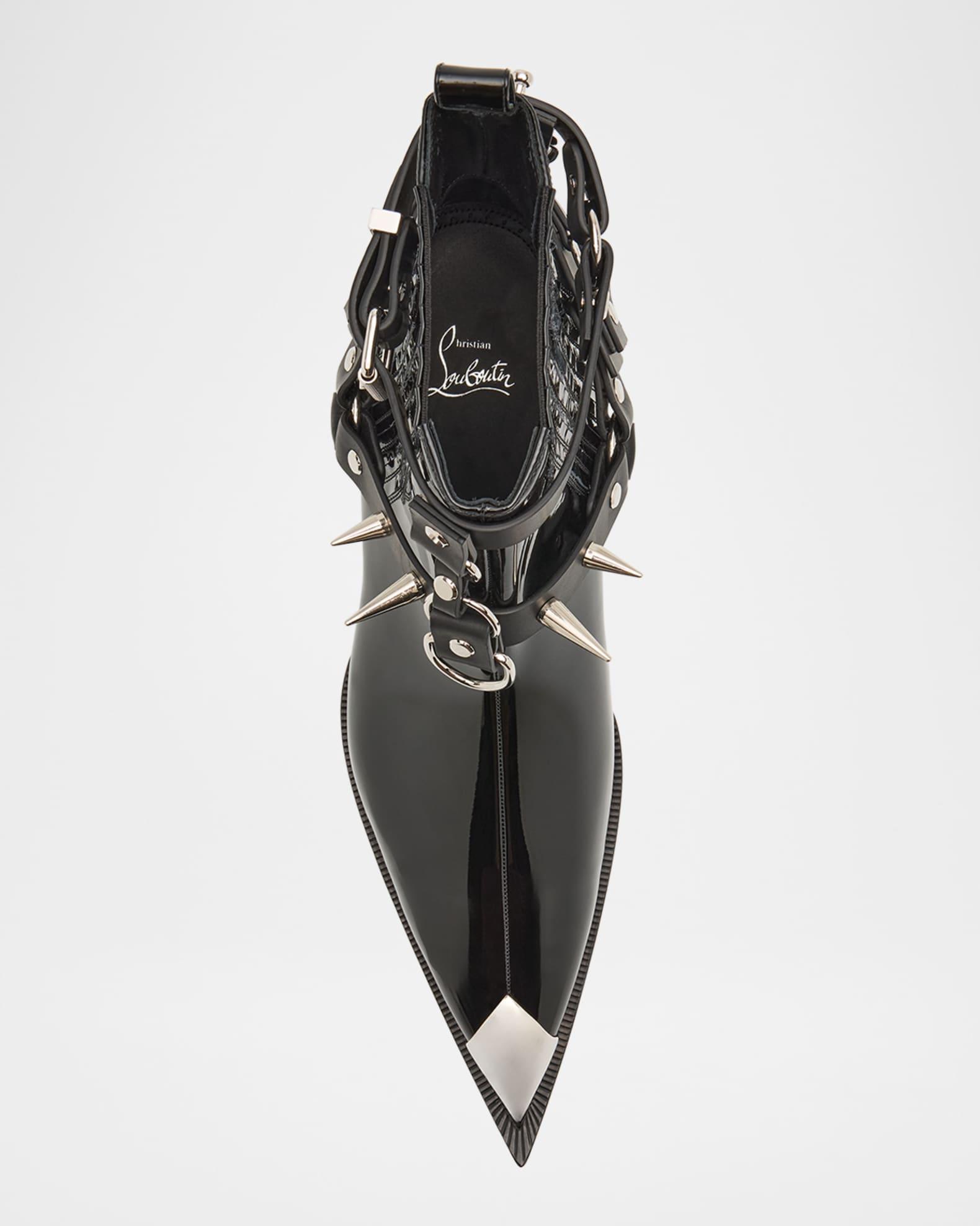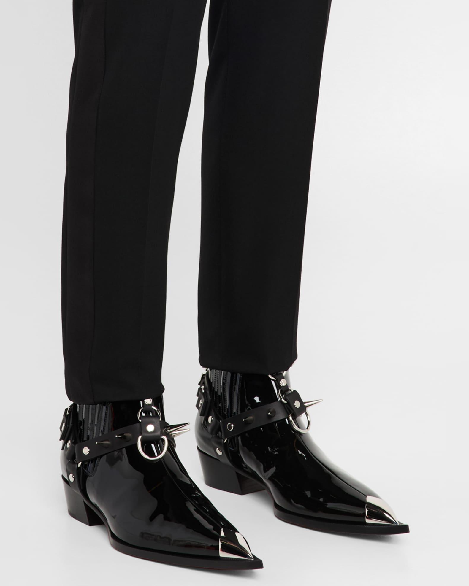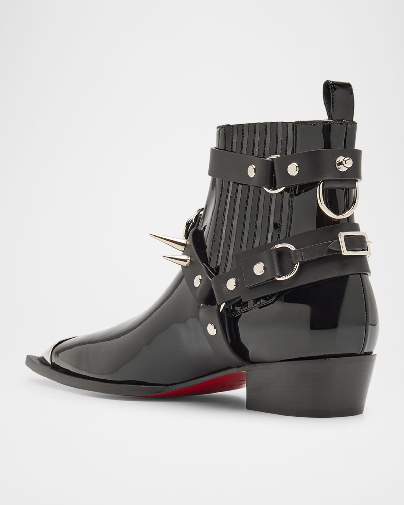 Christian Louboutin "Chesteviss" ankle boots in glossy patent leather Features silvertone buckles with signature metal spikes Cuban heel Pointed toe with metal toe cap Gored sides Backstay pull tab Leather lining and outsole Pull-on style Made in Italy
