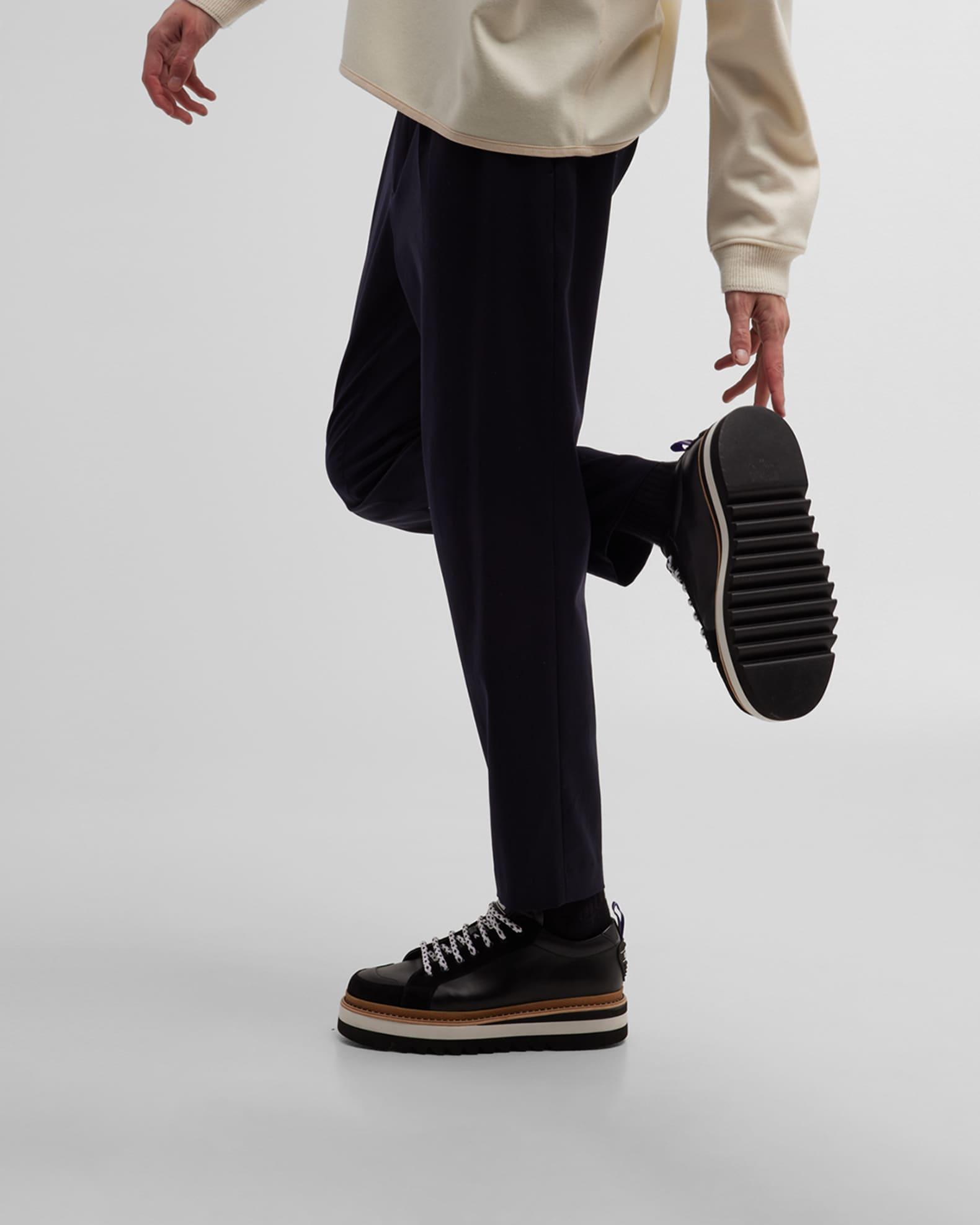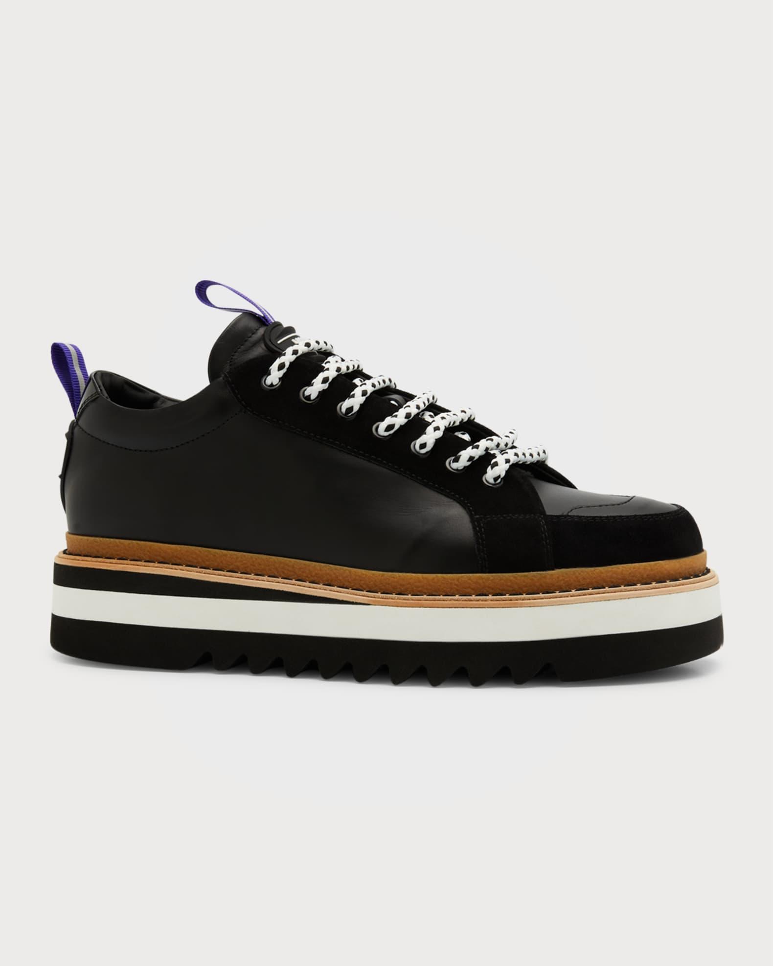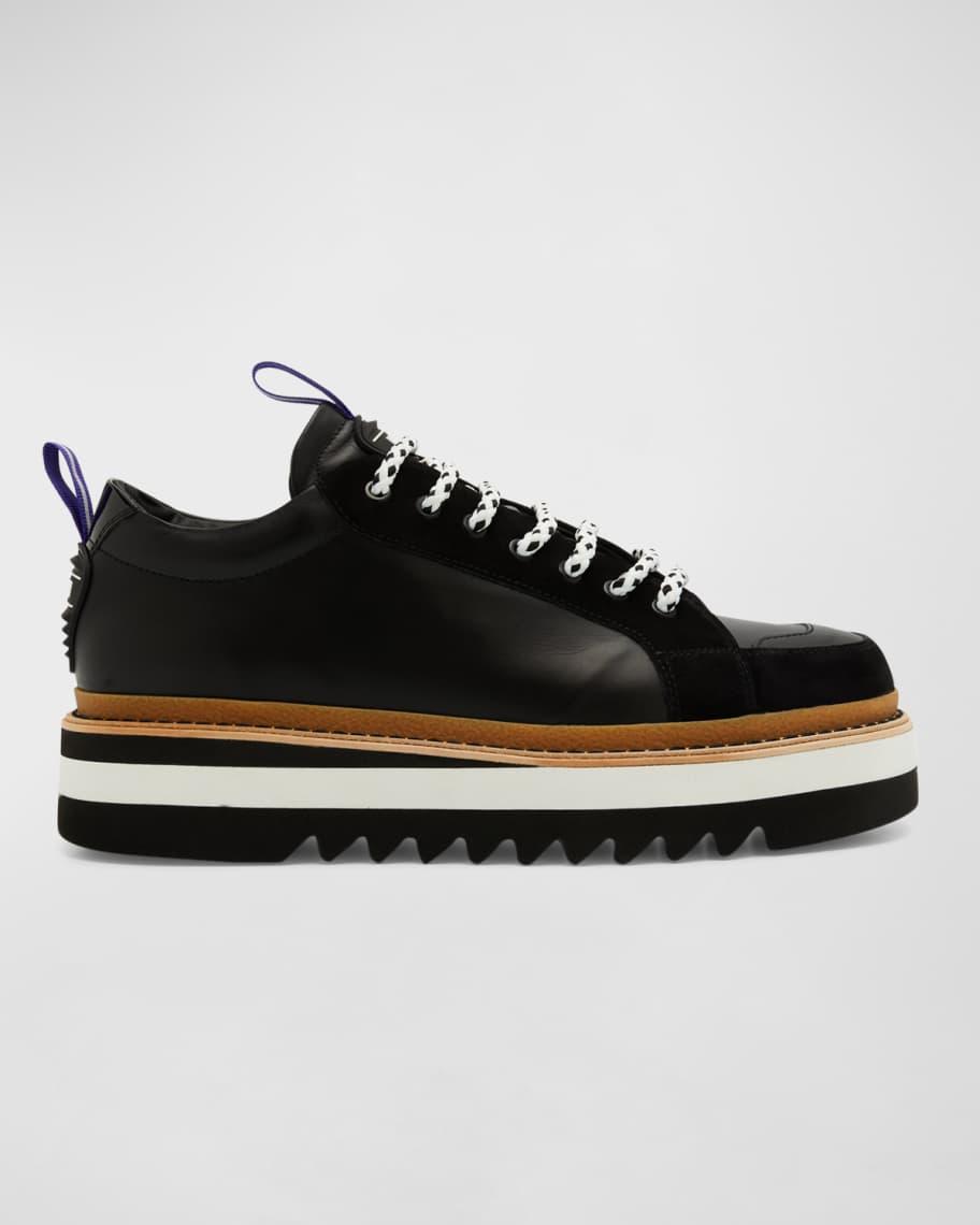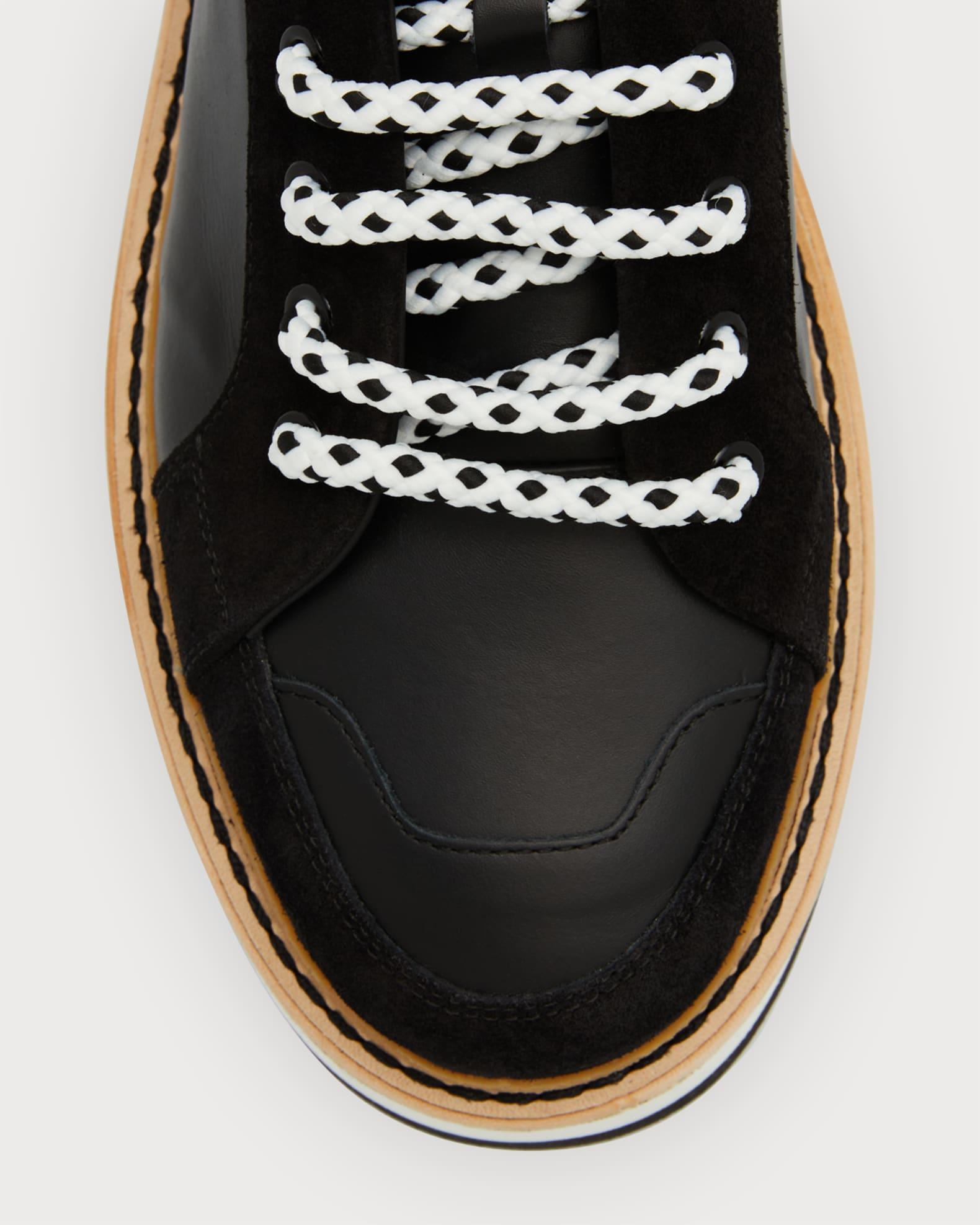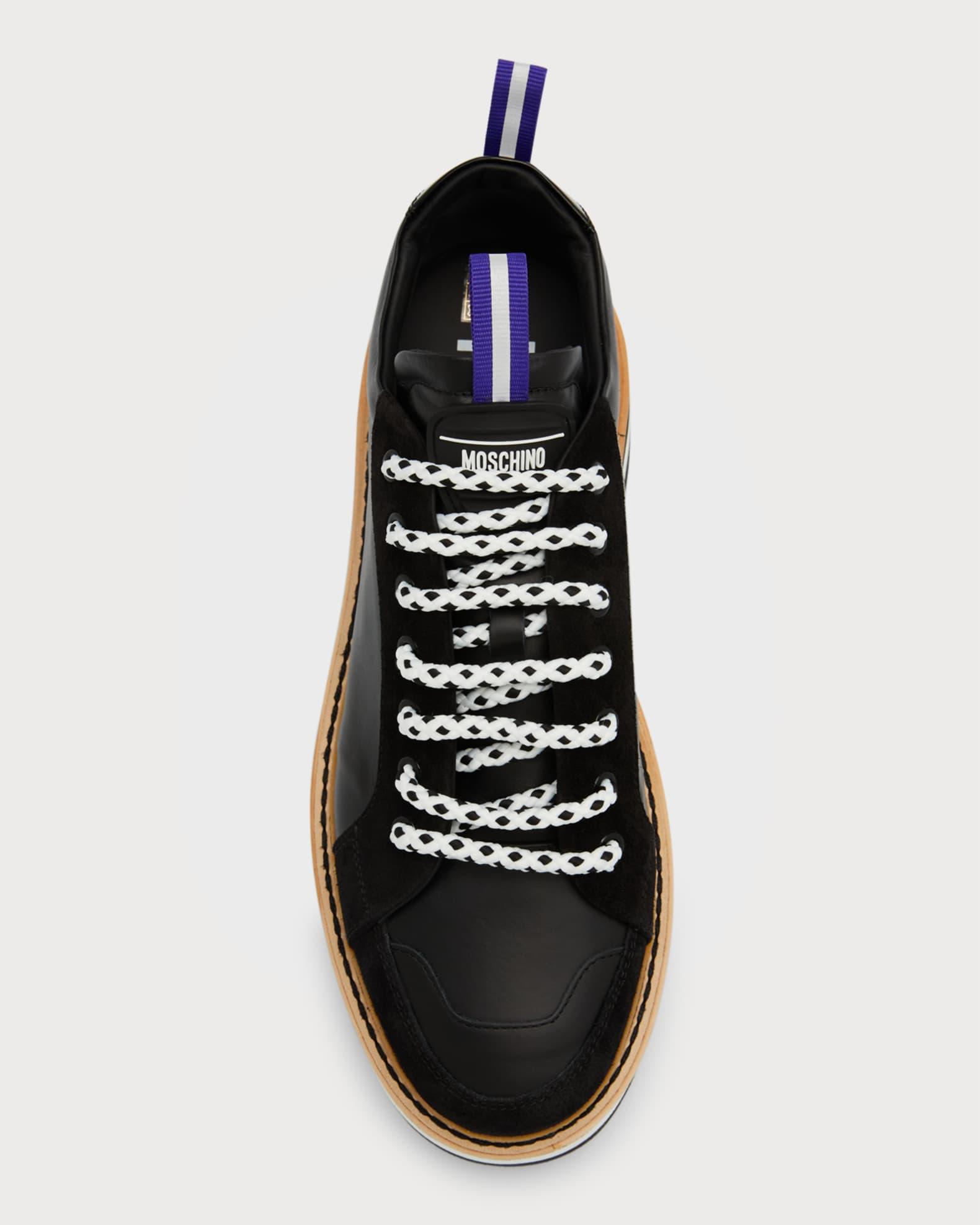Moschino "City Trainer" low-top sneakers in calf leather with velvet trim Flat heel Round toe Lace-up vamp Bicolor shoelaces Rubber logo appliqué and pull tab at tongue and backstay Contrast stitched welt Serrated rubber outsole Made in Italy
