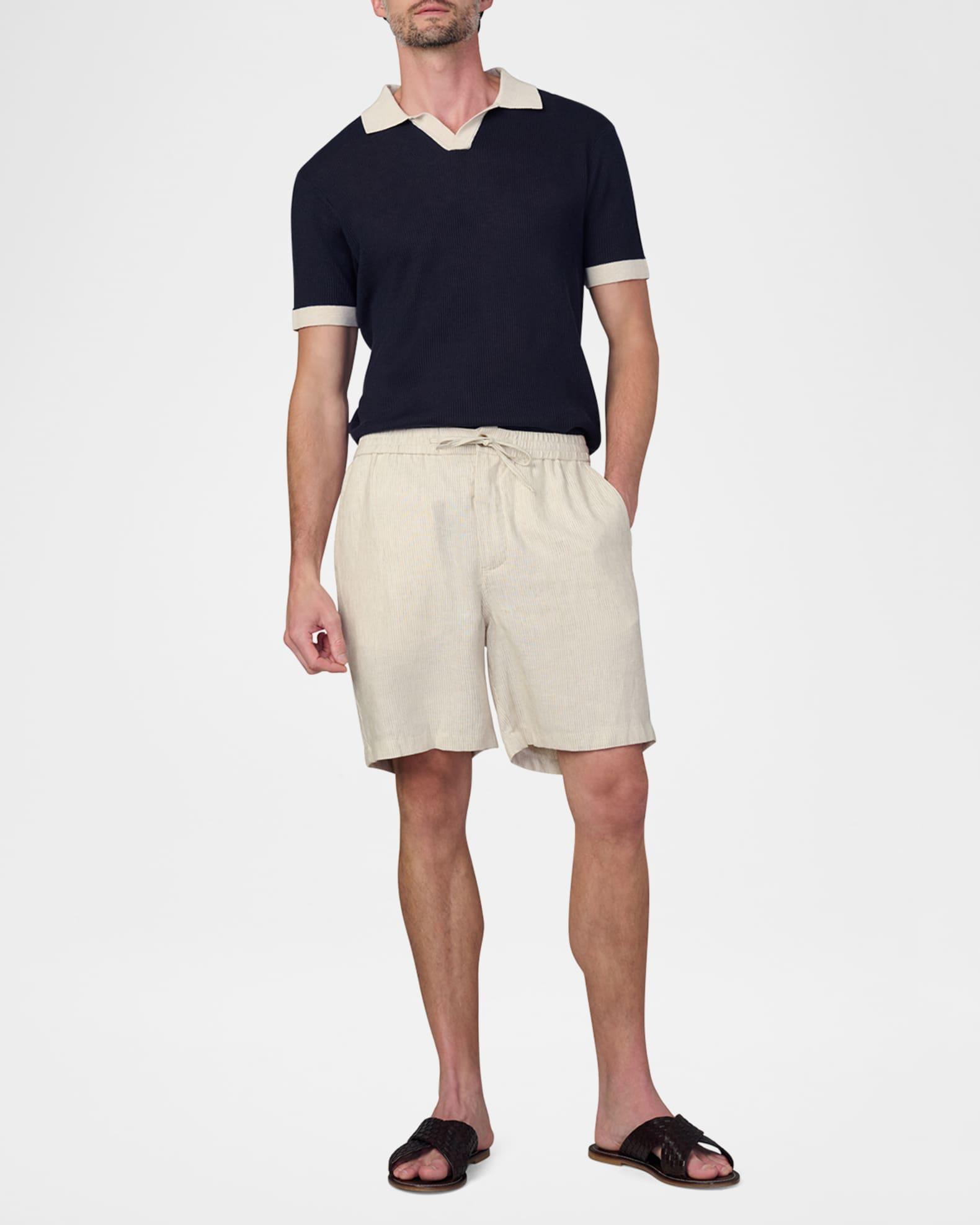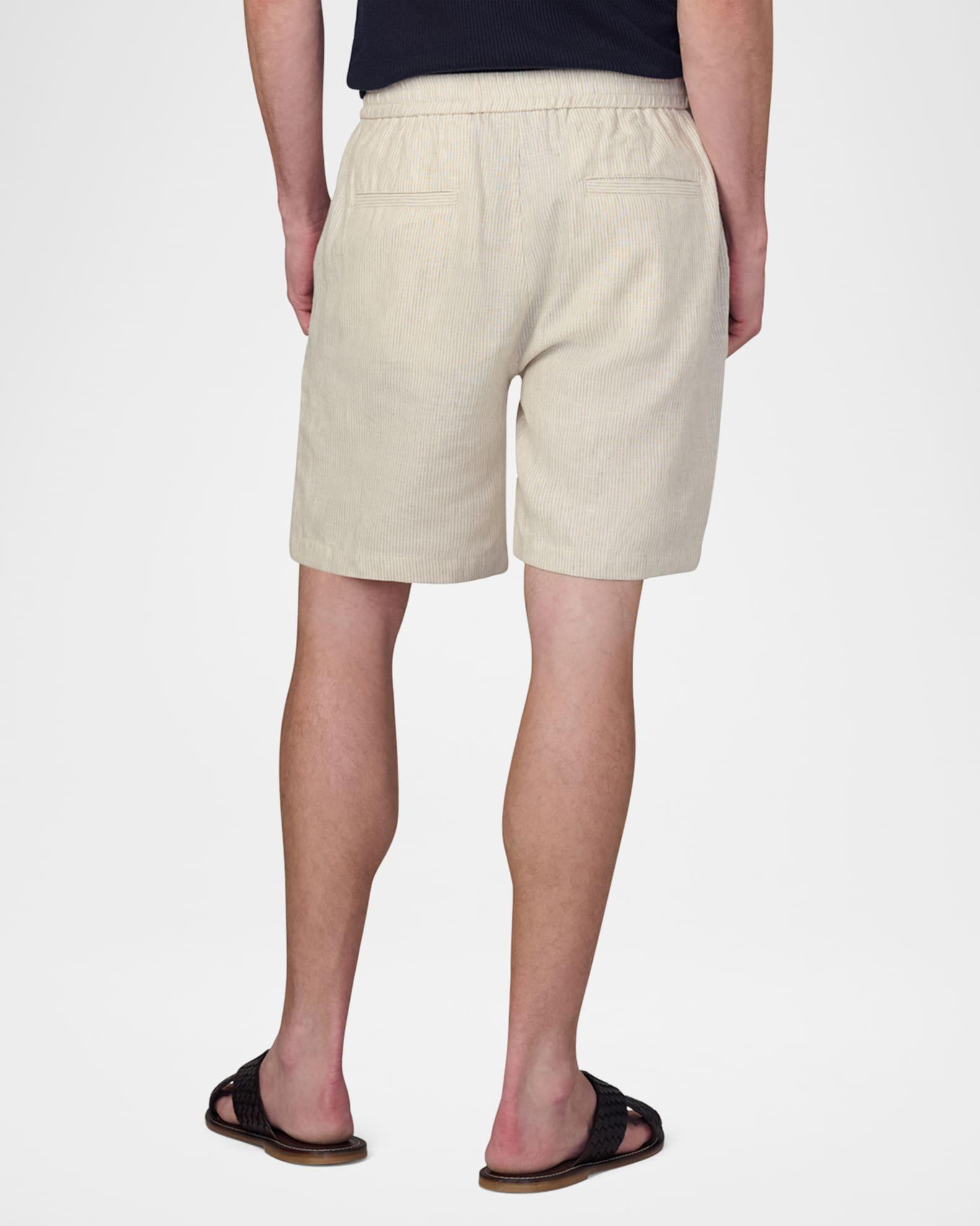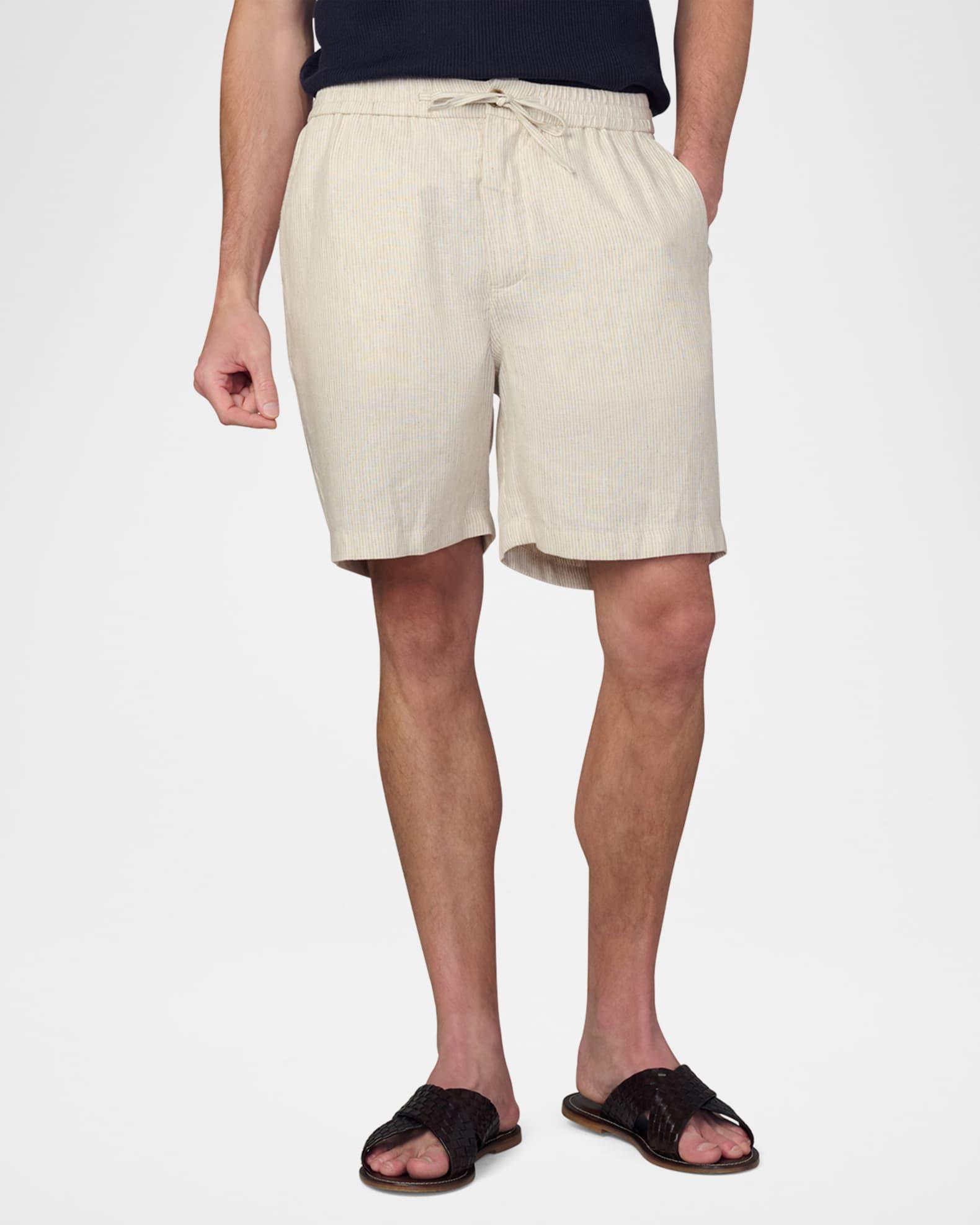 Joe's Jeans shorts in lightweight linen revealed with a micro-stripe pattern Regular rise Flat front Side slip pockets Back welt pockets Relaxed fit Elasticized drawstring waistband Button-zip front Linen Machine wash cold, wash inside out Imported