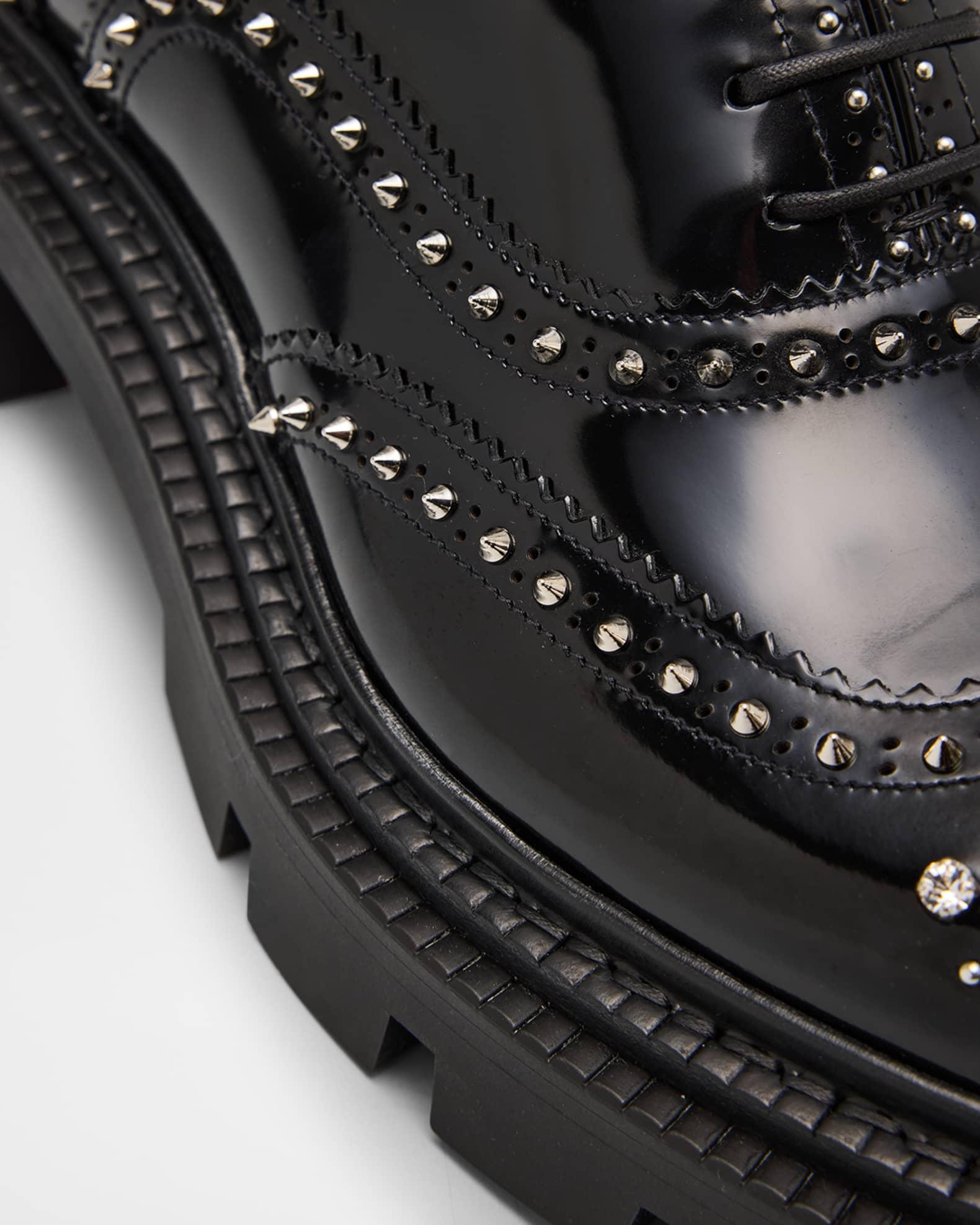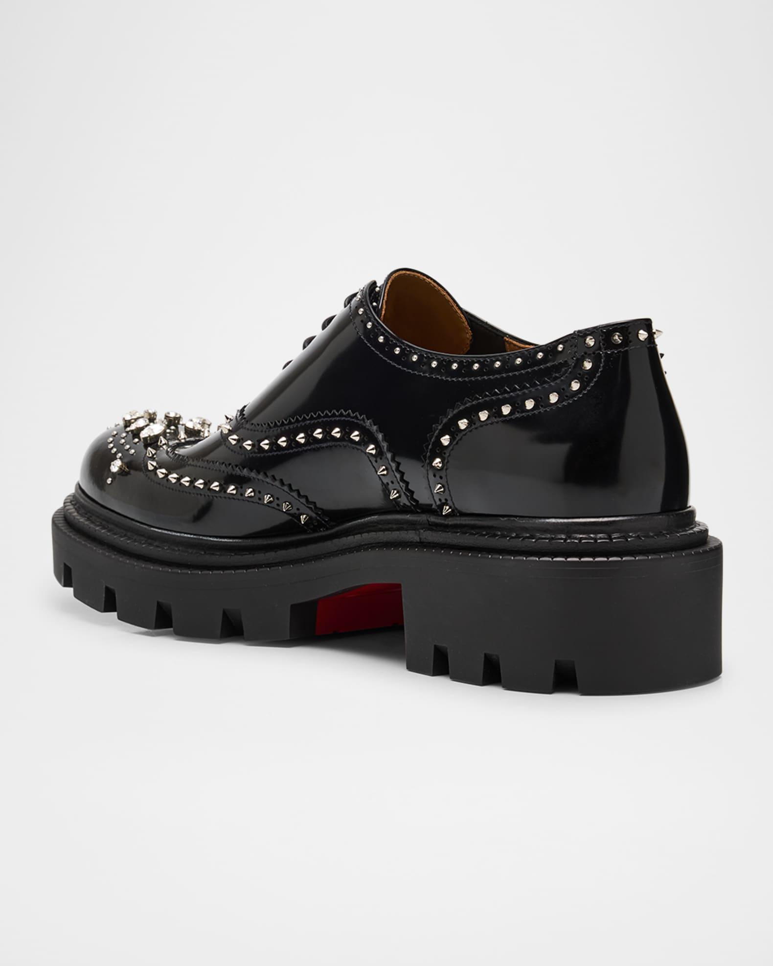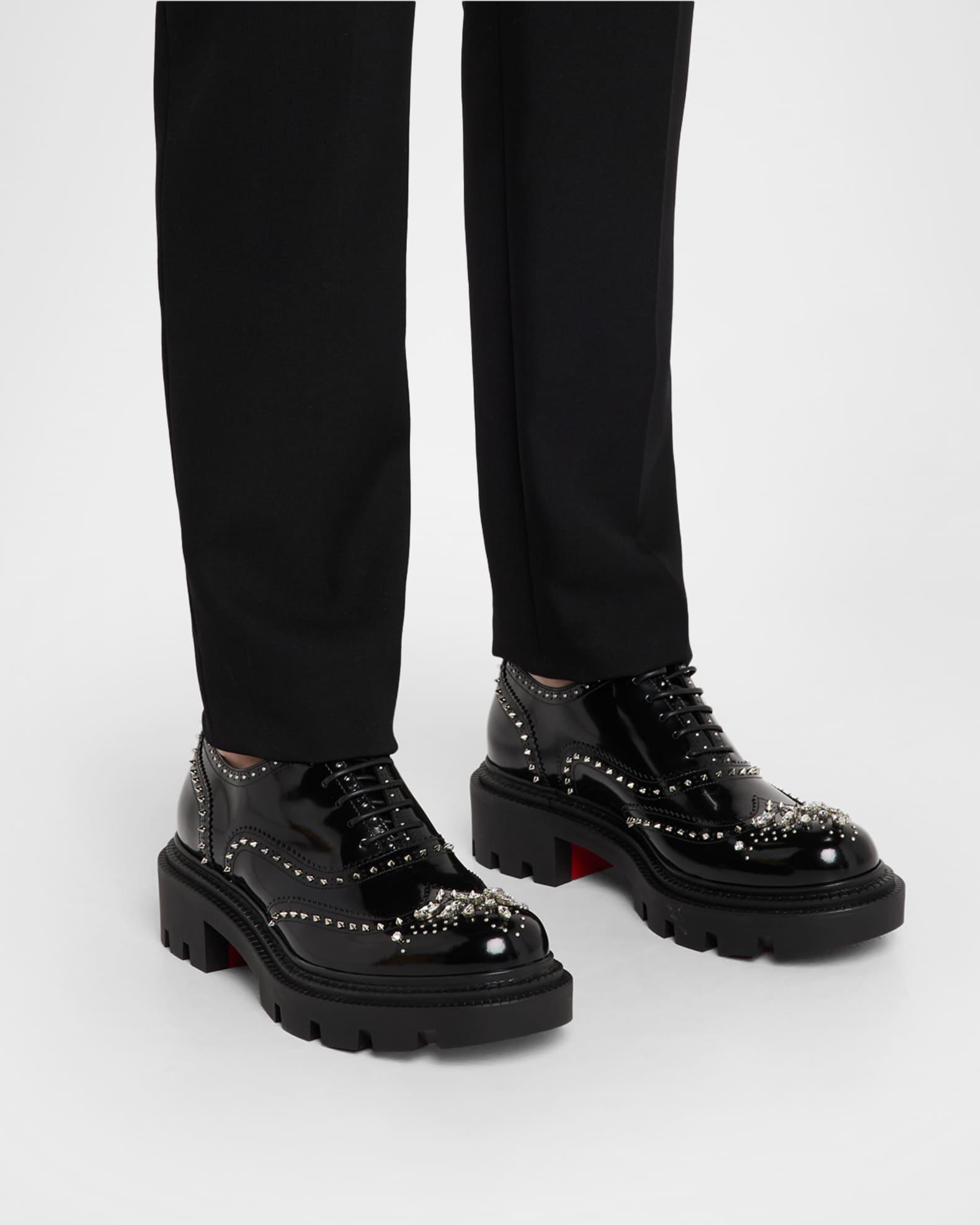 Inspired by the urban lines of the Penny Loafer, the College Strass lace-up shoe is crafted from black calf leather decorated with strass, crystals, and spikes. Enhanced by a discreet finish and openwork, this refined Maison Christian Louboutin model is set on a notched sole. Christian Louboutin "College Strass" Oxfords in shiny calf leather Features crystal, stud, & spike embellishment Chunky heel Round toe Lace-up vamp Signature Loubi red notched sole Made in Italy