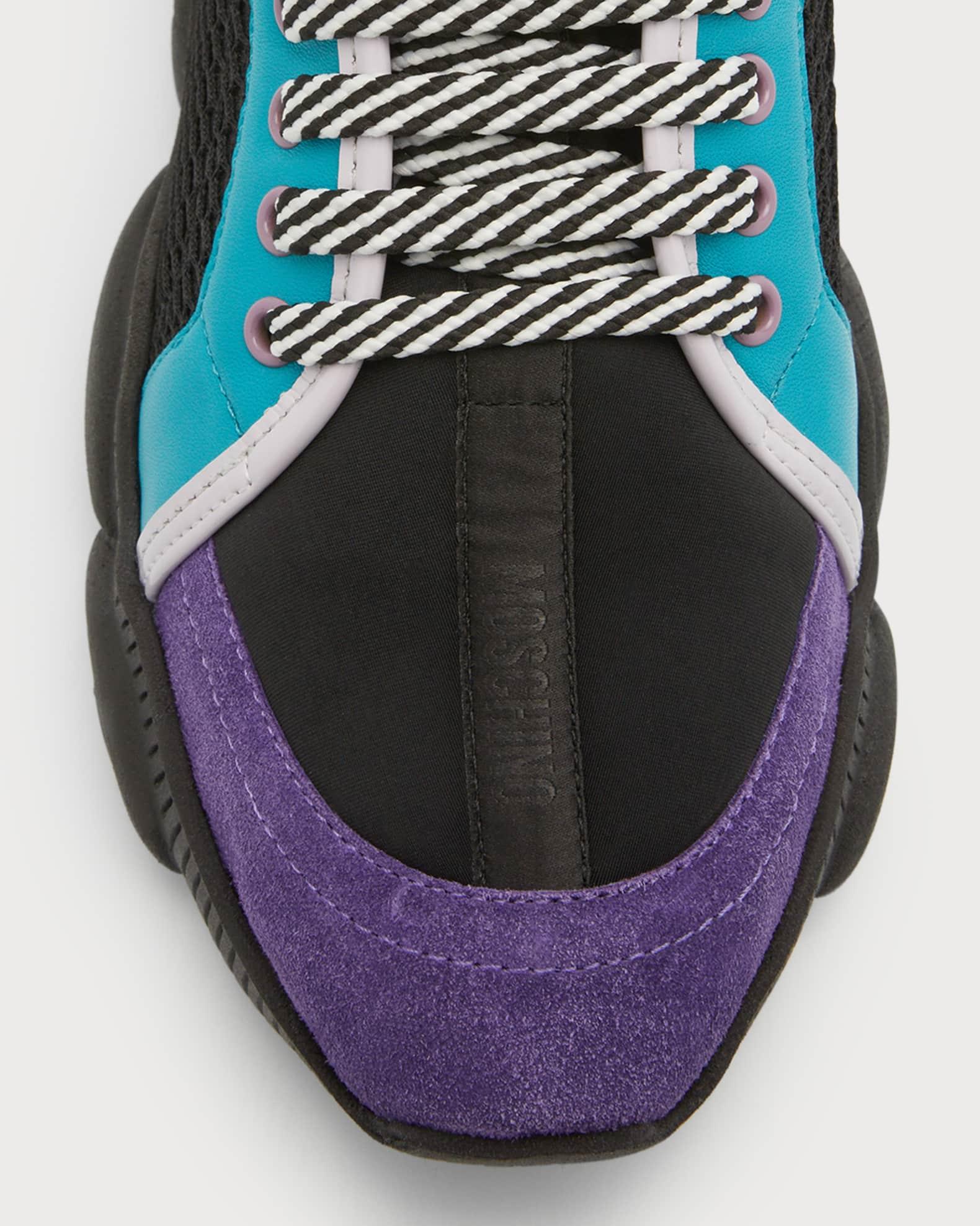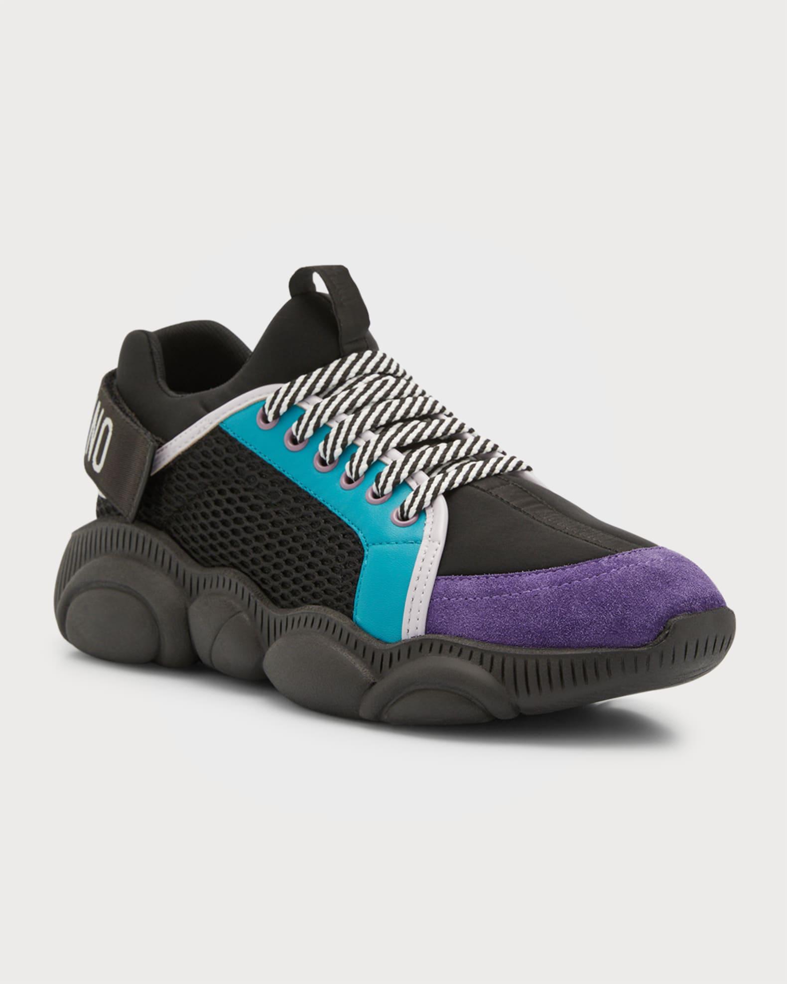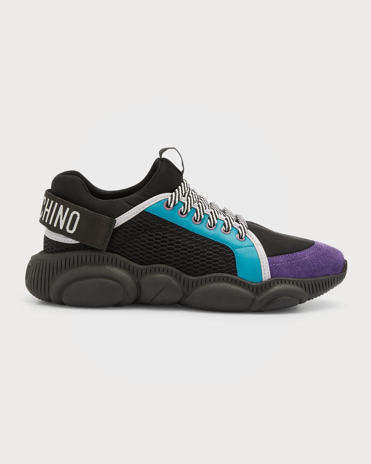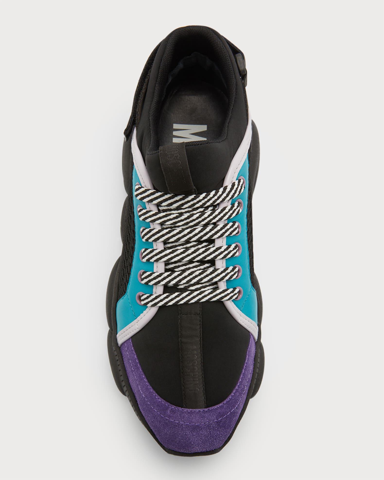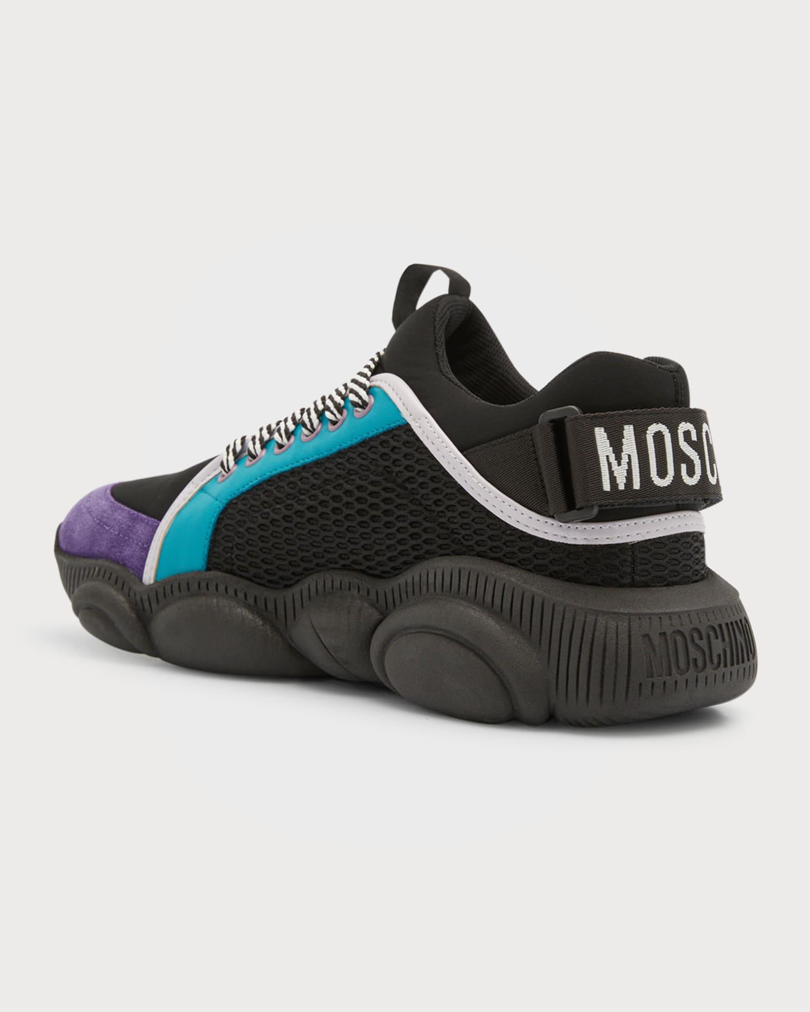 Moschino low-top fashion sneakers with mesh-textile upper and leather color block overlays Flat chunky heel Reinforced round toe Lace-up vamp Tonal jacquard logo center strip along vamp Padded collar Adjustable logo grip strap at backstay Debossed logo lettering at heel Signature rubber Teddy outsole Made in Italy