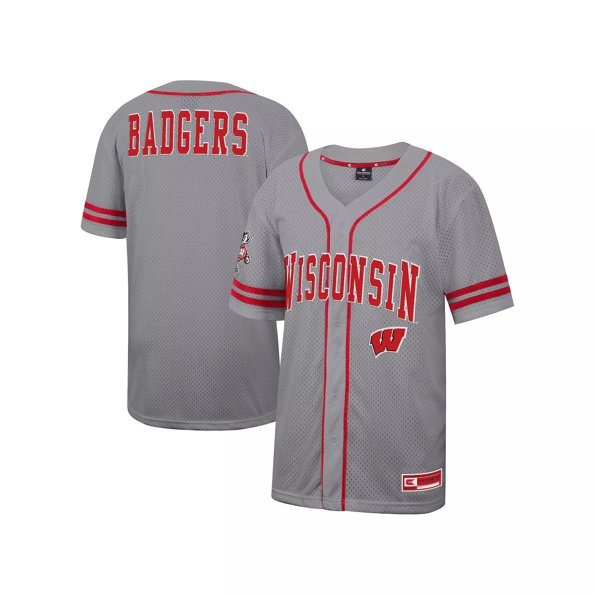 Get ready for the next Wisconsin Badgers game with this Free Spirited Baseball Jersey from Colosseum. This stylish baseball jersey features a breathable full mesh body and sleeves to keep you cool and comfortable. The twill applique team name across the front and upper back makes a bold statement, while the embroidered team logo on the right sleeve adds a touch of classic style.Get ready for the next Wisconsin Badgers game with this Free Spirited Baseball Jersey from Colosseum. This stylish baseball jersey features a breathable full mesh body and sleeves to keep you cool and comfortable. The twill applique team name across the front and upper back makes a bold statement, while the embroidered team logo on the right sleeve adds a touch of classic style.PRODUCT FEATURESOfficially licensedMachine wash gentle or dry clean. Tumble dry low, hang dry preferred.Brand: ColosseumWoven jock tag at hemEmbroidered team logo on right sleeveFashion JerseySewn-on placket trims and sleeve stripesTwill applique team name across the front and upper backMaterial: 100% PolyesterImportedBreathable full mesh body and sleeves Color: Grey. Gender: male. Age Group: adult. Material: COTTON.