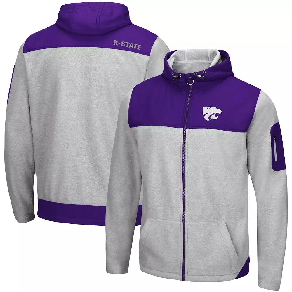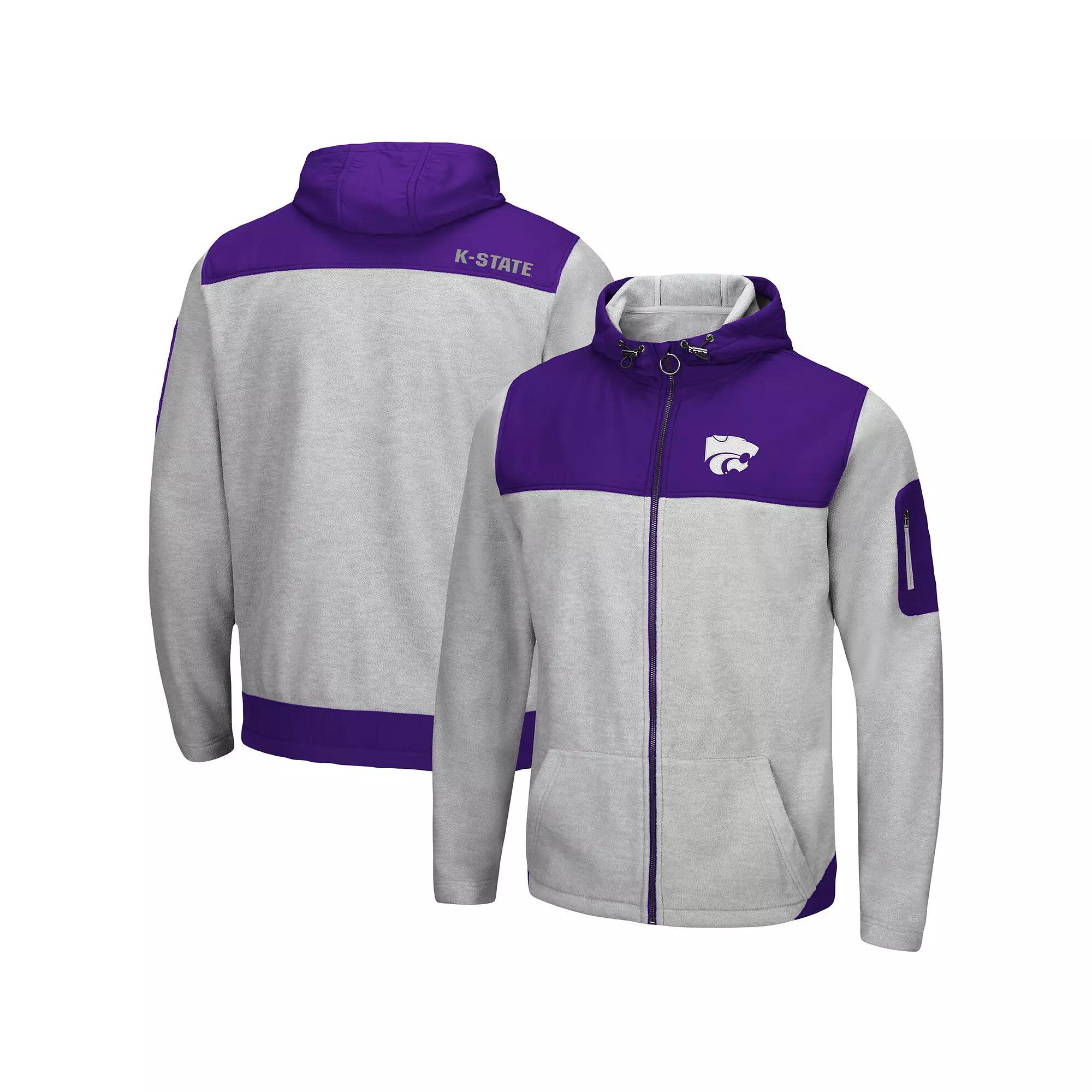 When cooler temperatures arrive, showcase your Kansas State Wildcats spirit in this Schwartz hoodie by Colosseum. Its soft, heathered fabric is enhanced by contrasting, team-colored panels complete with Kansas State Wildcats graphics on the front and back. The two front pockets are accompanied by an additional sleeve pocket, which adds a practical design detail to this eye-catching full-zip hoodie.When cooler temperatures arrive, showcase your Kansas State Wildcats spirit in this Schwartz hoodie by Colosseum. Its soft, heathered fabric is enhanced by contrasting, team-colored panels complete with Kansas State Wildcats graphics on the front and back. The two front pockets are accompanied by an additional sleeve pocket, which adds a practical design detail to this eye-catching full-zip hoodie.Officially licensedImportedLong sleeveVertical zippered pocket on left sleeveTwo front pocketsZipper garageFront and back yoke seamsMaterial: 100% PolyesterFull-zipBrand: ColosseumMidweight hoodie suitable for moderate temperaturesScuba hood with adjustable togglesTagless CollarScreen print graphics Color: Grey. Gender: male. Age Group: adult.
