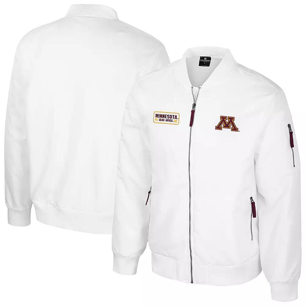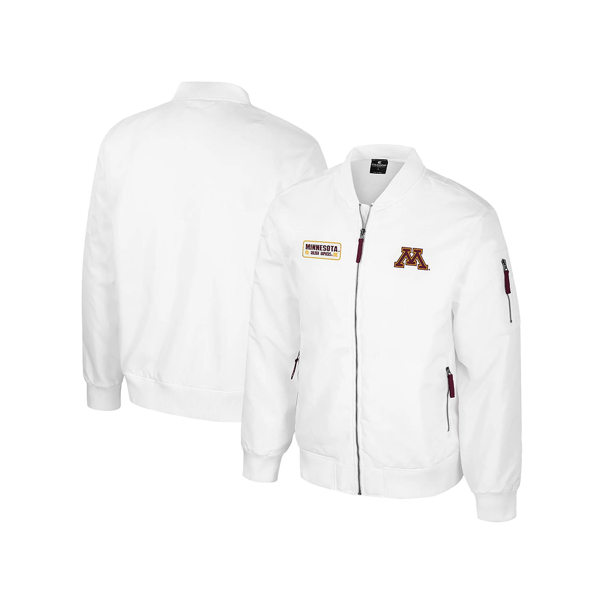 Elevate your Minnesota Golden Gophers game day style with this Colosseum White Rabbit Full-Zip Bomber Jacket. This stylish bomber jacket features embroidered Minnesota Golden Gophers graphics on the left chest and a tackle twill applique team wordmark on the right chest. With rib-knit cuffs, a stand-up collar, and hem, this jacket will keep you warm and comfortable while you cheer on the Minnesota Golden Gophers.Elevate your Minnesota Golden Gophers game day style with this Colosseum White Rabbit Full-Zip Bomber Jacket. This stylish bomber jacket features embroidered Minnesota Golden Gophers graphics on the left chest and a tackle twill applique team wordmark on the right chest. With rib-knit cuffs, a stand-up collar, and hem, this jacket will keep you warm and comfortable while you cheer on the Minnesota Golden Gophers.PRODUCT FEATURESLong sleeveMachine wash, tumble dry lowOfficially licensedMaterial: 100% Nylon - Body; 100% Polyester - LiningTwo zippered front pockets for extra warmth or storing essentialsBrand: ColosseumRib-knit cuffs, stand-up collar and hem for a secure fitEmbroidered tackle twill applique team wordmark graphic on right chestFull ZipImportedMidweight jacket suitable for moderate temperaturesEmbroidered team logo graphics on left chestZippered pocket on left arm Size: XL. Gender: male. Age Group: adult. Material: COTTON.