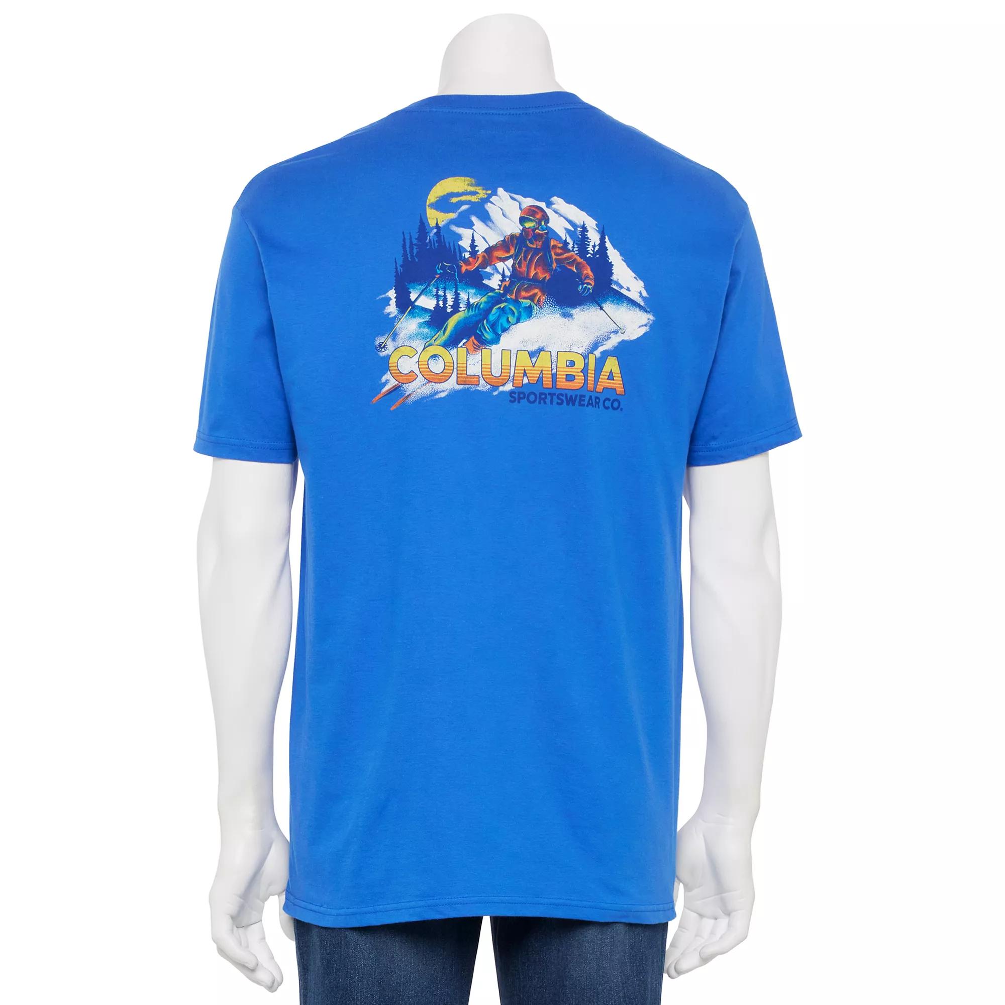 Showcase your outdoorsy style in this Mens Columbia Short Sleeve Graphic Tee. Showcase your outdoorsy style in this Mens Columbia Short Sleeve Graphic Tee. FEATURES Crewneck Short sleevesFIT & SIZING Classic fitFABRIC & CARE Cotton; cotton, polyester Machine wash Imported Color: Med Blue. Gender: male. Age Group: adult. Material: Cotton Blend.
