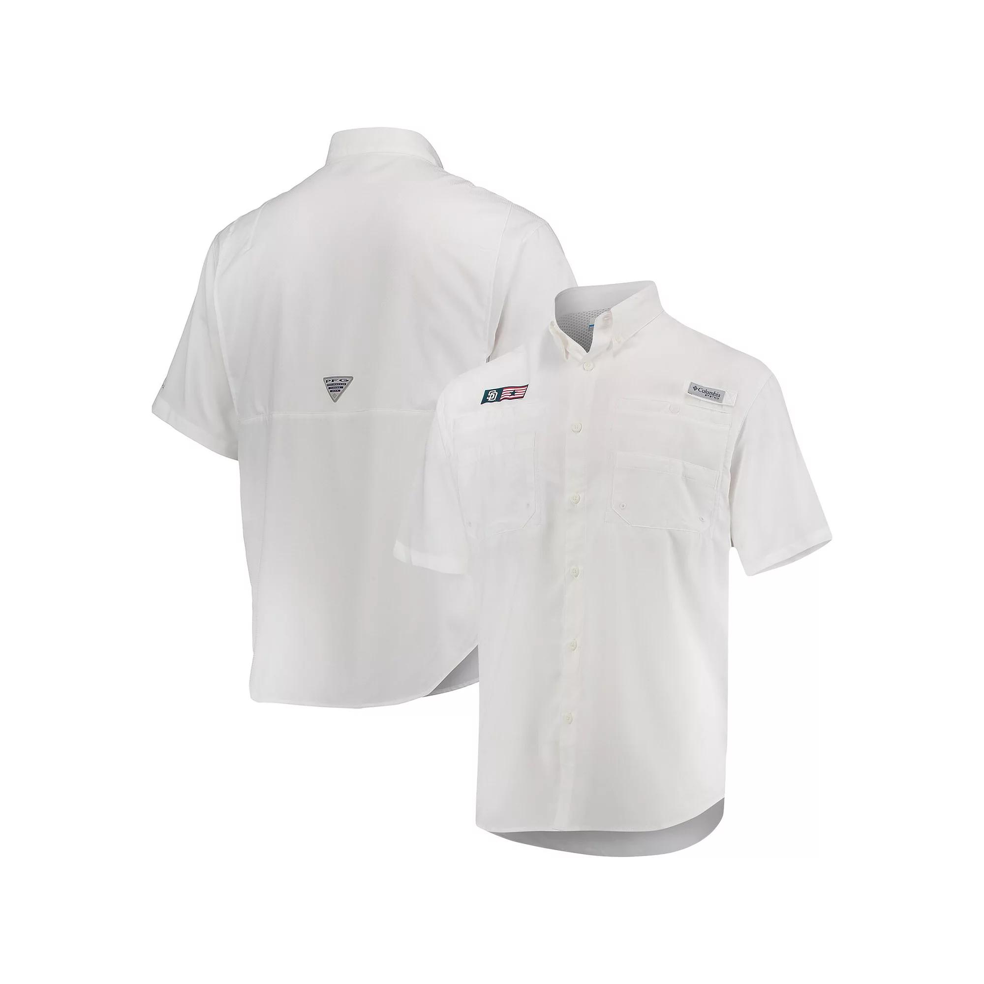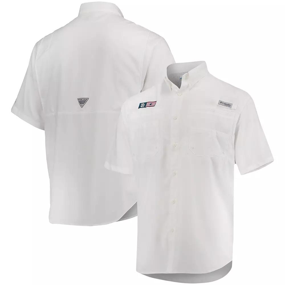 Root for the San Diego Padres with Columbia's Americana Tamiami button-down shirt. Sunny game days won't be a concern thanks to the short sleeves, lightweight material and Omni-Shade technology, which blocks UV rays. Nobody will doubt where your loyalty lies thanks to the shirt's heat-sealed San Diego Padres graphics.