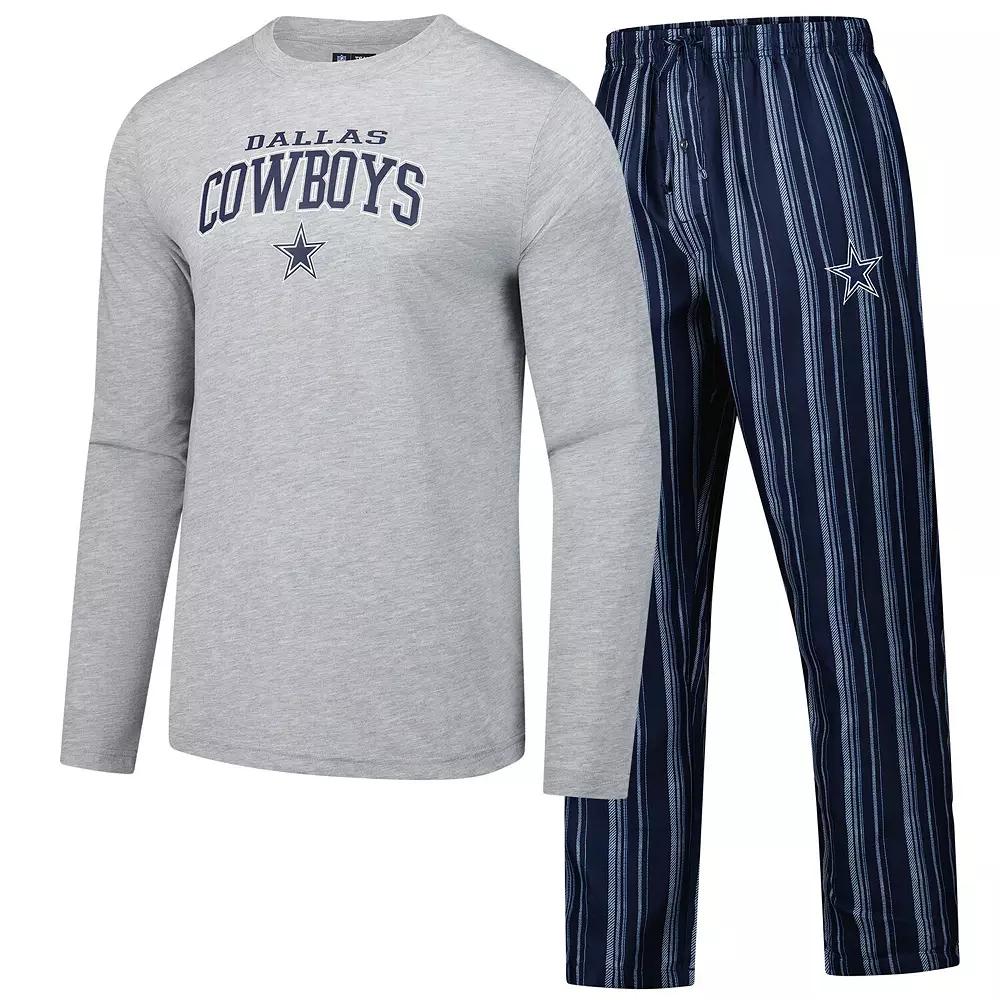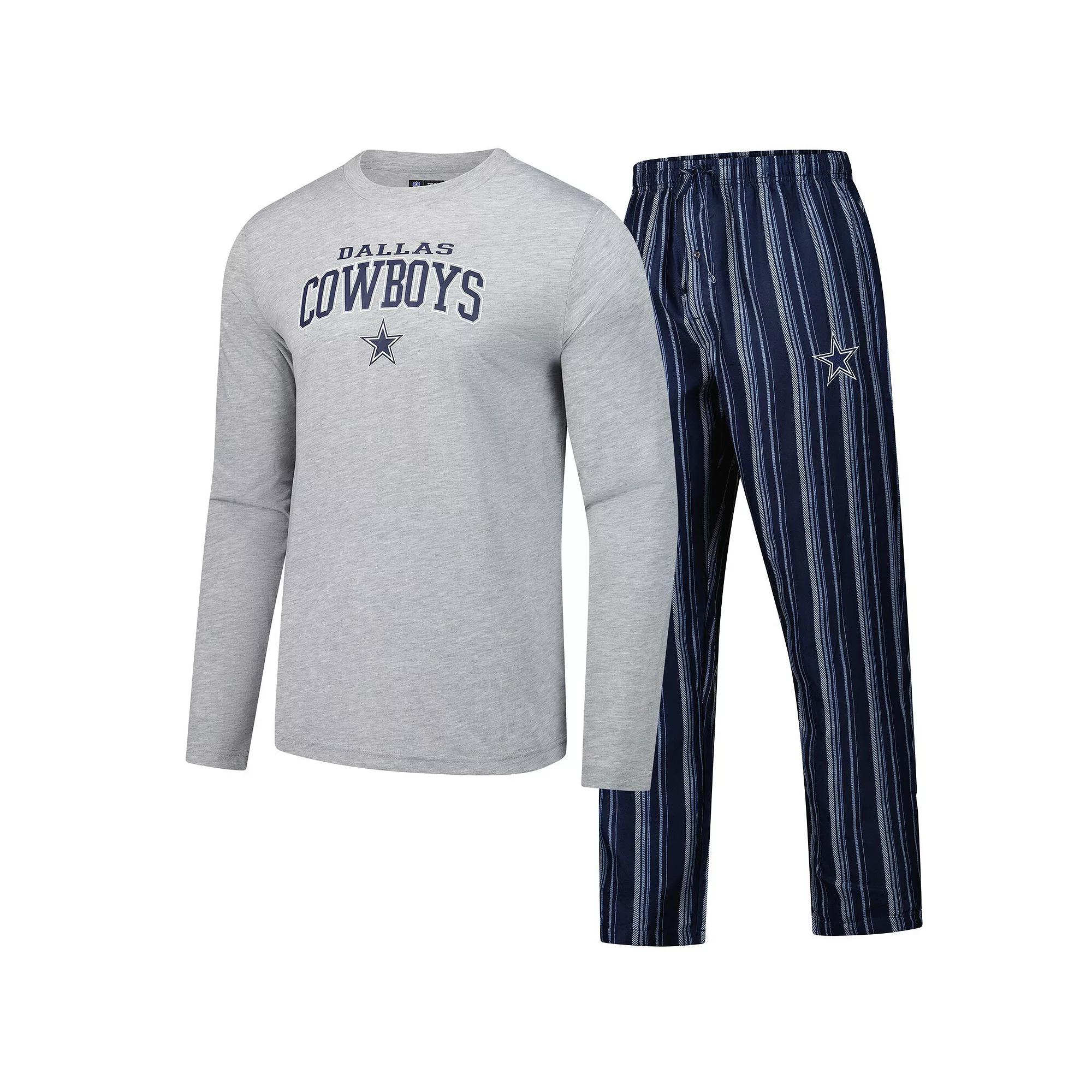 Settle in for a good night's sleep and sweet dreams of victory with this Dallas Cowboys Petition Long Sleeve T-Shirt & Pants Sleep Set from Concepts Sport. Made from a blend of soft cotton and polyester, this sleep set provides a comfortable and breathable feel for a restful night's sleep. With screen print graphics on the shirt and an embroidered graphic on the pants, you can show off your Dallas Cowboys pride all night long.Settle in for a good night's sleep and sweet dreams of victory with this Dallas Cowboys Petition Long Sleeve T-Shirt & Pants Sleep Set from Concepts Sport. Made from a blend of soft cotton and polyester, this sleep set provides a comfortable and breathable feel for a restful night's sleep. With screen print graphics on the shirt and an embroidered graphic on the pants, you can show off your Dallas Cowboys pride all night long.PRODUCT FEATURESEmbroidered graphic on upper left pant legMaterial: 65% Polyester/35% Rayon - Top; 100% Polyester - BottomCrew neck provides a traditional look and is comfortable to wear all daySize M inseam measures approx. 30.5ImportedMachine wash, tumble dry lowLong sleeveBrand: Concepts SportDrawstring in waistband for a customizable fitSet includes T-shirt and one pair of pantsScreen print graphics on shirt frontOfficially licensedOne-button fly Color: Navy. Gender: male. Age Group: adult.