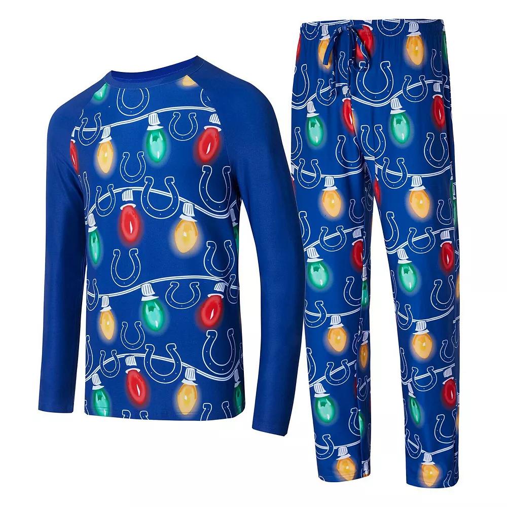 Enjoy ultimate comfort while repping your Indianapolis Colts with this Concepts Sport Garland Knit Raglan Long Sleeve T-Shirt and Pants Set. Made from a blend of soft cotton and polyester, this sleep set provides ultimate comfort for those relaxing nights in. The raglan sleeves offer a roomier, relaxed fit, while the all-over repeating graphics of the team logo and string lights add a festive touch.Enjoy ultimate comfort while repping your Indianapolis Colts with this Concepts Sport Garland Knit Raglan Long Sleeve T-Shirt and Pants Set. Made from a blend of soft cotton and polyester, this sleep set provides ultimate comfort for those relaxing nights in. The raglan sleeves offer a roomier, relaxed fit, while the all-over repeating graphics of the team logo and string lights add a festive touch.PRODUCT FEATURESMachine wash, tumble dry lowLong sleeveSolid color raglan sleeves for a roomier fitImportedOfficially licensedMaterial: 92% Polyester/8% SpandexElastic waistband with drawstringSize M inseam measures approx. 31.5Crew neckSet includes long sleeve T-shirt and pantsAll-over repeating graphics of team logo and string lightsBrand: Concepts Sport Size: XL. Color: Blue. Gender: male. Age Group: adult.