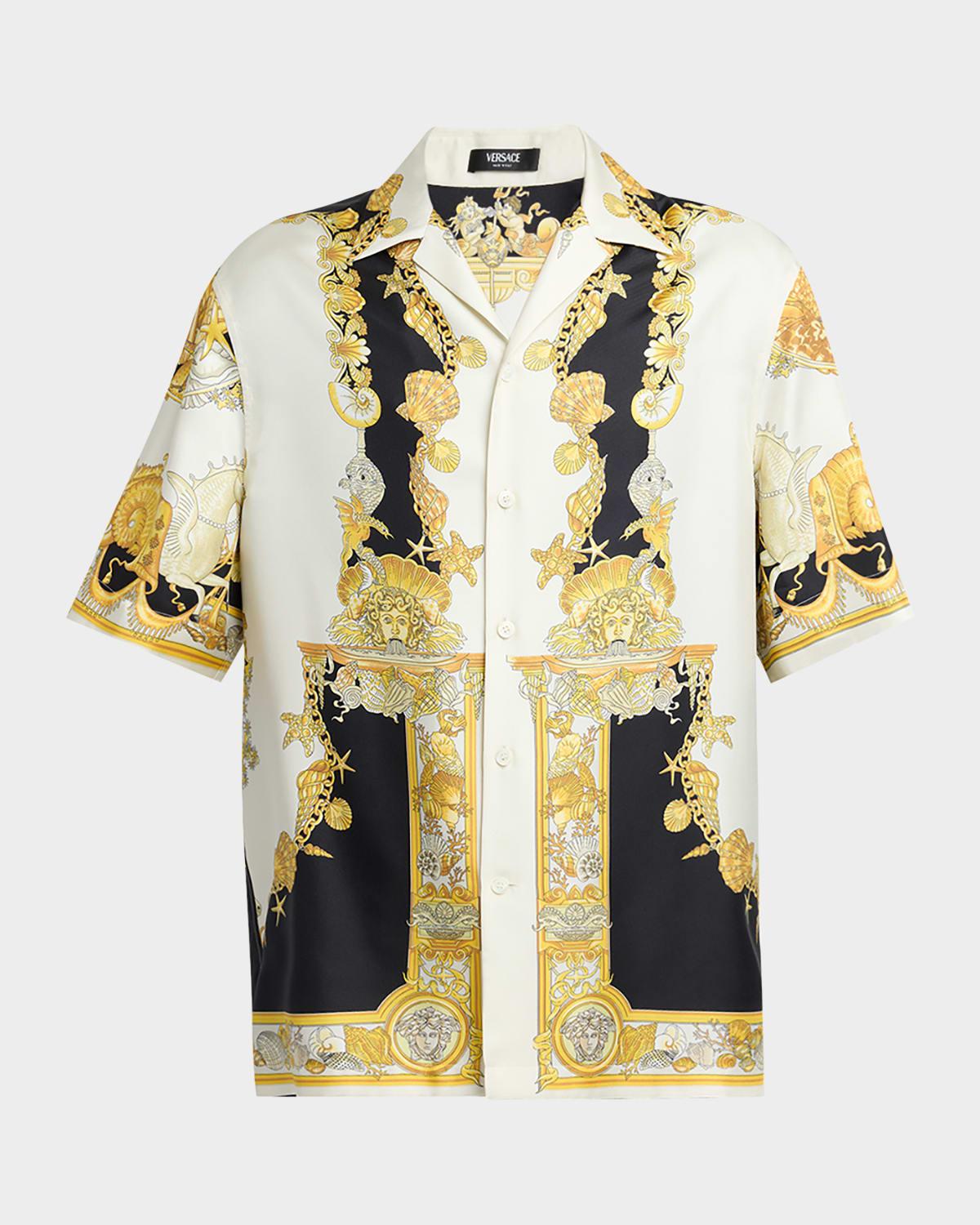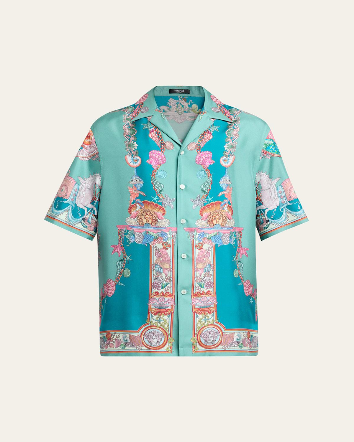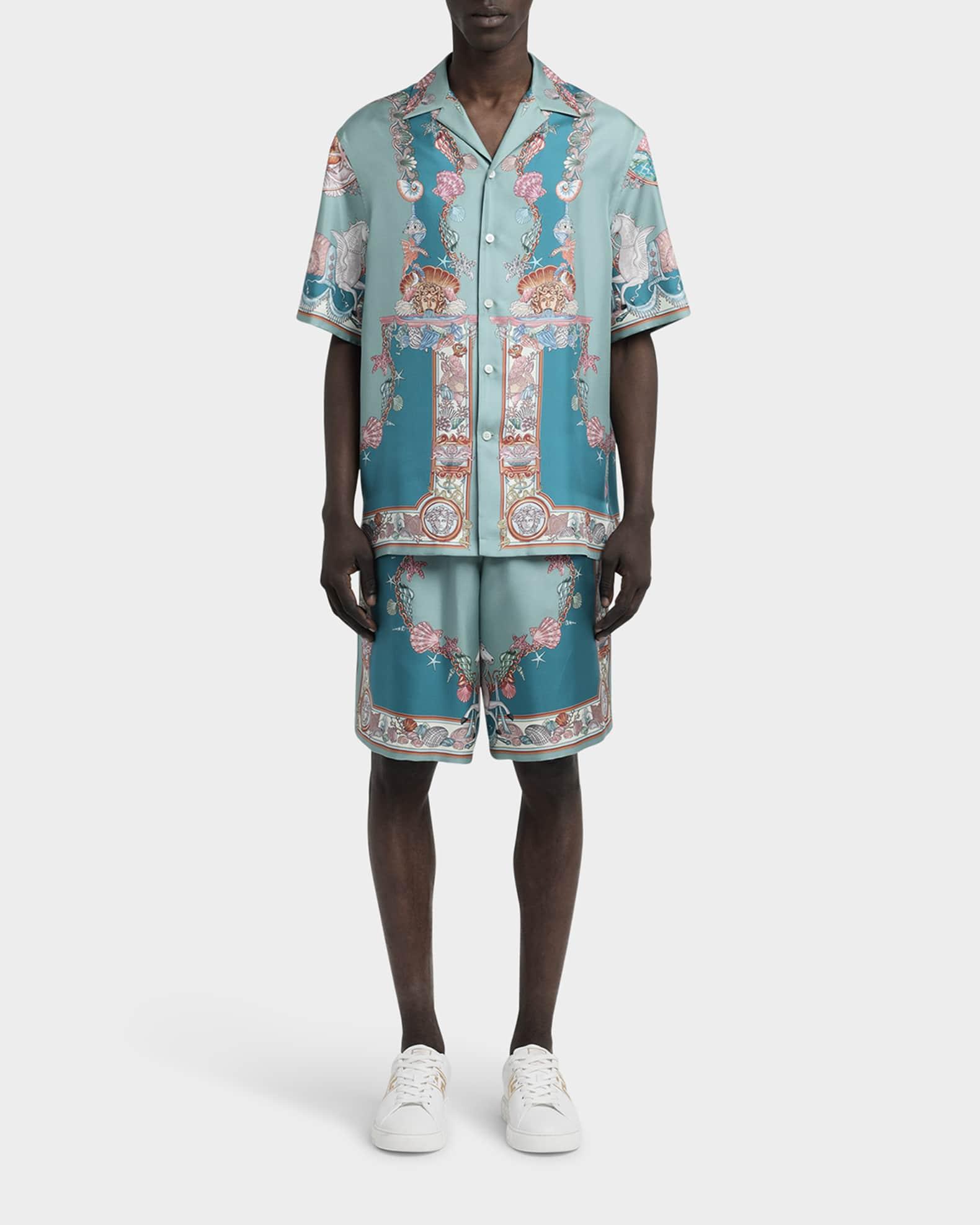 Versace camp shirt from the La Vacanza Collection Coral Theatre print depicting corals, shells, and mermaids with theatrical elements Notched collar Button-down front Short sleeves Relaxed fit Silk Professionally clean Made in Italy