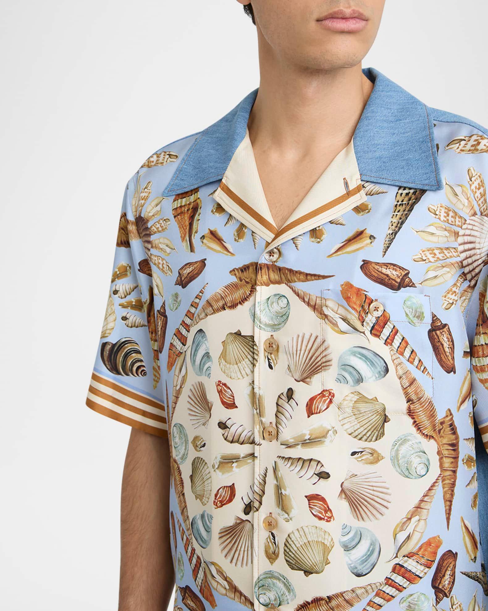 Dolce&Gabbana camp shirt in sumptuous silk defined by a bold shoreline print Denim detailing on the collar and back Notch collar Button placket Chest pocket Short sleeves Logo plaqué on the back yoke with knife pleats Uneven vented sides Cotton/silk Made in Italy
