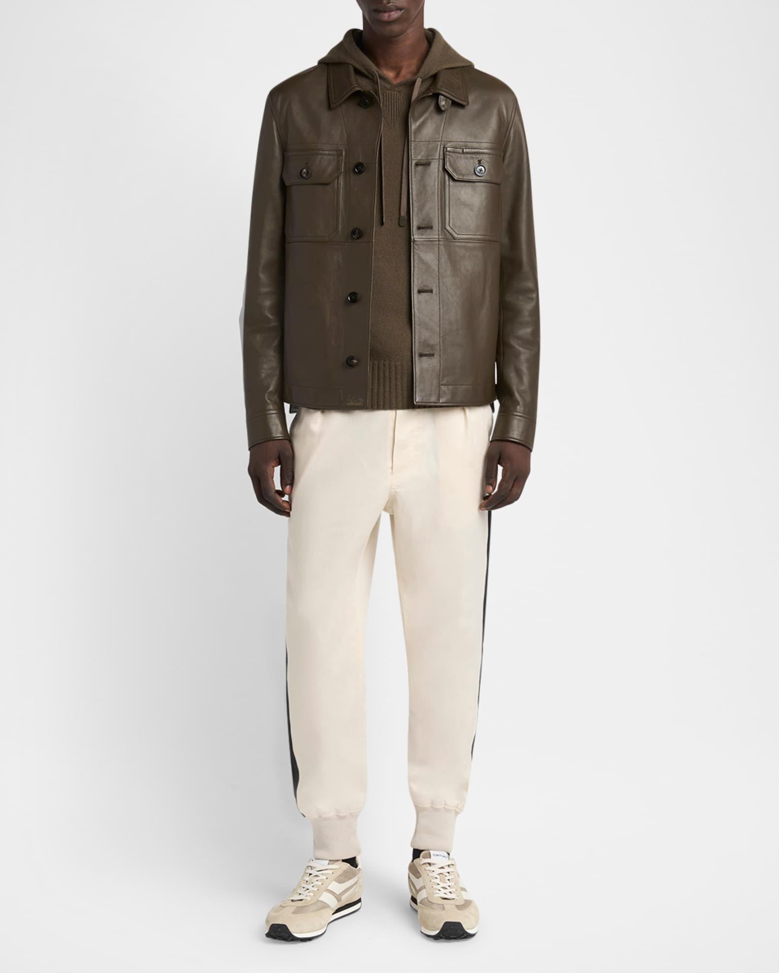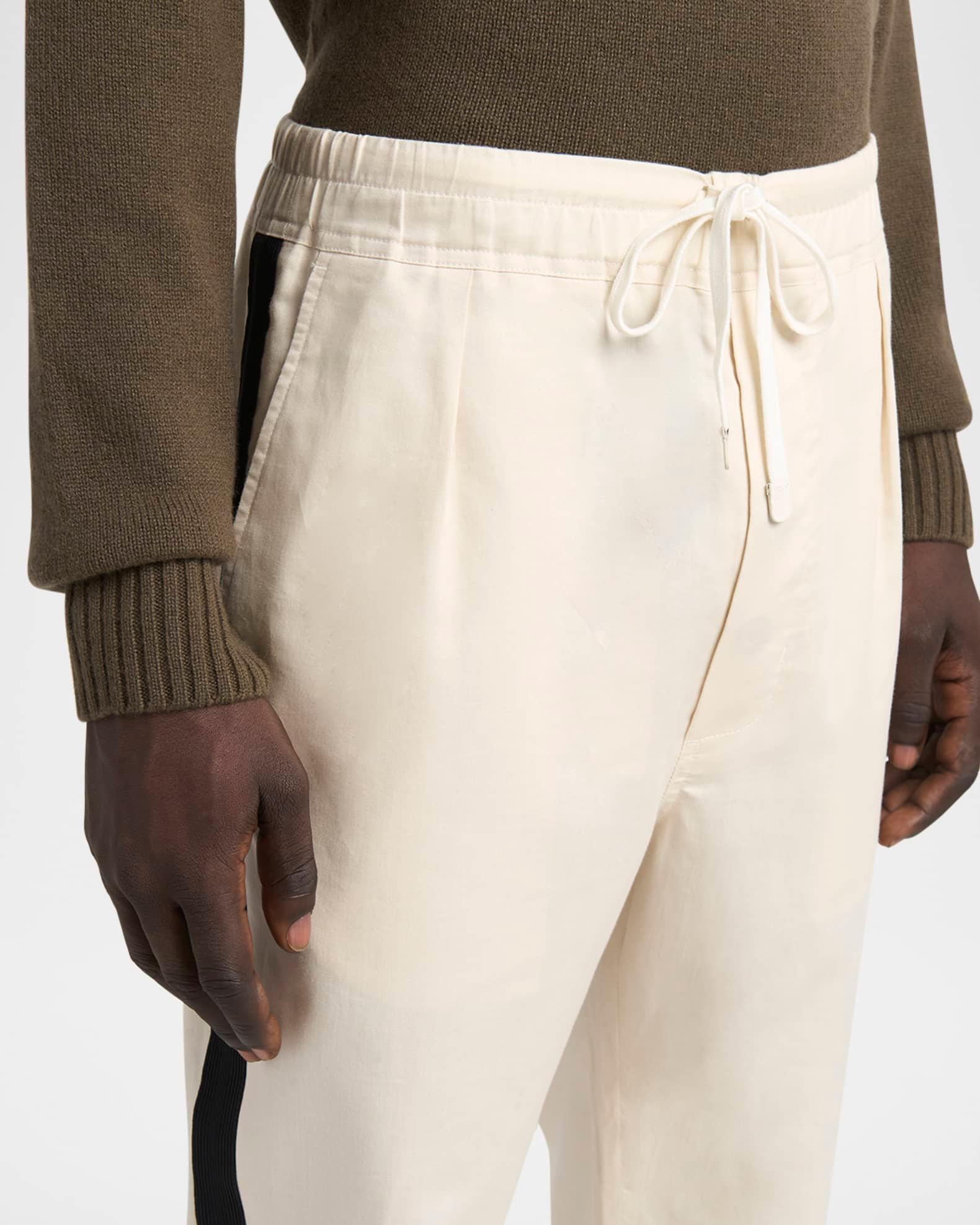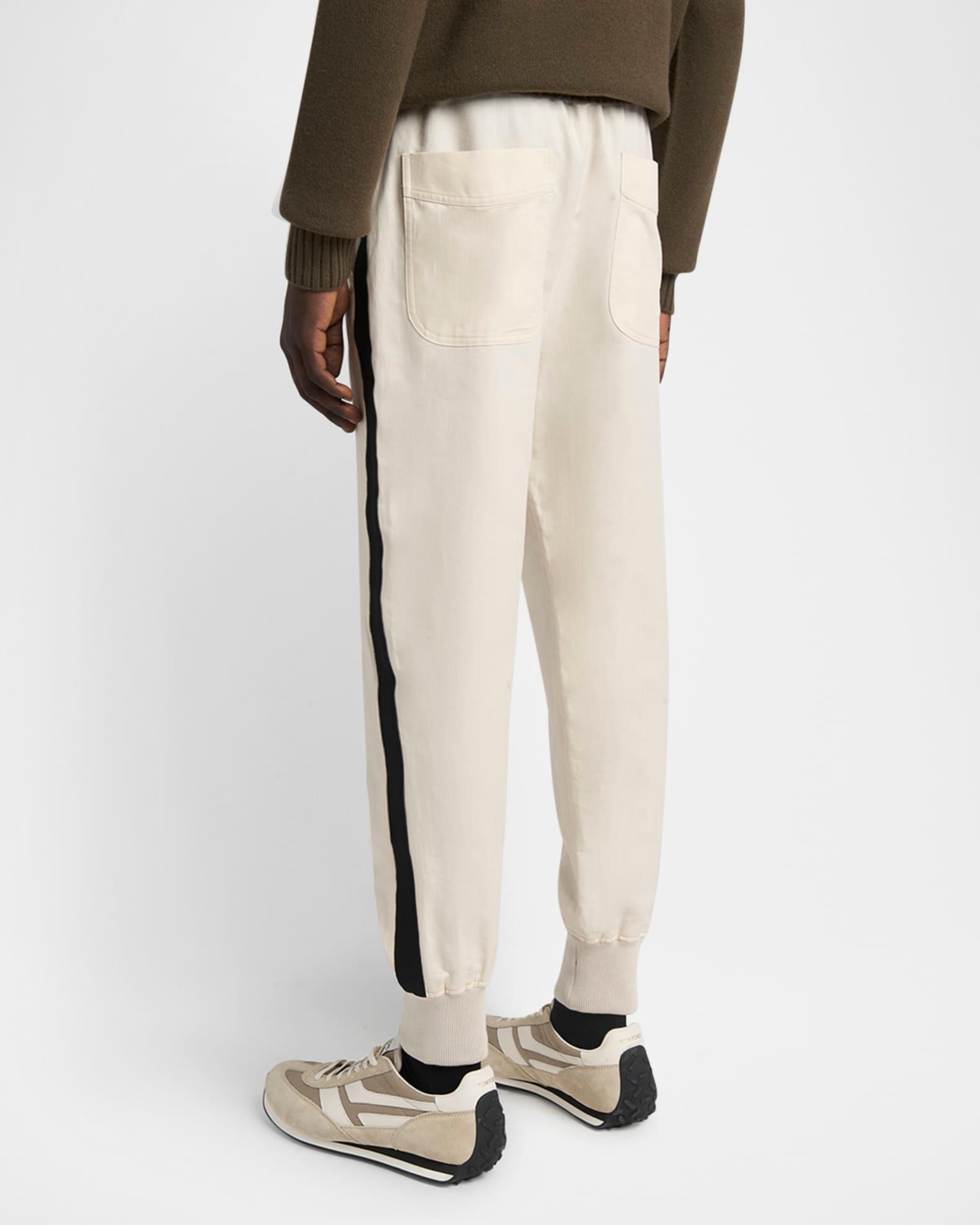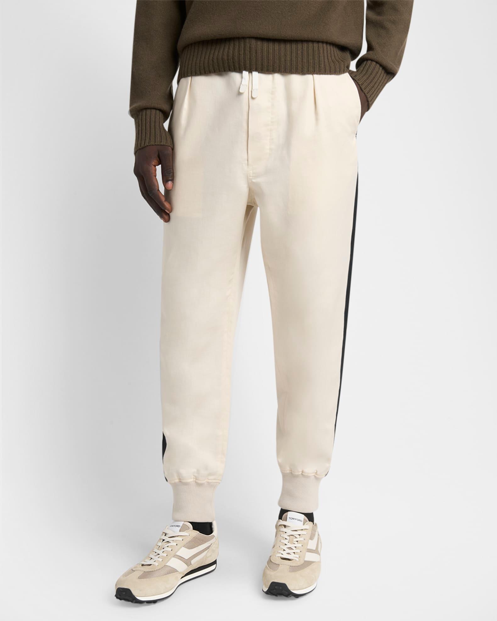 TOM FORD jogger pants in cotton and silk twill resulting in a natural sheen Highlighted with a wide contrast side stripe Regular rise Single-pleated front Side slip pockets Back patch pockets Classic fit through tapered legs Ribbed cuffs Full length Elasticized drawstring waistband Pull-on style Cotton/silk Unlined Professional cleaning recommended, wash inside out Made in Italy Proposition 65 warning for California residents