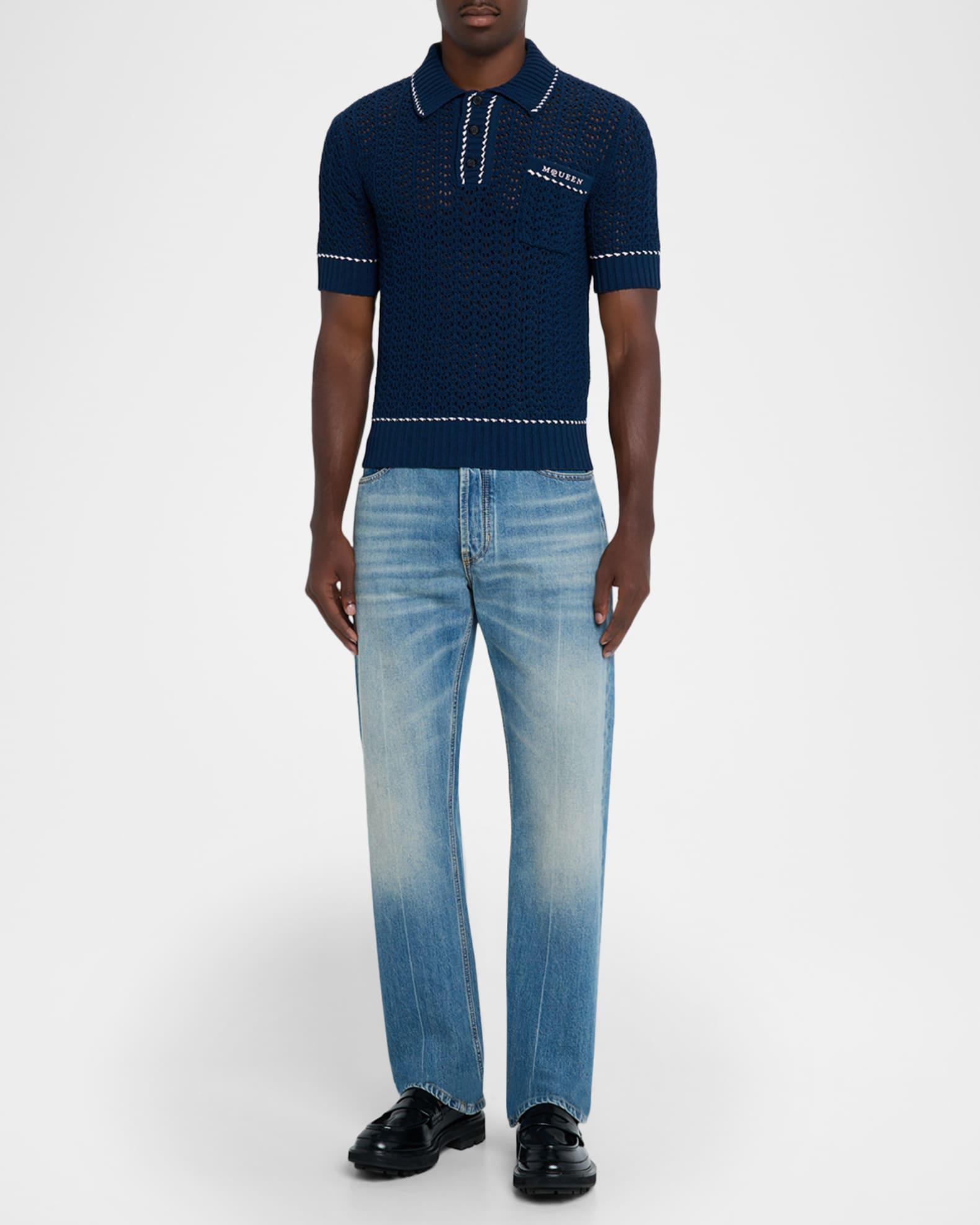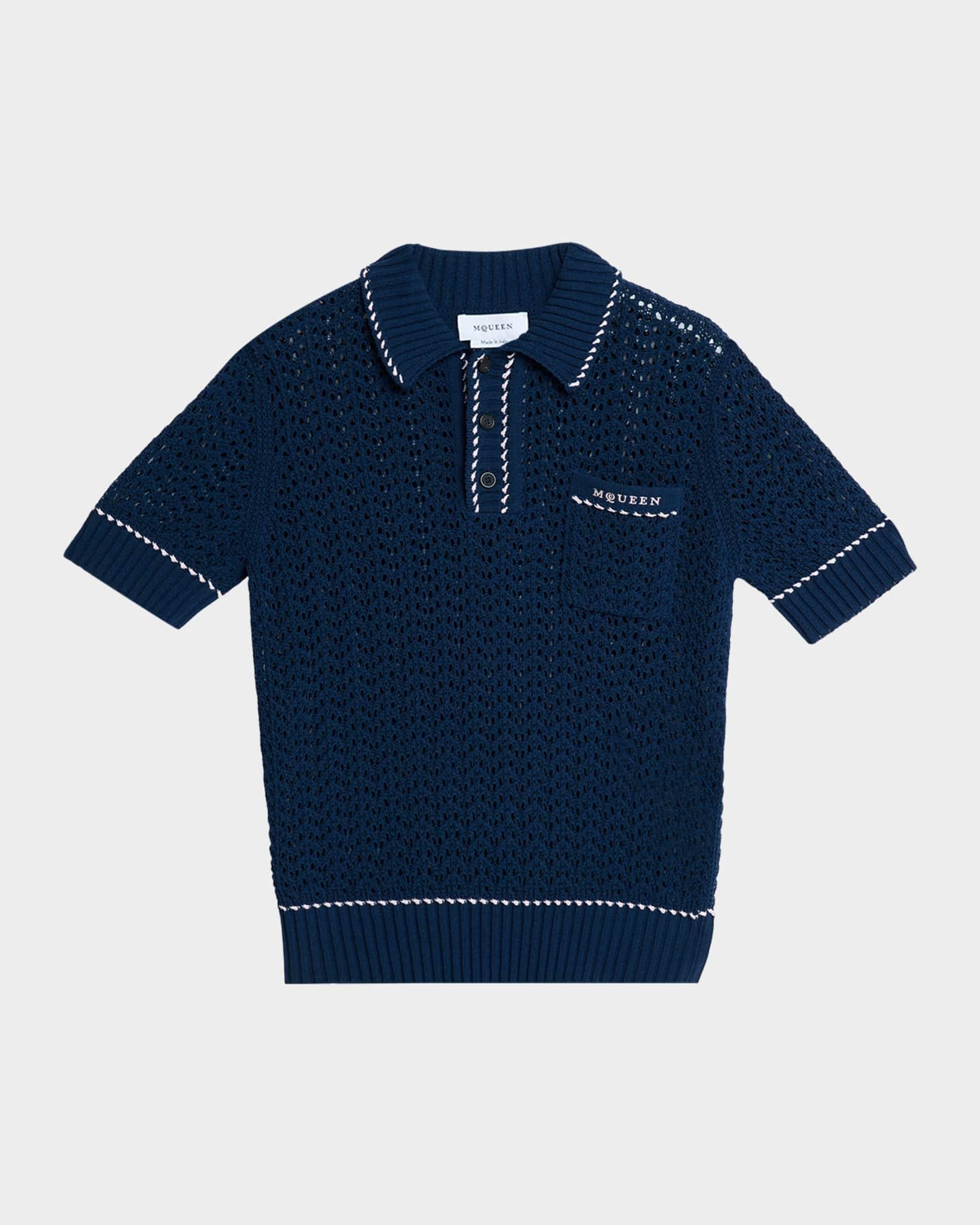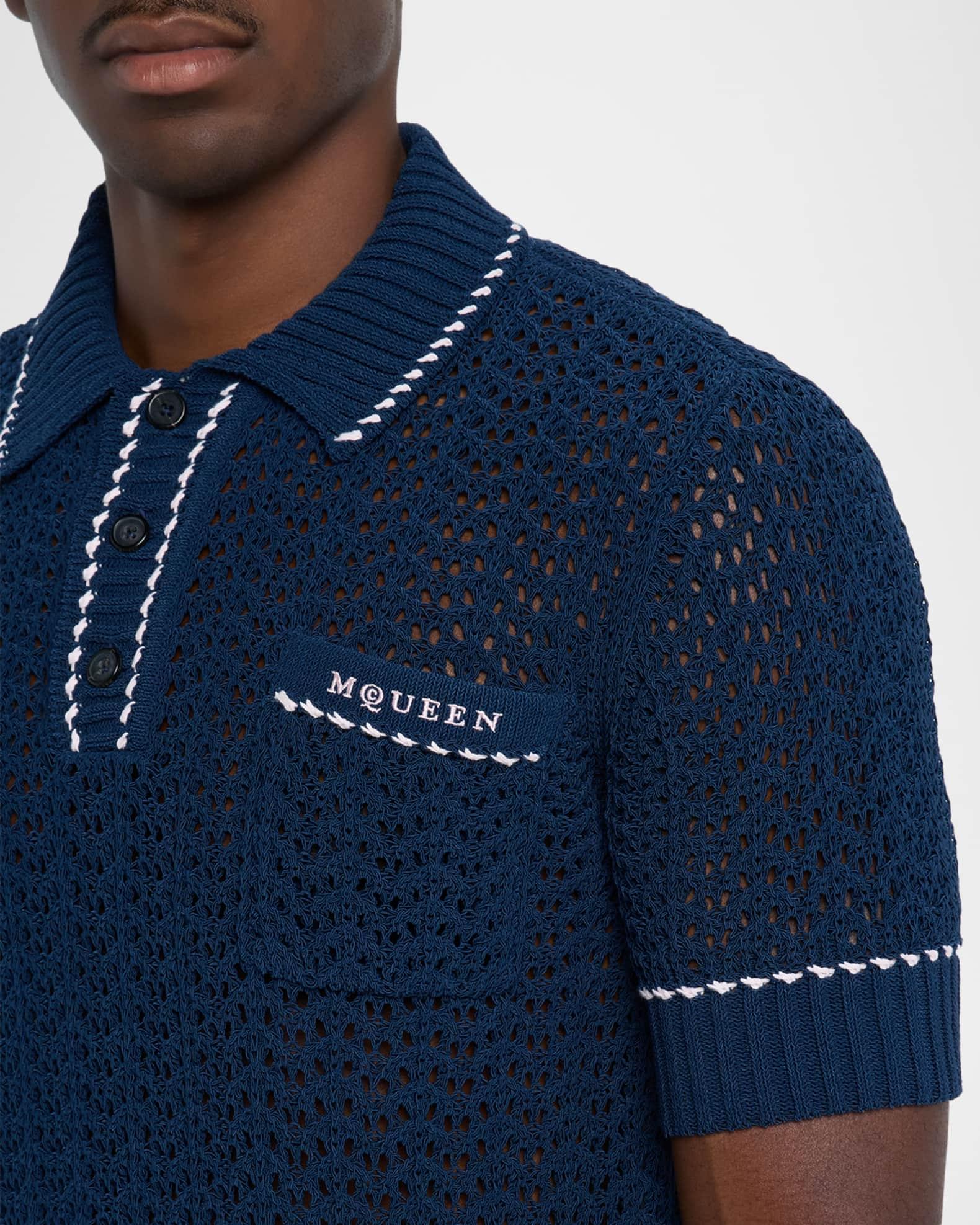 McQueen crochet knit polo sweater highlighted with contrasting stripe stitched trim Chest pocket with signature logo Ribbed collar Three-button placket Short sleeves Ribbed cuffs and hem Pullover style Cotton/nylon/polyamide Dry clean Made in Italy