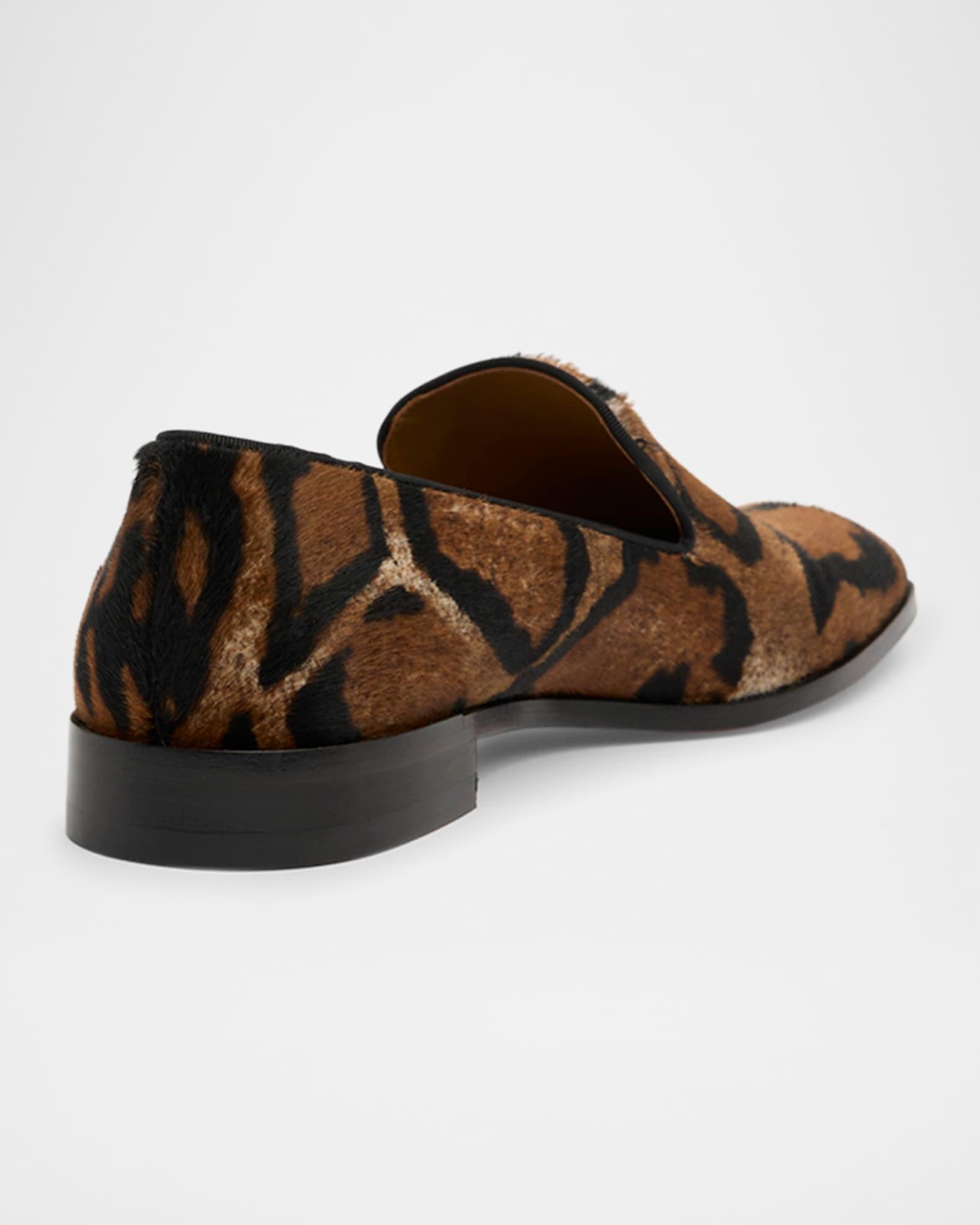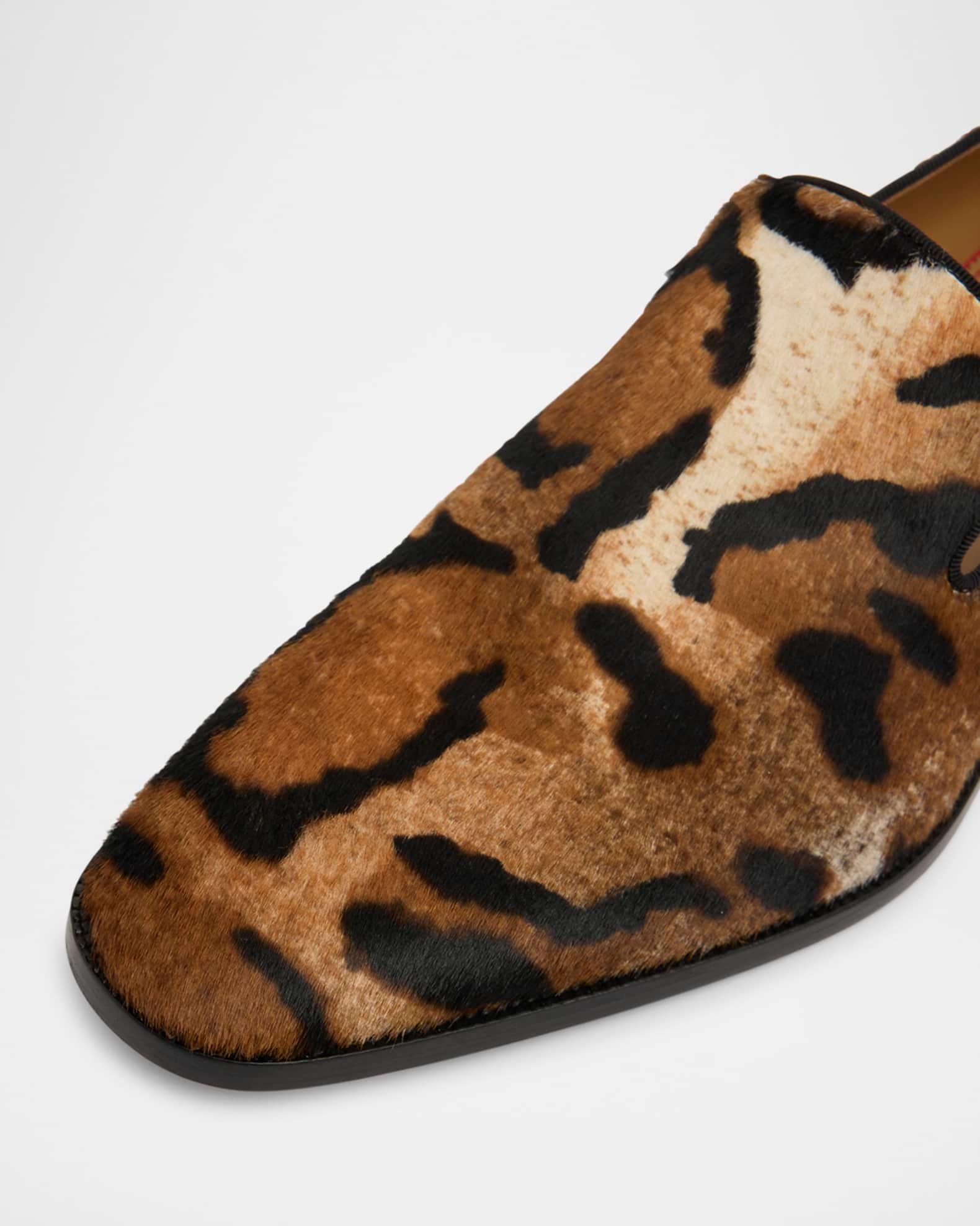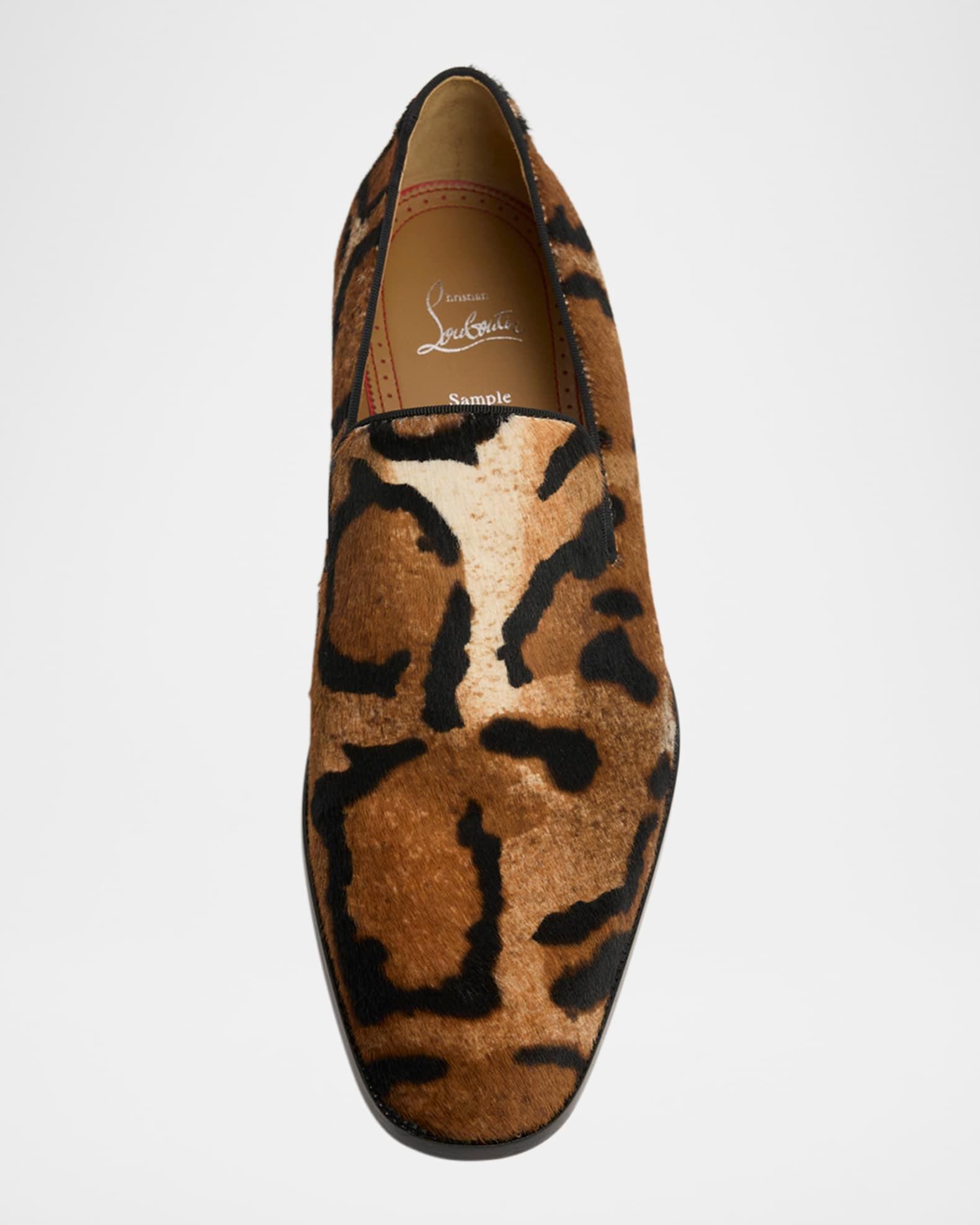 Christian Louboutin "Danny Flex" loafers in leather, polyester, and natural & dyed (Italy) calf hair Stacked heel Square toe Notched vamp Signature Loubi red leather/rubber outsole Slip-on style Made in Italy