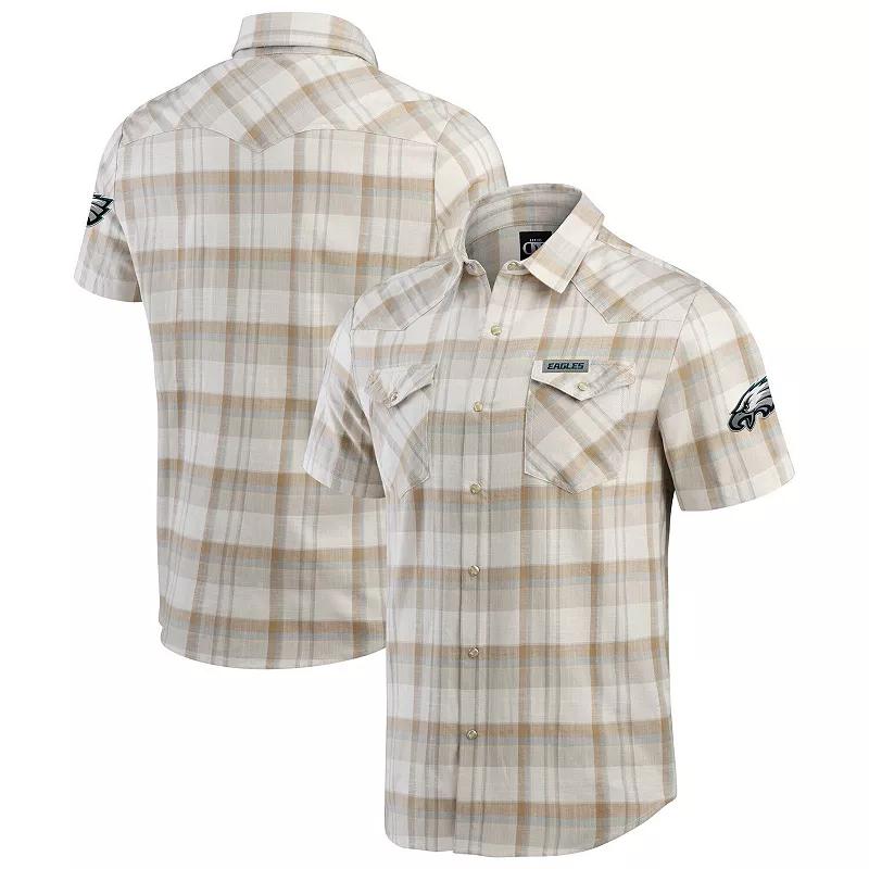 Bring classic style to every Philadelphia Eagles game day with this Darius Rucker Collection by Fanatics Plaid Full-Snap Shirt. This 100% cotton shirt features a woven plaid pattern, adding a touch of rugged style to your game day look. Two chest pockets with one-snap closures provide convenient storage, while the rounded hem allows for easy movement and styling.Bring classic style to every Philadelphia Eagles game day with this Darius Rucker Collection by Fanatics Plaid Full-Snap Shirt. This 100% cotton shirt features a woven plaid pattern, adding a touch of rugged style to your game day look. Two chest pockets with one-snap closures provide convenient storage, while the rounded hem allows for easy movement and styling.PRODUCT FEATURESBrand: Darius Rucker Collection by FanaticsFull SnapEmbroidered team logo applique on left sleeveMaterial: 100% CottonOfficially licensedImportedShort sleeveTwo chest pockets with one-snap closureRounded hemWoven team wordmark applique on left chest pocketWoven plaid pattern Size: XL. Color: Beige. Gender: male. Age Group: adult.