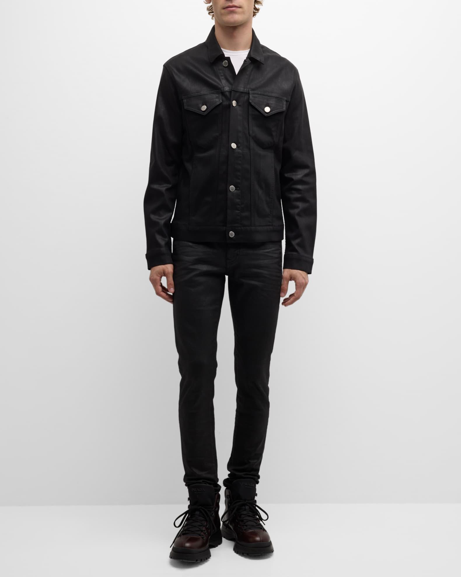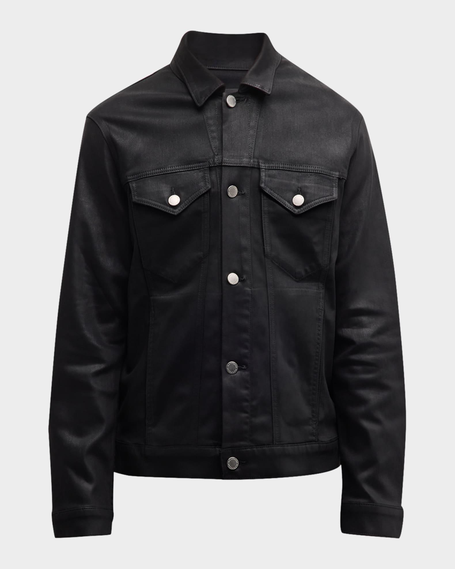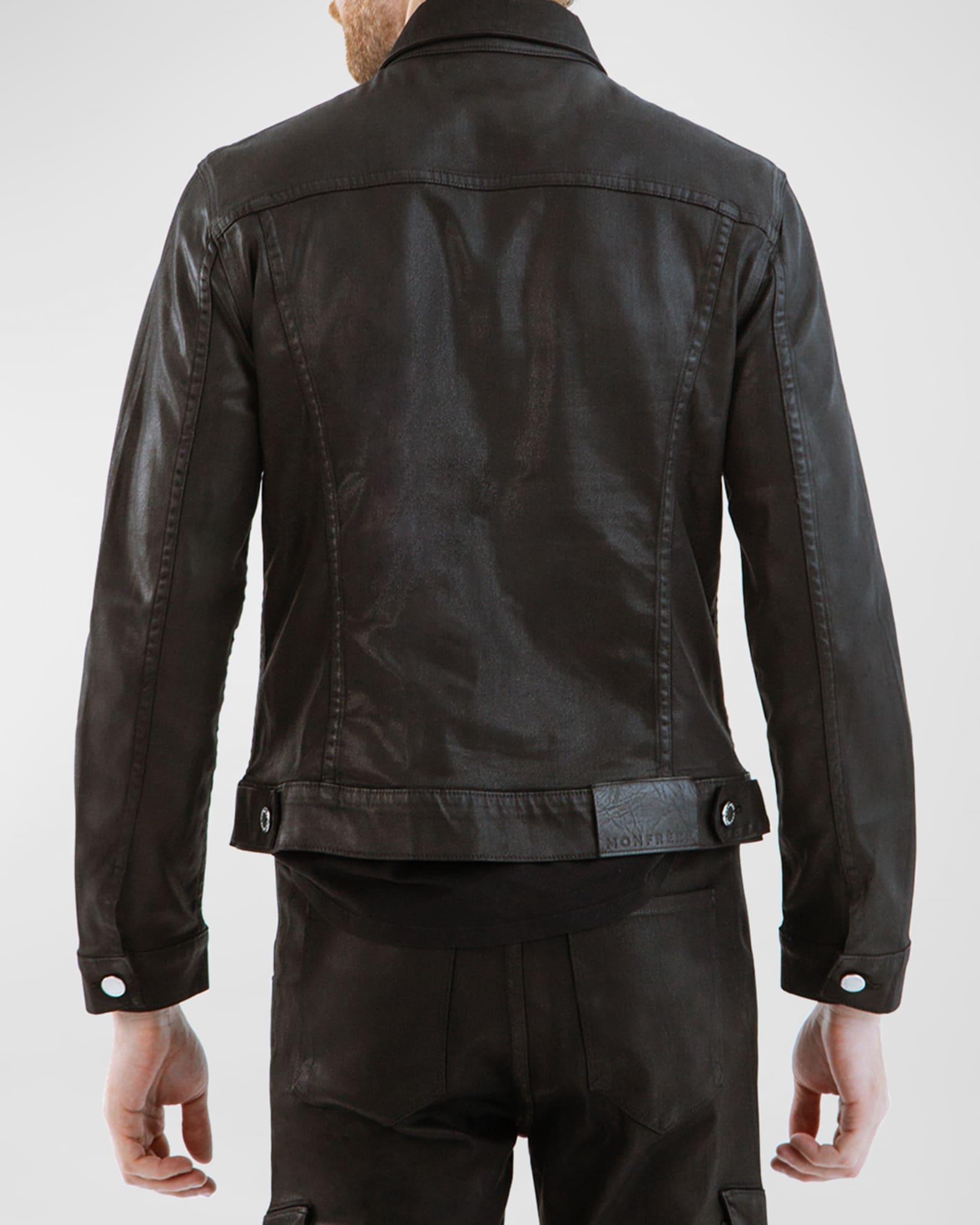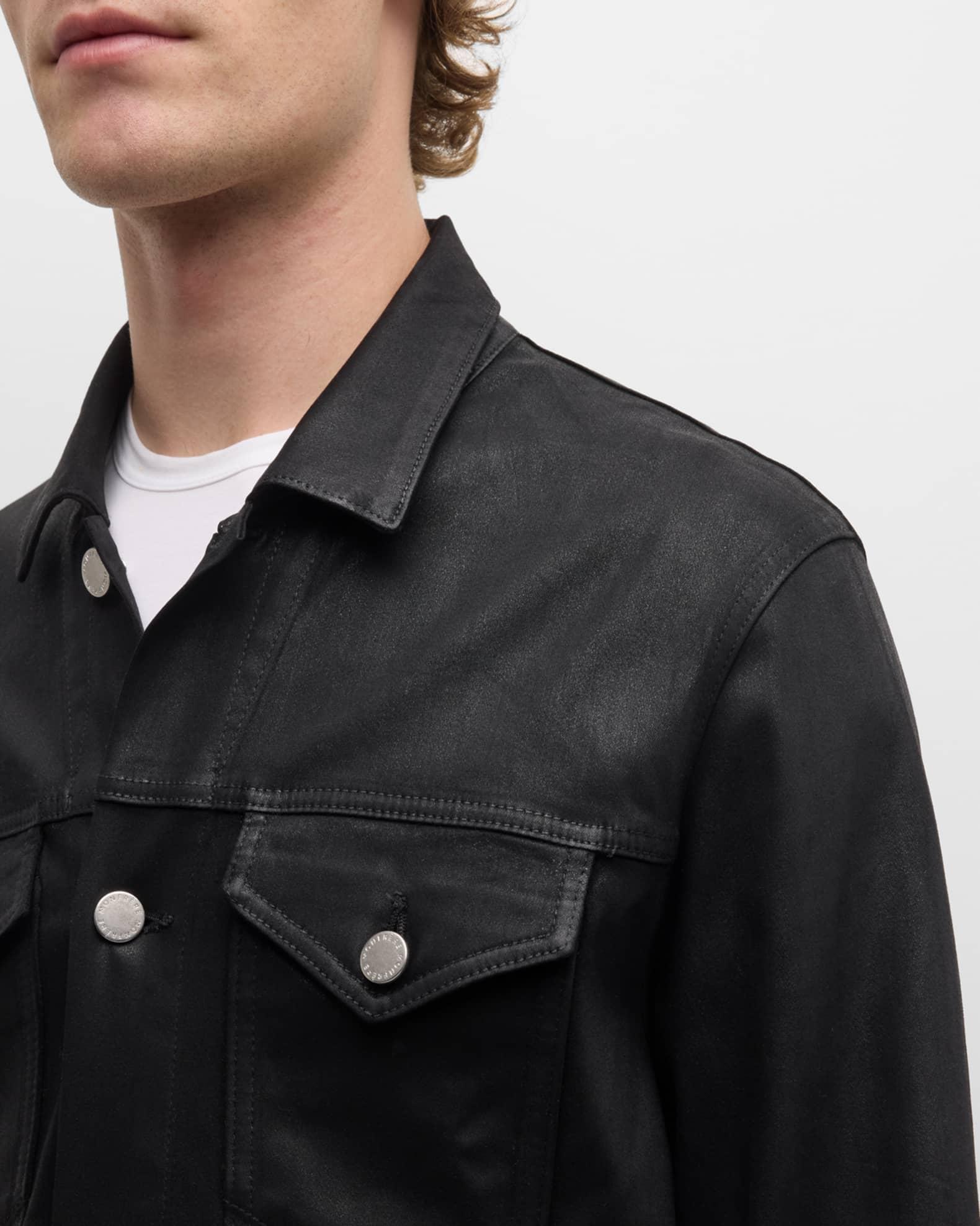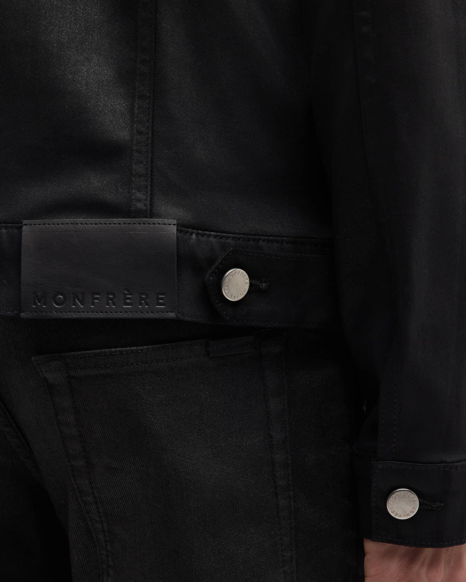 monfrere Dean trucker jacket in coated denim Spread collar; button front closure Double flap pockets at chest Side slip pockets Long sleeves Button cuffs and waist adjusters Cotton/lyocell/polyurethane Spot clean Made in USA from imported materials