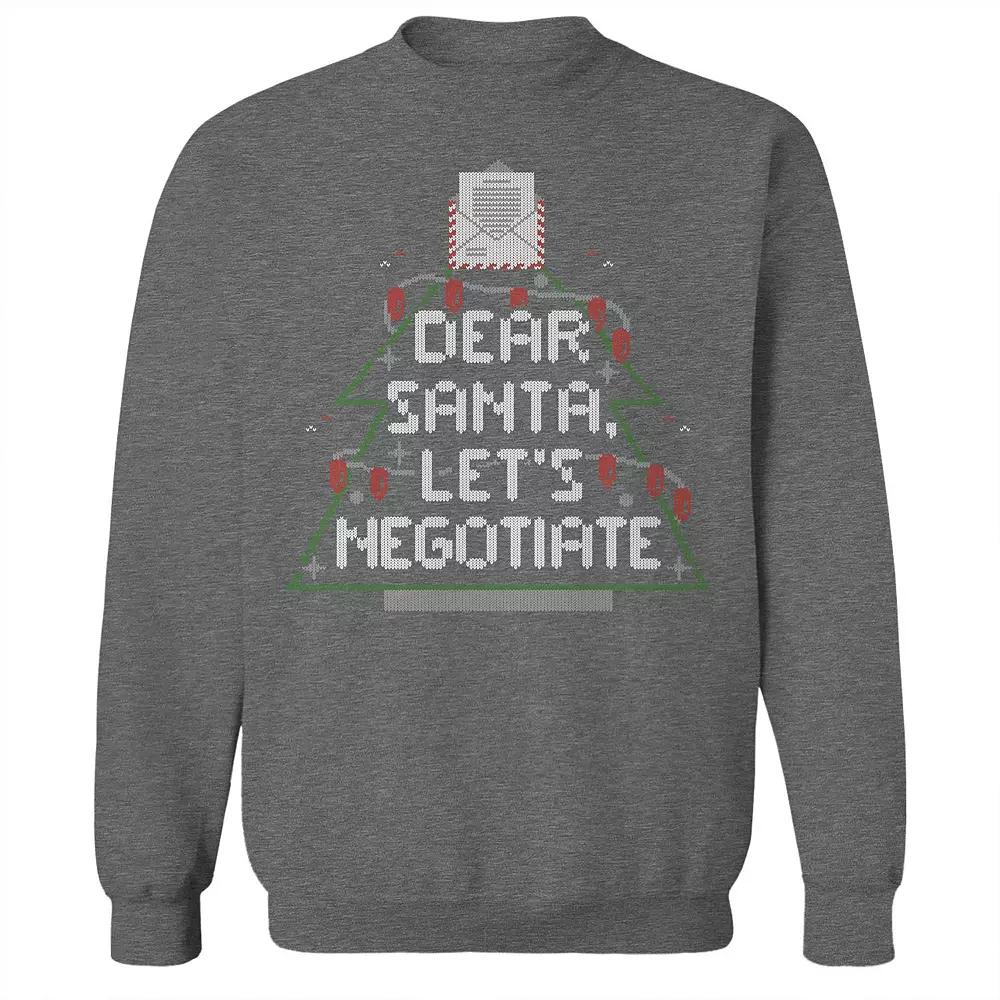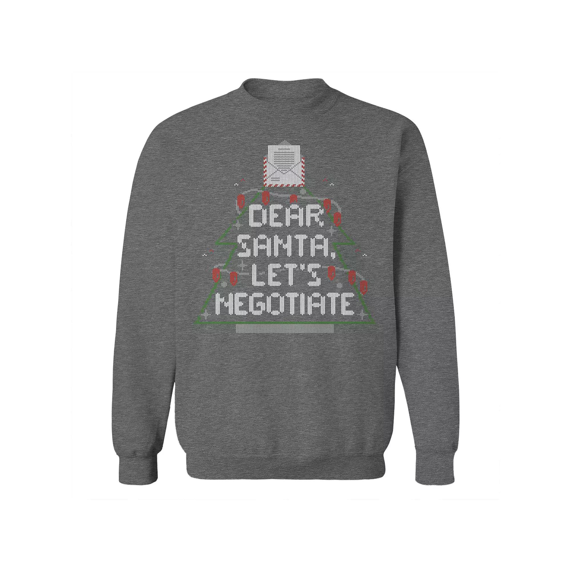 If you have an upcoming Ugly Christmas Sweater party or just want to be festive, get this Mens Dear Santa Negotiate Christmas Sweater Graphic Sweatshirt. FEATURES CrewneckFIT & SIZING ClassicFABRIC & CARE Fleece, Cotton Machine wash ImportedSETUP INFORMATION Dear Santa Negotiate Christmas Sweater Size: XXL. Color: Graphite Heather. Gender: male. Age Group: adult. Material: Fleece|Cotton.