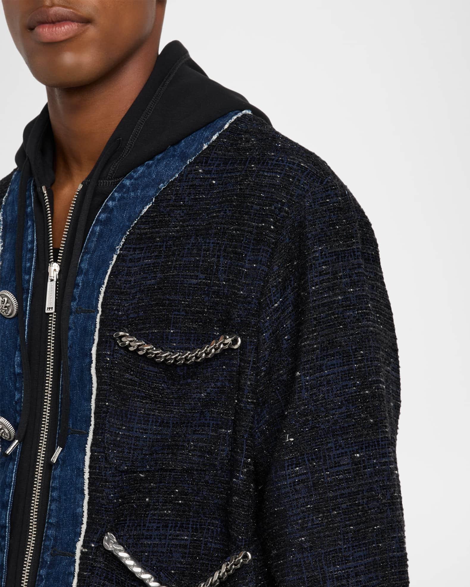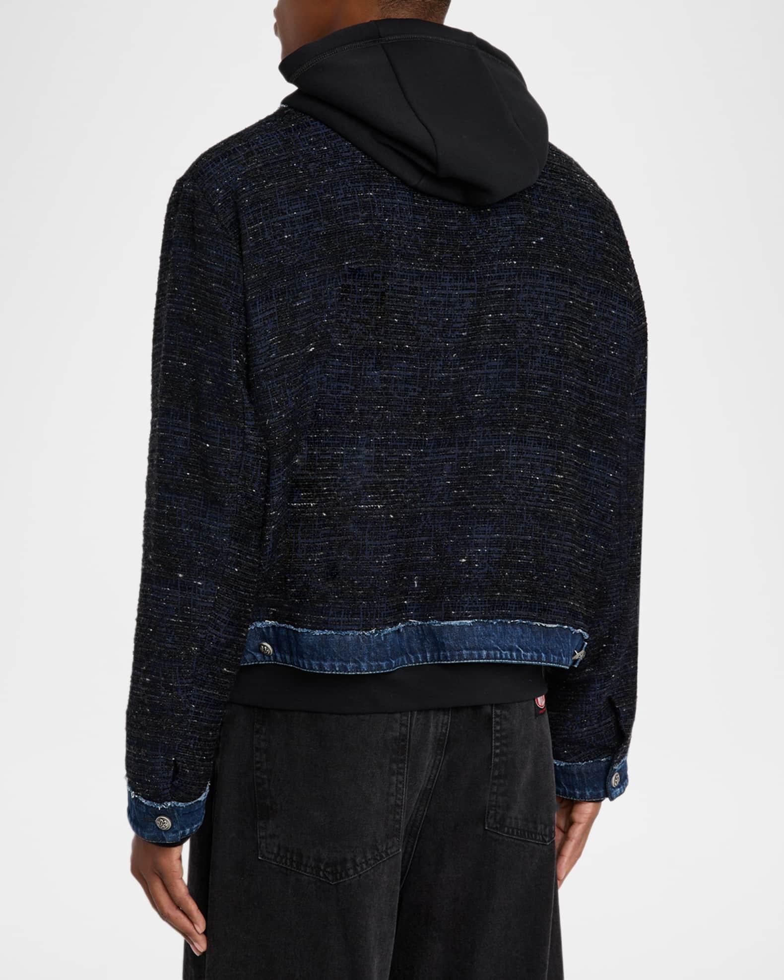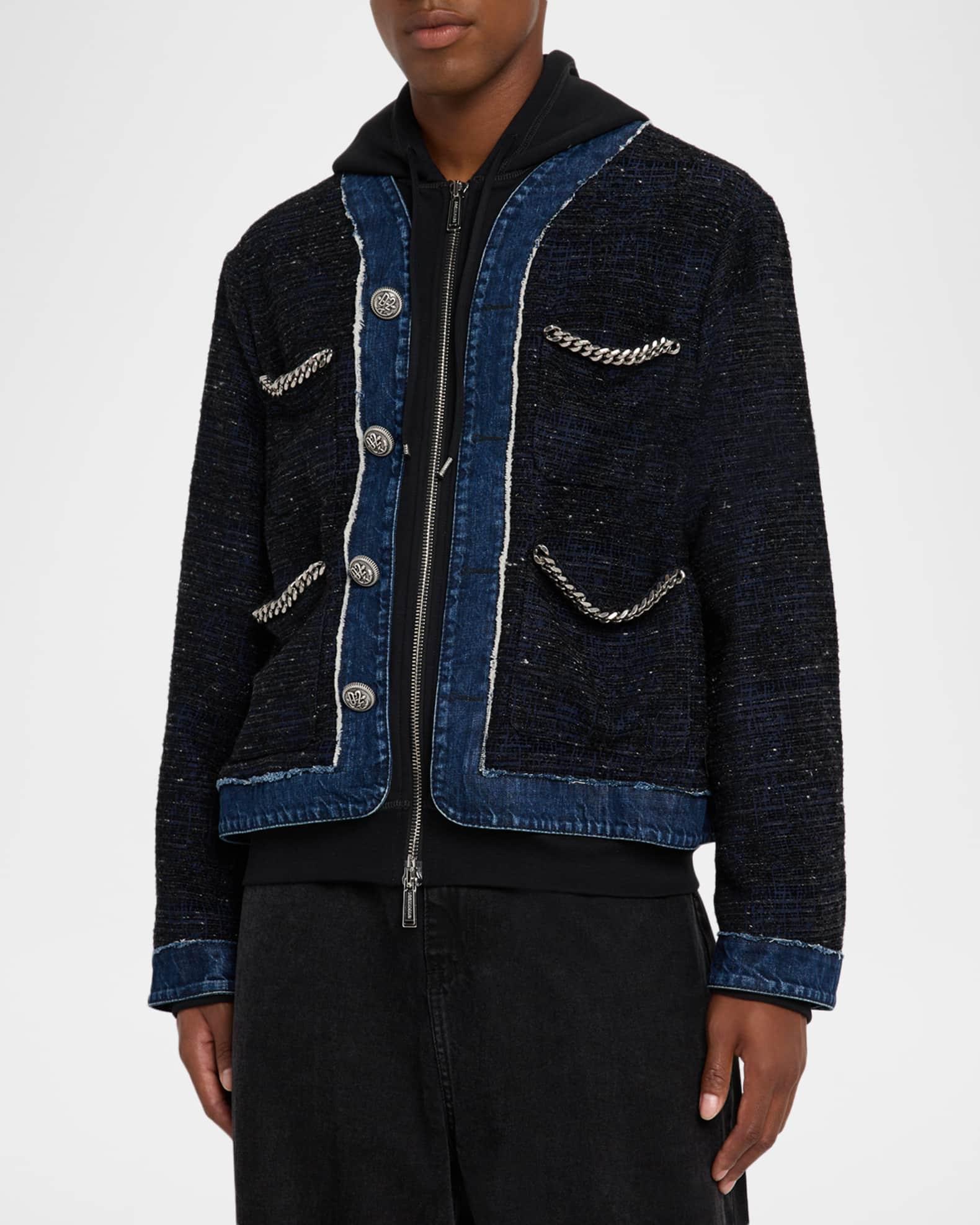 Dsquared2 bouclé jacket accented with subtle metallic fibers and denim trim Four patch pockets trimmed with silvertone chains Drawstring hoodie insert Full-zip front Long sleeves Buttoned cuffs Hem adjusters Polyester/viscose Dry clean, hand wash Made in Italy