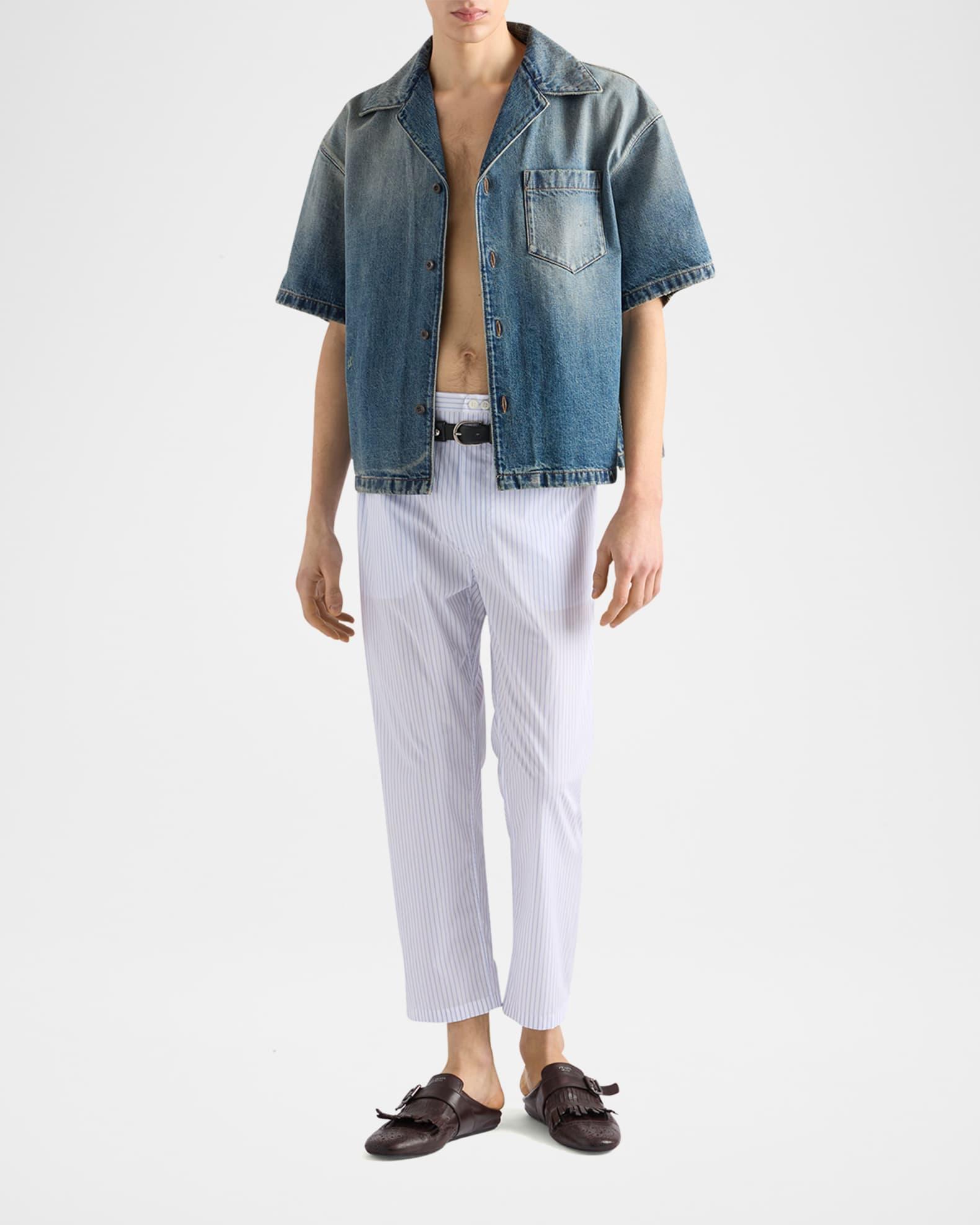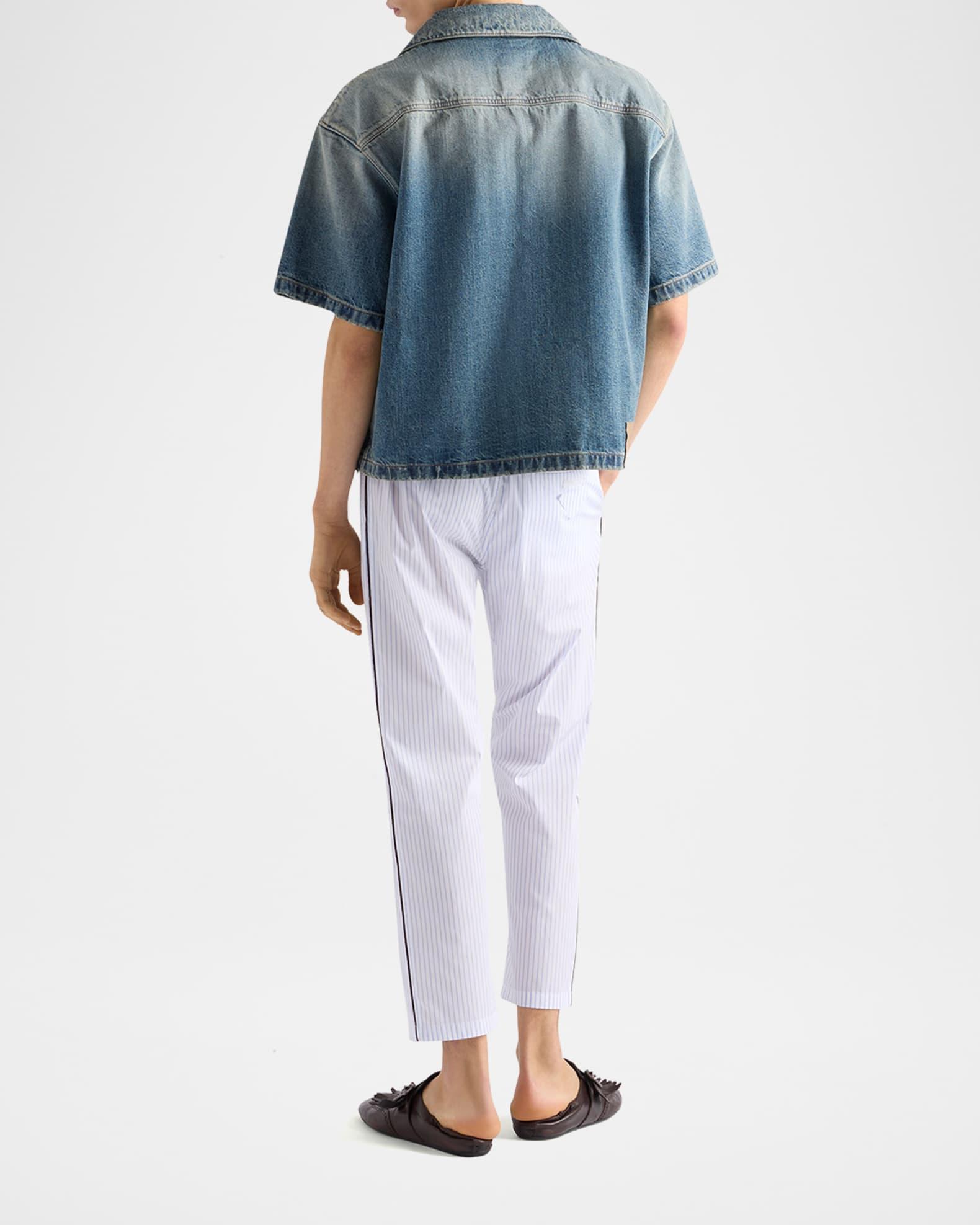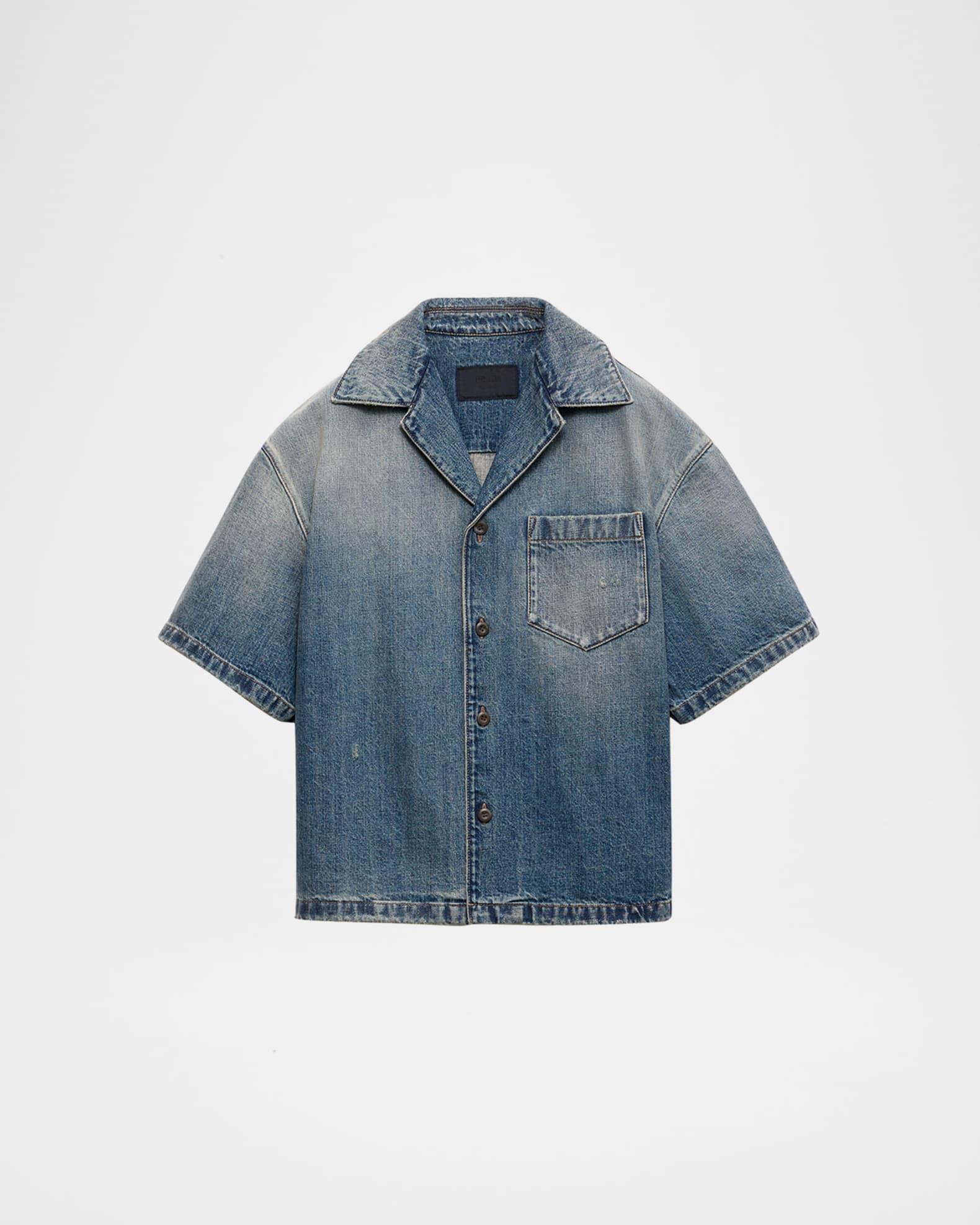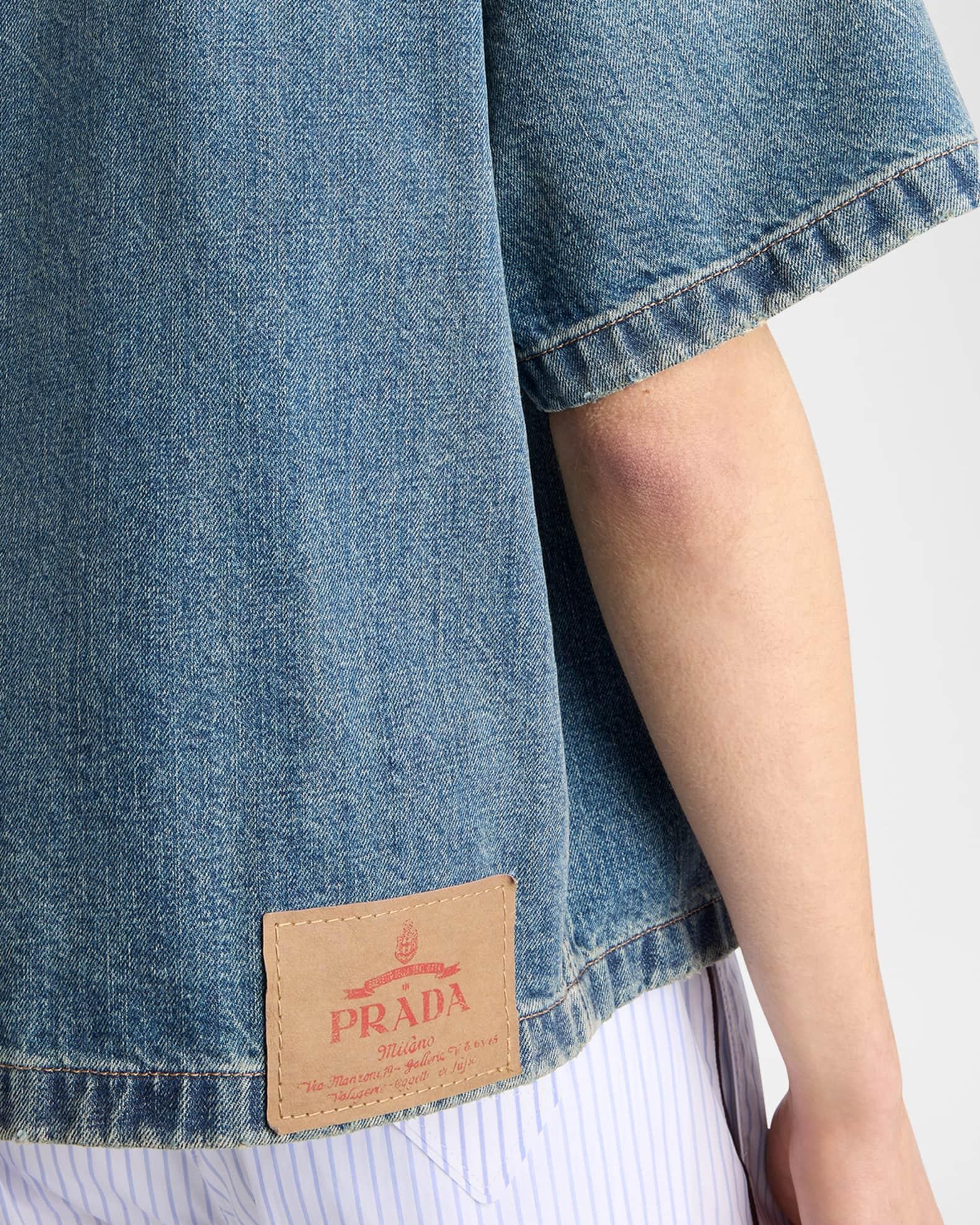 Prada bowling shirt in faded denim for structure and depth with a distinctive, sophisticated design Label with archive logo on the back hem Notch collar Button front Chest patch pocket Short sleeves Boxy fit Cotton Hand wash inside out, separately Imported