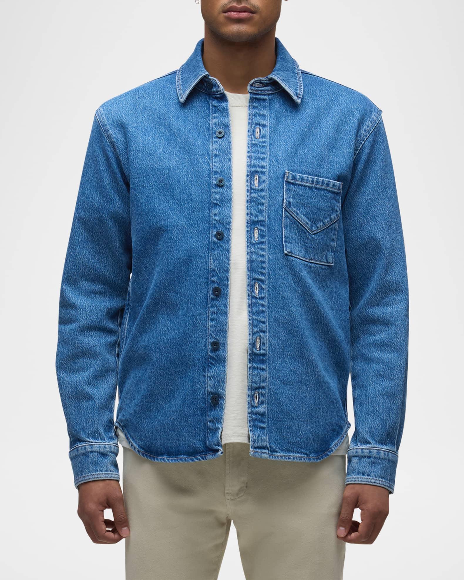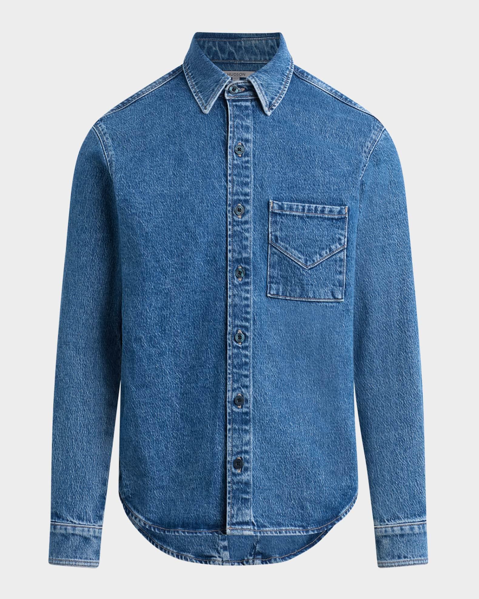 Hudson sport shirt in medium-wash denim with stone washing and bleaching for an elevated look Straight collar Branded button closure Chest patch pocket Long sleeves Classic fit Signature back "V" seam Yoked back shoulders Shirttail hem Cotton/elasterell-p/elastane Machine wash cold, wash inside out Made in Mexico