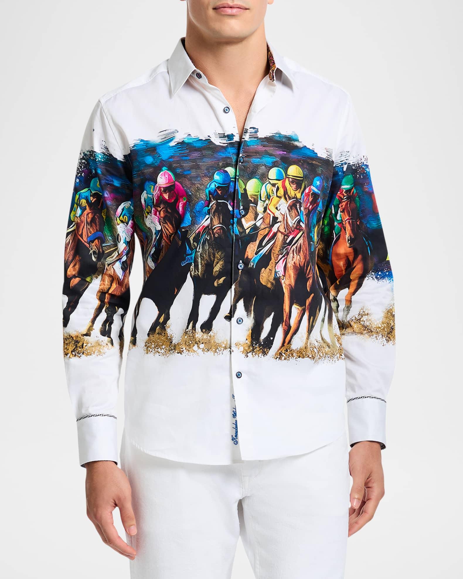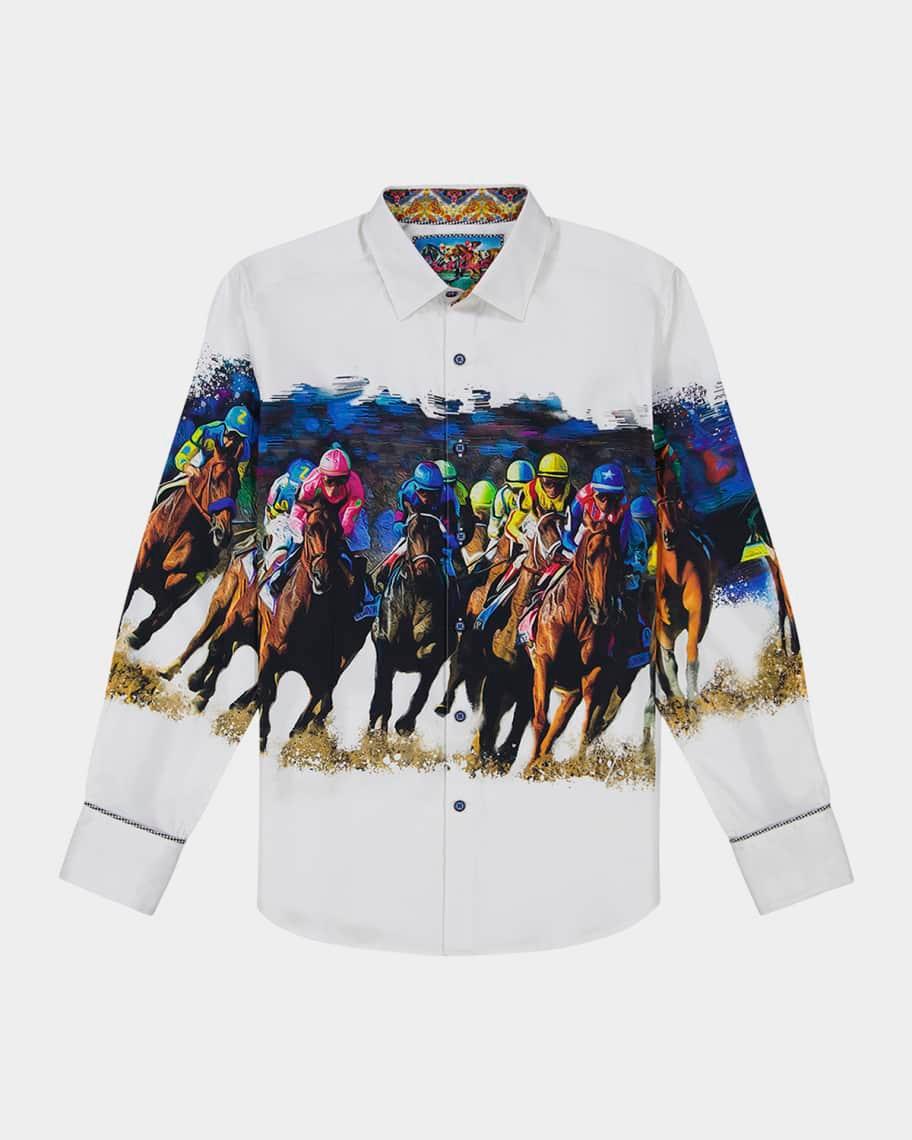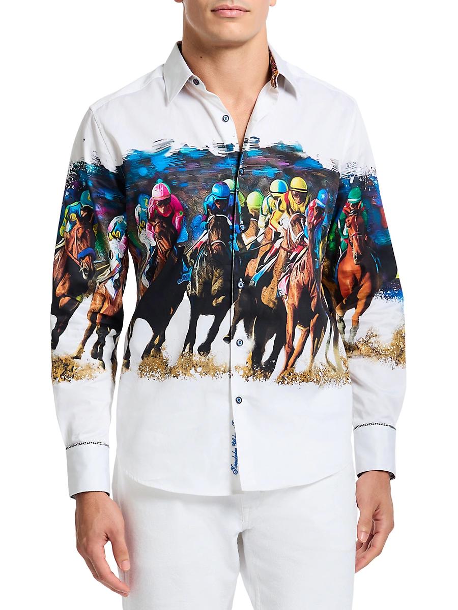 The Derby Day shirt from Robert Graham highlights an intricate equestrian motif, featuring colorful jockeys racing toward the finish line. A spread collar, long sleeves with buttoned barrel cuffs, and a shirttail hem lend traditional structure to this style. Spread collar Long sleeves, buttoned barrel cuffs Shirttail hem Front button closure 97% cotton/3% spandex Machine wash Imported SIZE & FIT Classic fit About 34.5 from shoulder to hem Model measurements: 62 tall, 40 chest, 31 waist Model is wearing a US size Medium. Mens Modern Coll & Outer - Contemp Classic Collecti > Robert Graham > Saks Fifth Avenue > Barneys. Robert Graham. Color: White. Size: XXL.