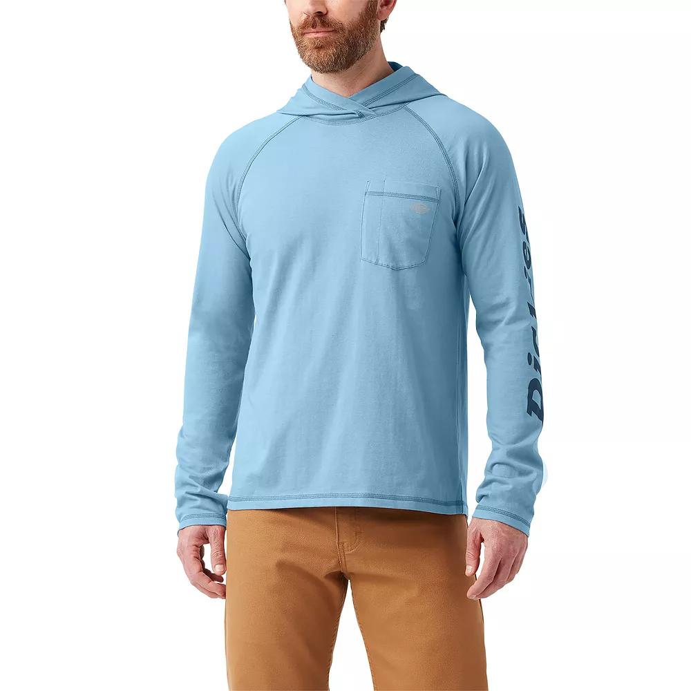 No matter how hard you work, this mens Dickies cooling performance top will work as hard as you do. No matter how hard you work, this mens Dickies cooling performance top will work as hard as you do. Attached hood UPF 40+ sun protection Moisture-wicking technology absorbs sweat to keep you cool & dry Temp-iQ cooling controls your core body temperature Thumbholes Long sleeves 1-pocketFABRIC & CARE Cotton, polyester Machine wash Imported Size: XL. Color: Light Blue. Gender: male. Age Group: adult. Material: Polyester|Cotton.