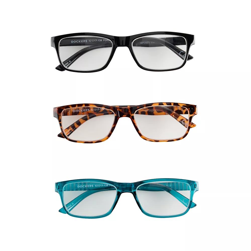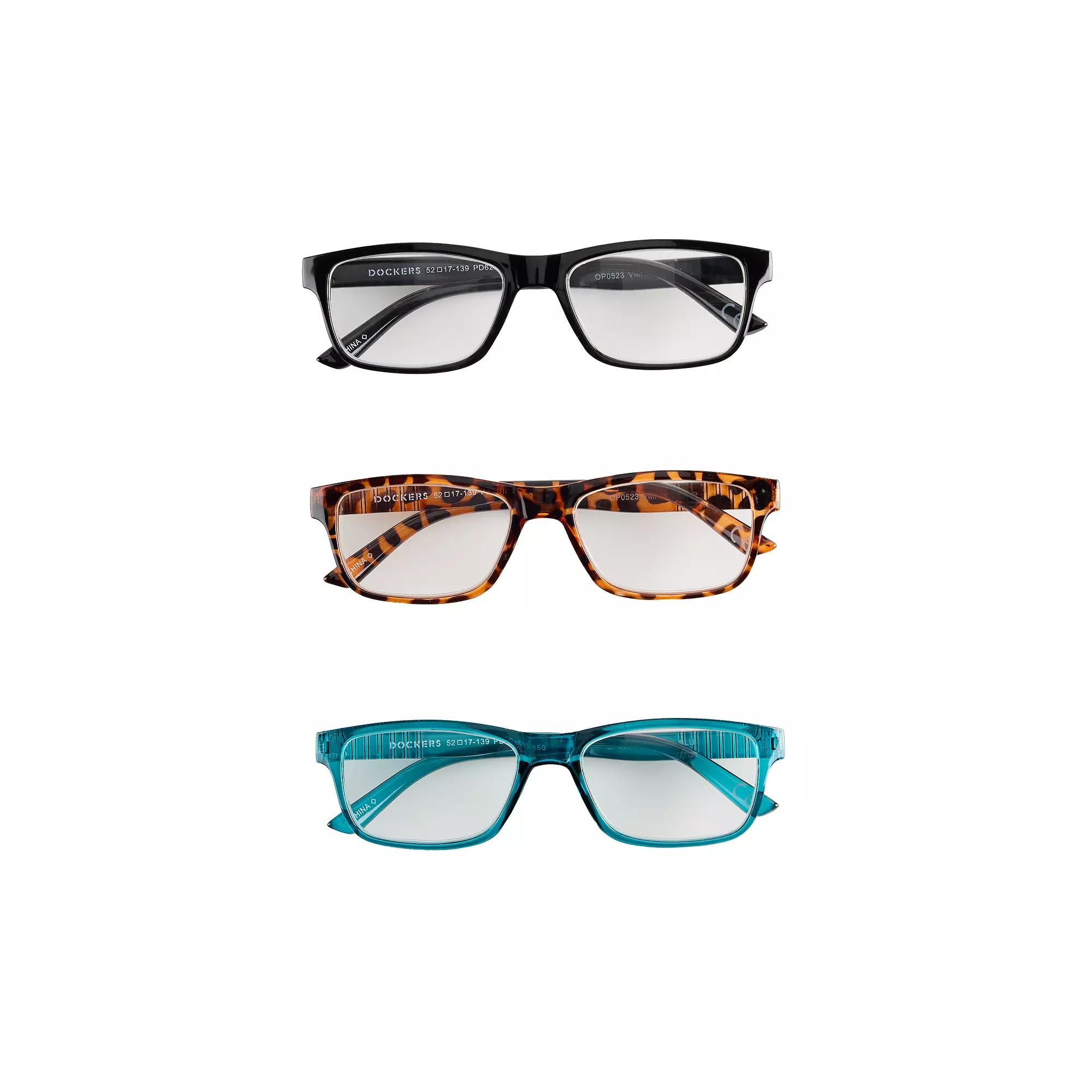 Fashion and function combine with these mens Dockers 3-pack 52mm square reading glasses. Fashion and function combine with these mens Dockers 3-pack 52mm square reading glasses. FEATURES Includes 3 pairs of reading glasses Frame material: plastic Standard hinges Lens material: acrylic Model no. 5015661 ImportedFIT DETAILS How do I find my frame size? Eye/bridge/temple measurement: 52 mm/ 17 mm/ 140 mm Silhouette: square WARNING: This product may contain a chemical known to the state of California to cause cancer, birth defects or other reproductive harm. For more information go to www.P65Warnings.ca.gov. Size: +2.5. Color: Blacktort Blue. Gender: male. Age Group: adult.
